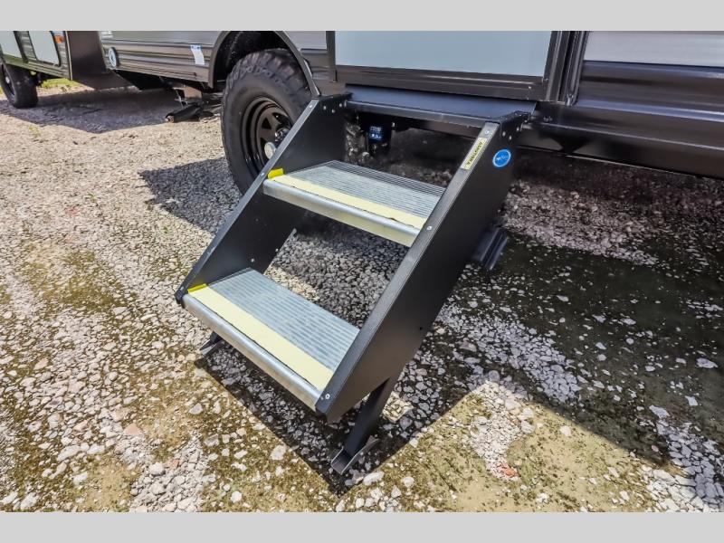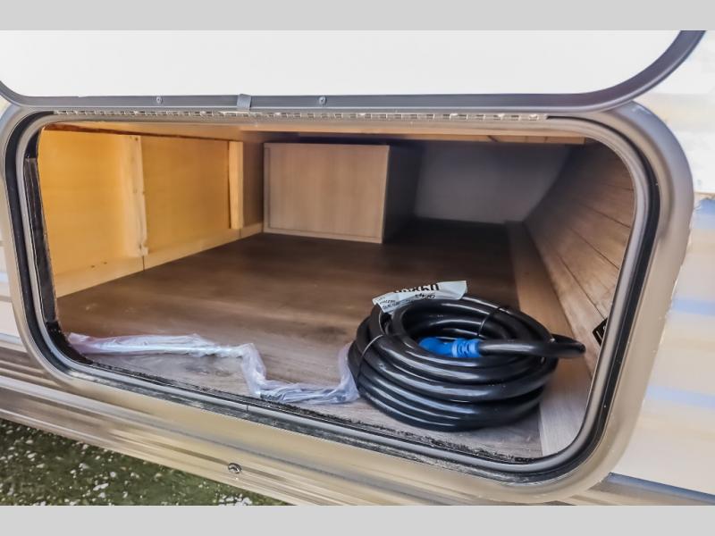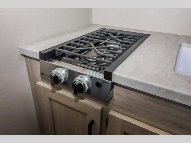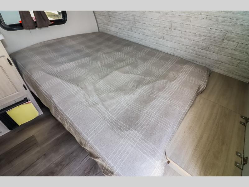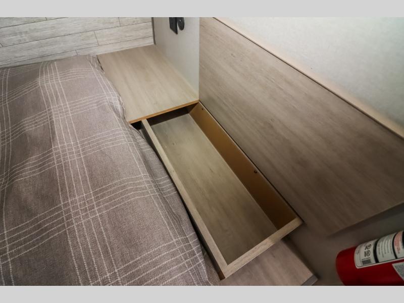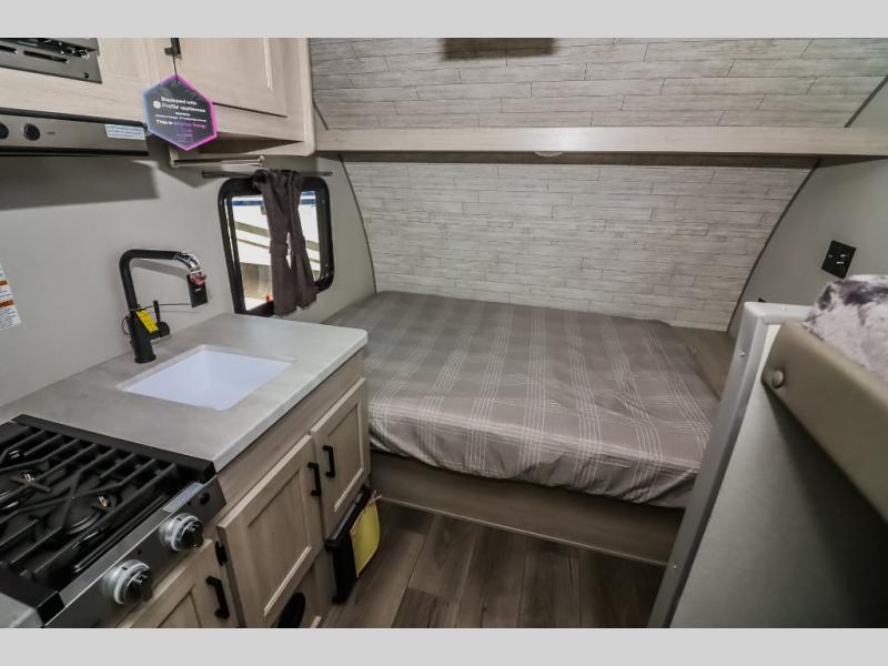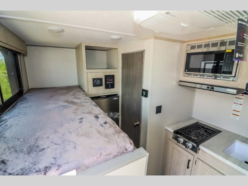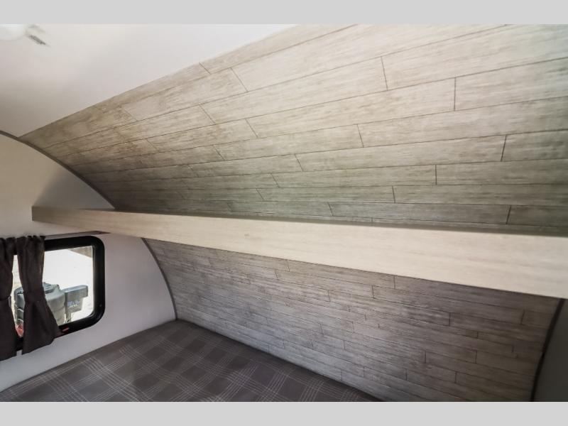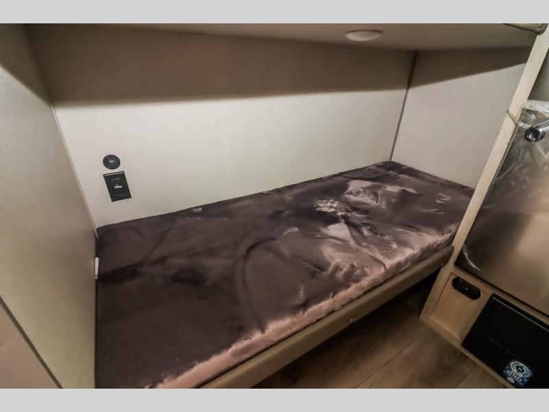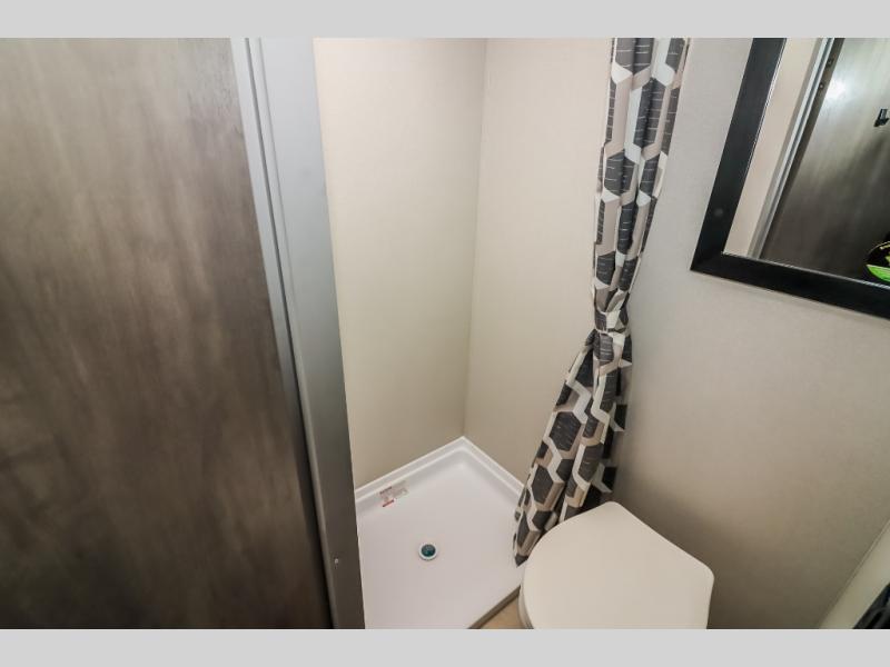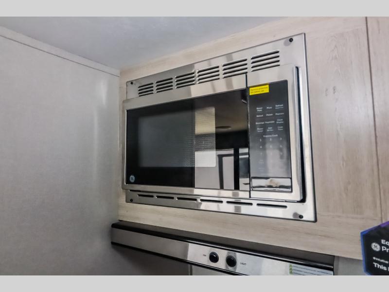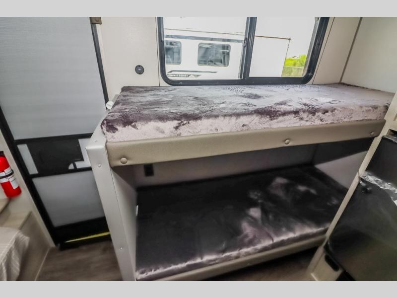 Lightweight camping is easier than you think with this travel trailer in tow! The front 54" x 74" queen bed will provide a great night's rest each night, while the little ones or your guests take the bunk beds. There is a handy shelf above the front bed for your belongings plus additional bedroom storage. A private bath includes a 24" x 32" shower and a toilet with a mirror behind it so you can freshen up each day. You'll also find a two burner cooktop and microwave oven to make meals each day plus a 3.3 cu. ft. 12V refrigerator for food storage!