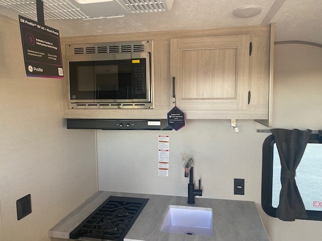 Lightweight camping is easier than you think with this travel trailer in tow! The front 54" x 74" queen bed will provide a great night's rest each night, while the little ones or your guests take the bunk beds. There is a handy shelf above the front bed for your belongings plus additional bedroom storage. A private bath includes a 24" x 32" shower and a toilet with a mirror behind it so you can freshen up each day. You'll also find a two burner cooktop and microwave oven to make meals each day plus a 3.3 cu. ft. 12V refrigerator for food storage!