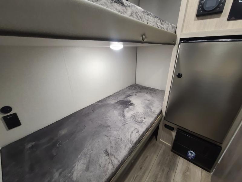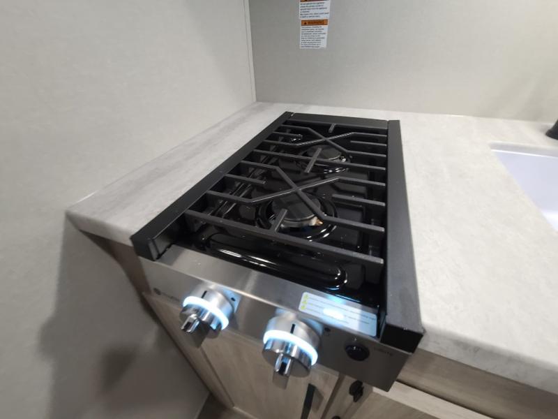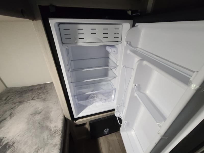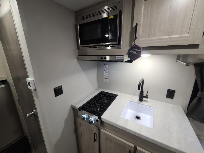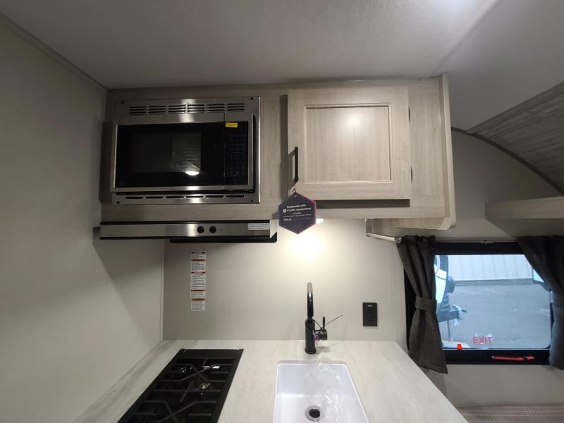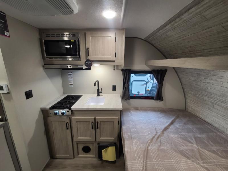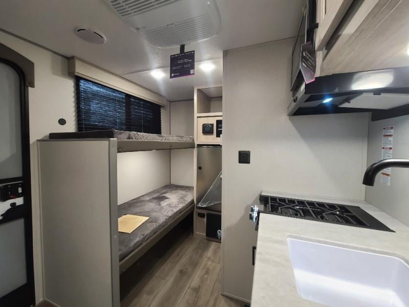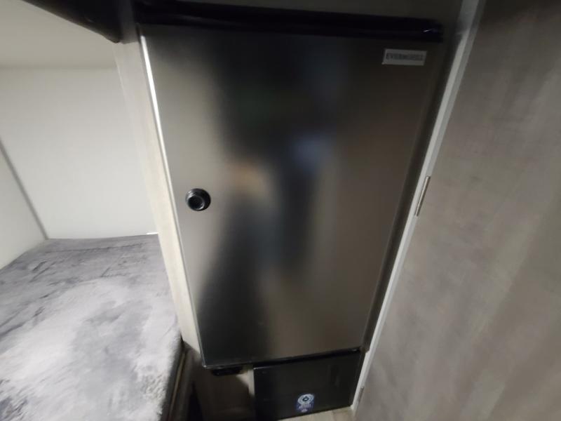 Lightweight camping is easier than you think with this travel trailer in tow! The front 54" x 74" queen bed will provide a great night's rest each night, while the little ones or your guests take the bunk beds. There is a handy shelf above the front bed for your belongings plus additional bedroom storage. A private bath includes a 24" x 32" shower and a toilet with a mirror behind it so you can freshen up each day. You'll also find a two burner cooktop and microwave oven to make meals each day plus a 3.3 cu. ft. 12V refrigerator for food storage!