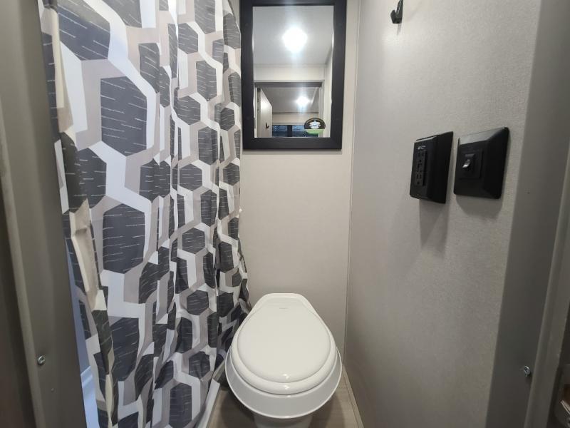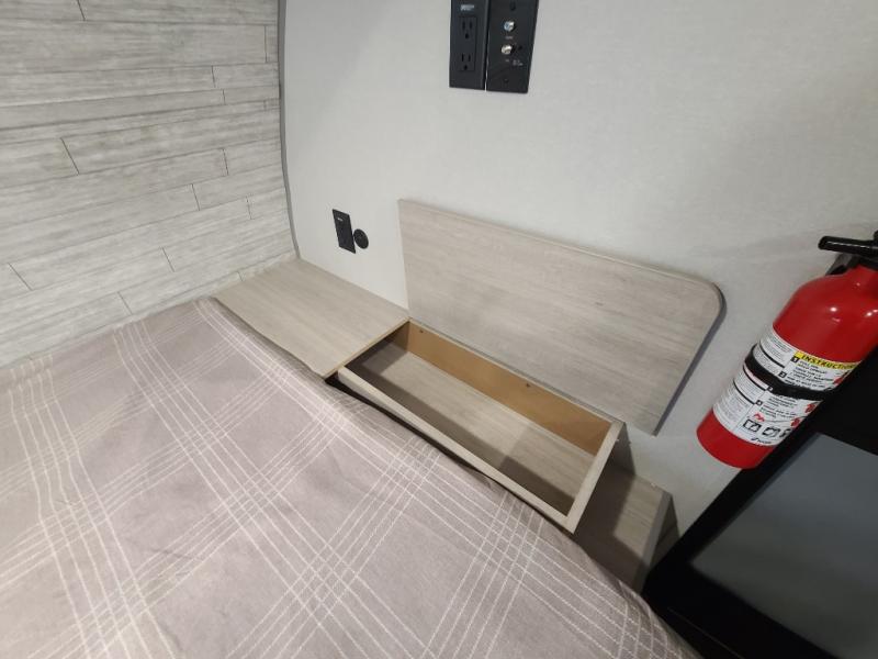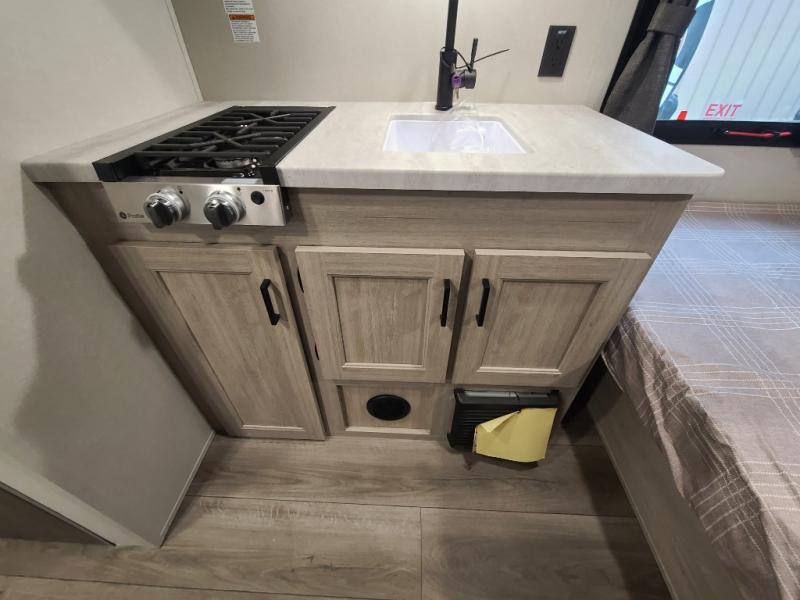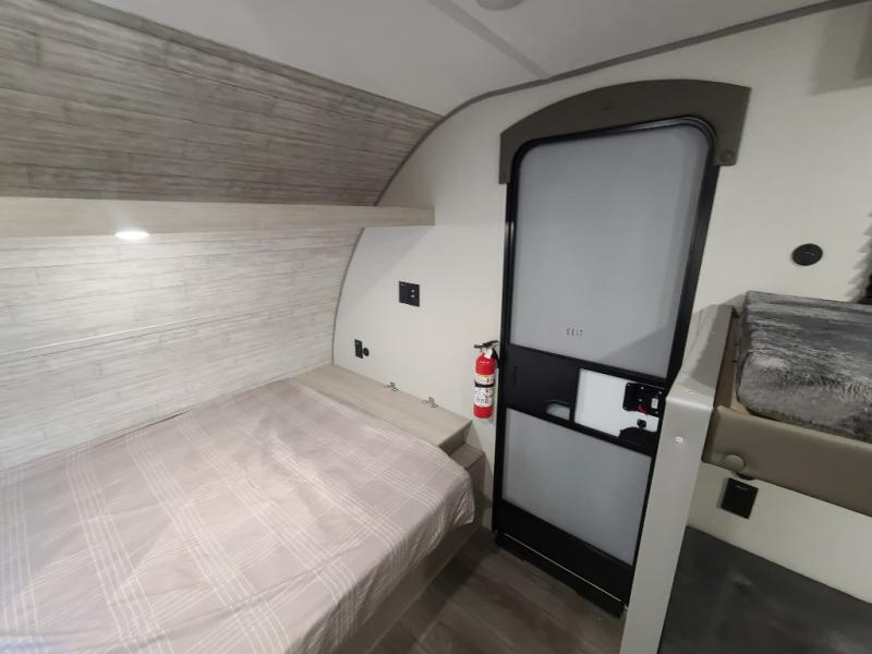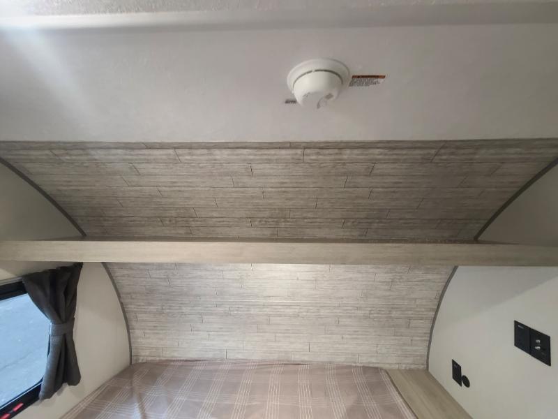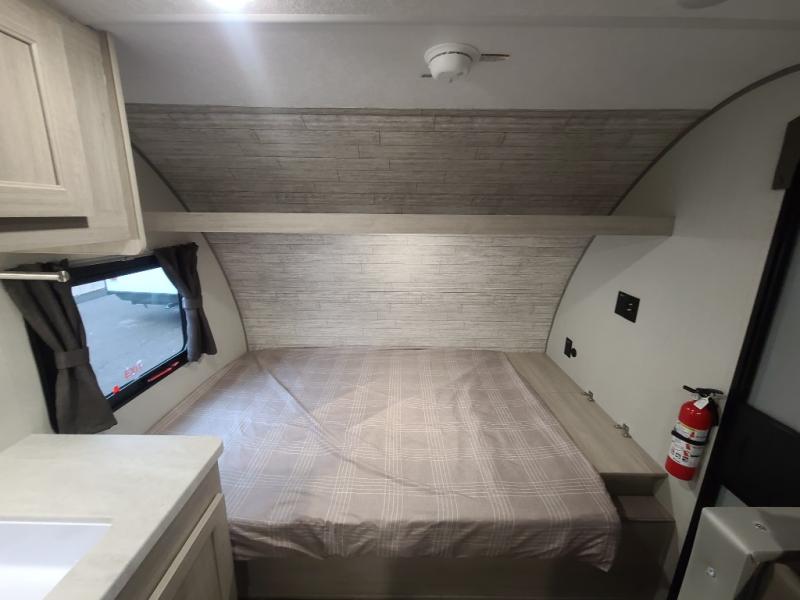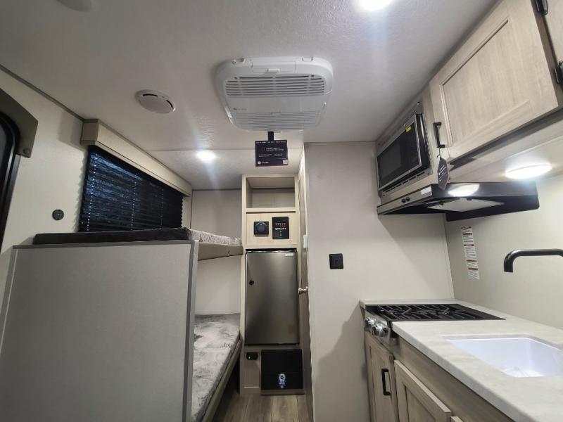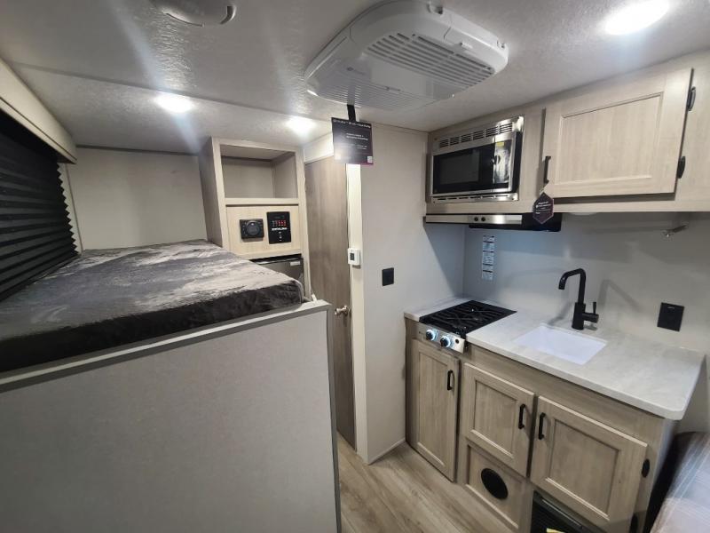 Lightweight camping is easier than you think with this travel trailer in tow! The front 54" x 74" queen bed will provide a great night's rest each night, while the little ones or your guests take the bunk beds. There is a handy shelf above the front bed for your belongings plus additional bedroom storage. A private bath includes a 24" x 32" shower and a toilet with a mirror behind it so you can freshen up each day. You'll also find a two burner cooktop and microwave oven to make meals each day plus a 3.3 cu. ft. 12V refrigerator for food storage!