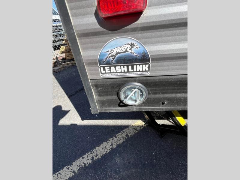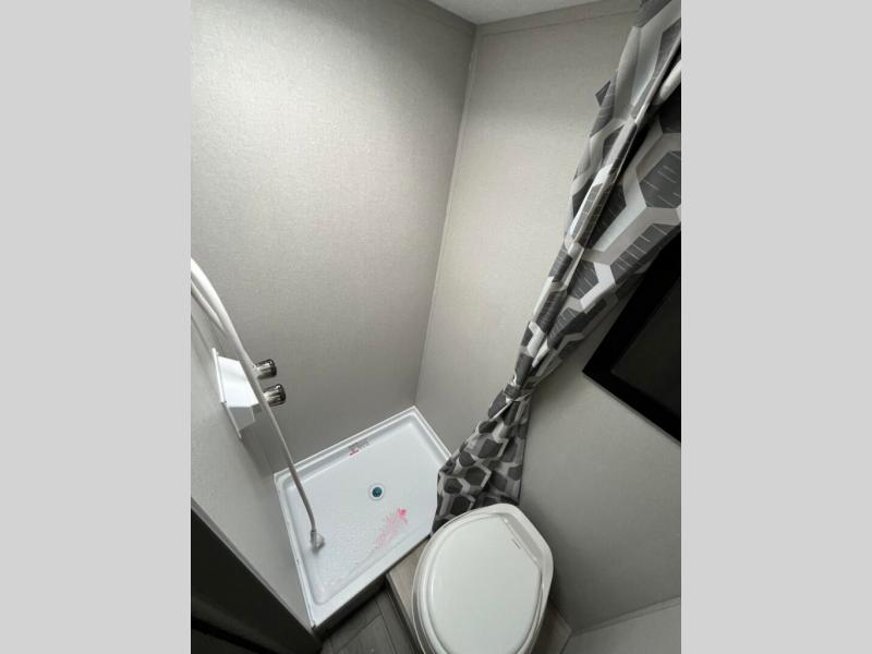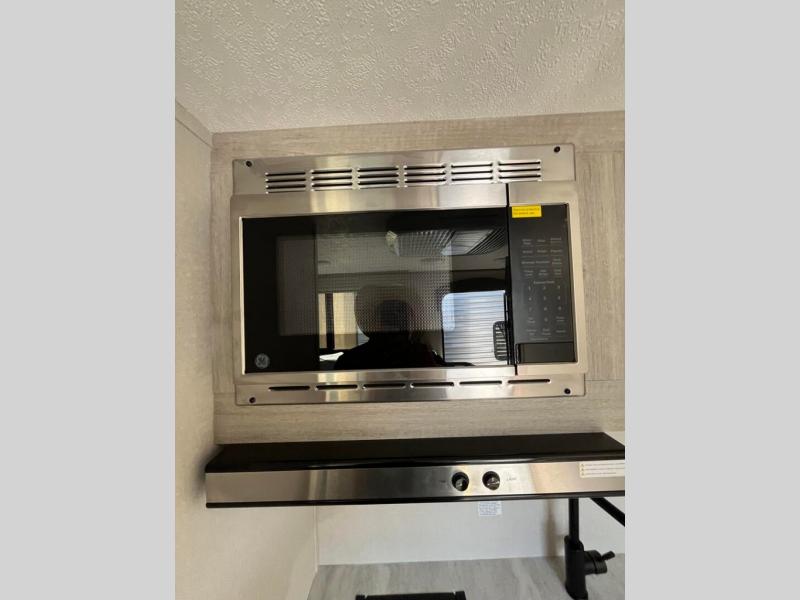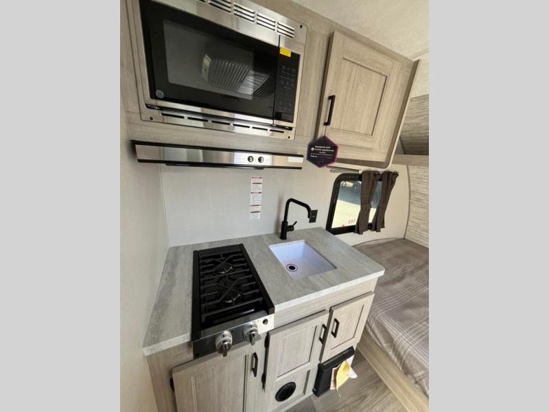 Lightweight camping is easier than you think with this travel trailer in tow! The front 54" x 74" queen bed will provide a great night's rest each night, while the little ones or your guests take the bunk beds. There is a handy shelf above the front bed for your belongings plus additional bedroom storage. A private bath includes a 24" x 32" shower and a toilet with a mirror behind it so you can freshen up each day. You'll also find a two burner cooktop and microwave oven to make meals each day plus a 3.3 cu. ft. 12V refrigerator for food storage!