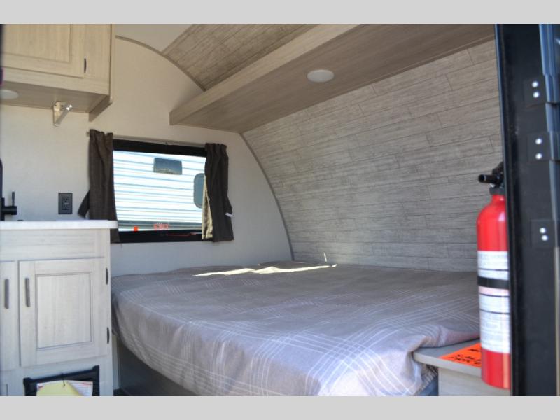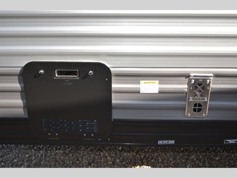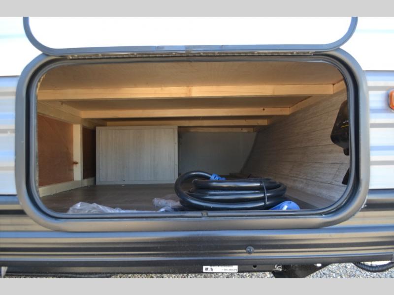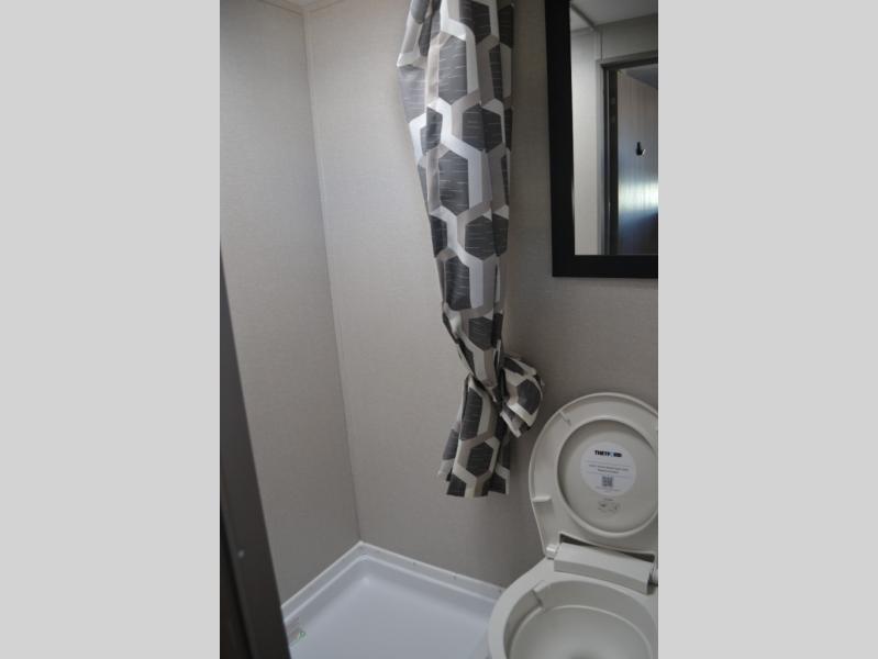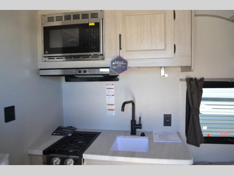 Lightweight camping is easier than you think with this travel trailer in tow! The front 54" x 74" queen bed will provide a great night's rest each night, while the little ones or your guests take the bunk beds. There is a handy shelf above the front bed for your belongings plus additional bedroom storage. A private bath includes a 24" x 32" shower and a toilet with a mirror behind it so you can freshen up each day. You'll also find a two burner cooktop and microwave oven to make meals each day plus a 3.3 cu. ft. 12V refrigerator for food storage!