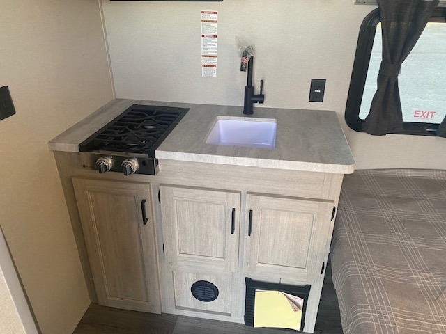 Lightweight camping is easier than you think with this travel trailer in tow! The front 54" x 74" queen bed will provide a great night's rest each night, while the little ones or your guests take the bunk beds. There is a handy shelf above the front bed for your belongings plus additional bedroom storage. A private bath includes a 24" x 32" shower and a toilet with a mirror behind it so you can freshen up each day. You'll also find a two burner cooktop and microwave oven to make meals each day plus a 3.3 cu. ft. 12V refrigerator for food storage!