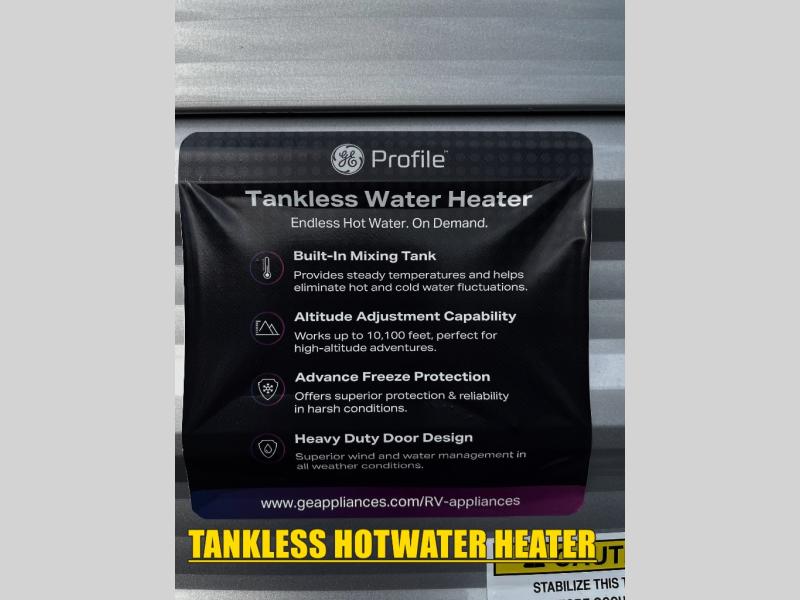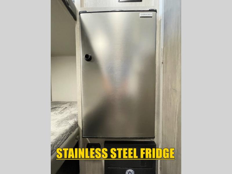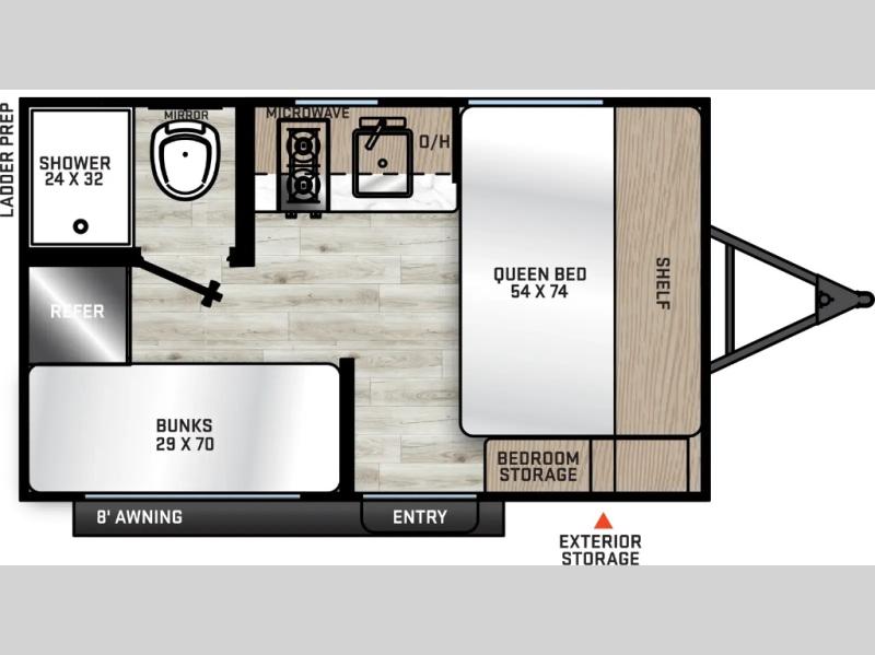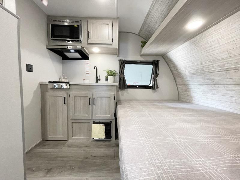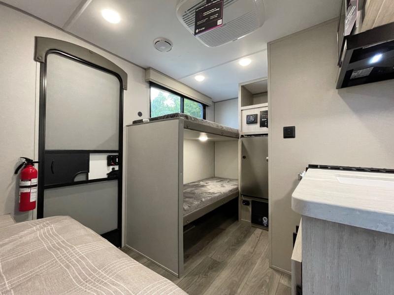 Lightweight camping is easier than you think with this travel trailer in tow! The front 54" x 74" queen bed will provide a great night's rest each night, while the little ones or your guests take the bunk beds. There is a handy shelf above the front bed for your belongings plus additional bedroom storage. A private bath includes a 24" x 32" shower and a toilet with a mirror behind it so you can freshen up each day. You'll also find a two burner cooktop and microwave oven to make meals each day plus a 3.3 cu. ft. 12V refrigerator for food storage!