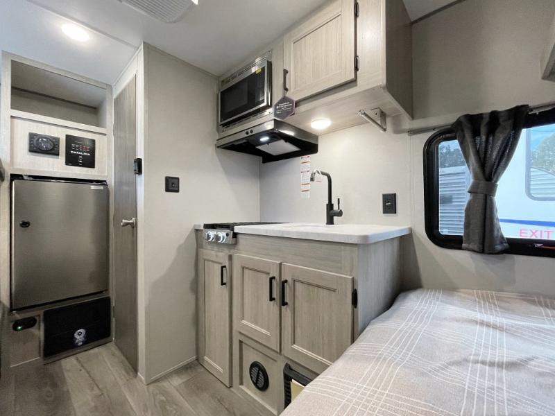 With any Catalina Summit Series 7' by Coachmen RV, you can create an easier adventure with the versatility and simplicity of the shorter lengths and lighter weights! Each includes a premium exterior graphics package, a smooth HD aluminum radius front, and EZ lube axles with leaf spring suspension. The exterior offers a heavy duty standard tongue jack, a diamond plate rock guard to protect against road debris, exterior RG-6 coax cabling and satellite prep, rear view camera prep, and flush mount baggage doors with radius corners for your outdoor gear. Inside, you will enjoy a premium JBL interior speaker, USB charging ports, seamless Thermofoil countertops throughout, a deep basin farm style sink for easy cleanup, and GE kitchen appliances. It's time to choose an affordable and maneuverable single axle trailer today!