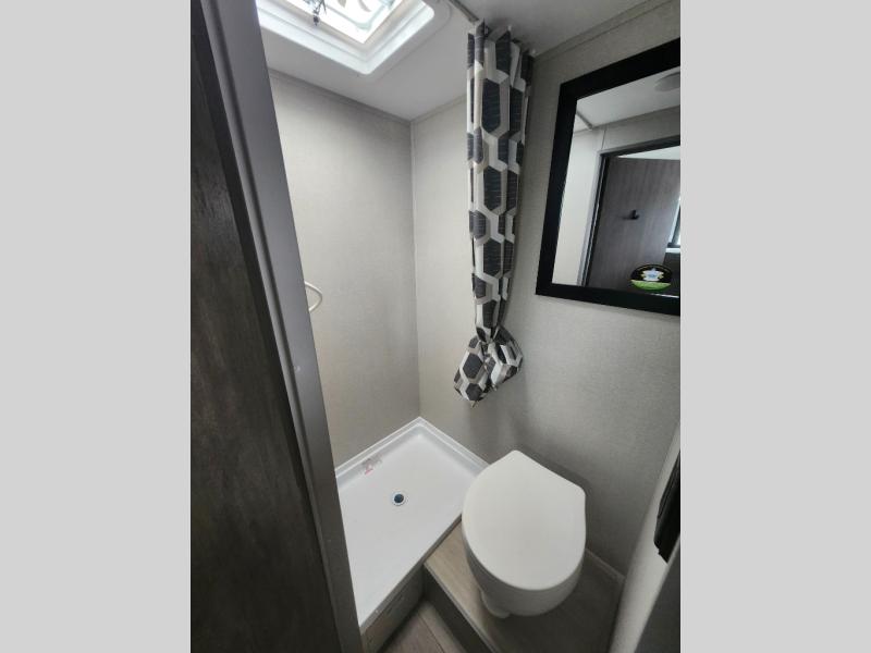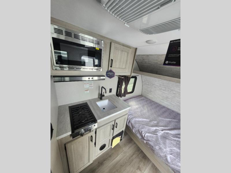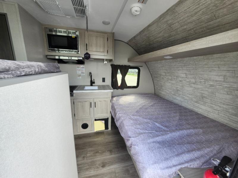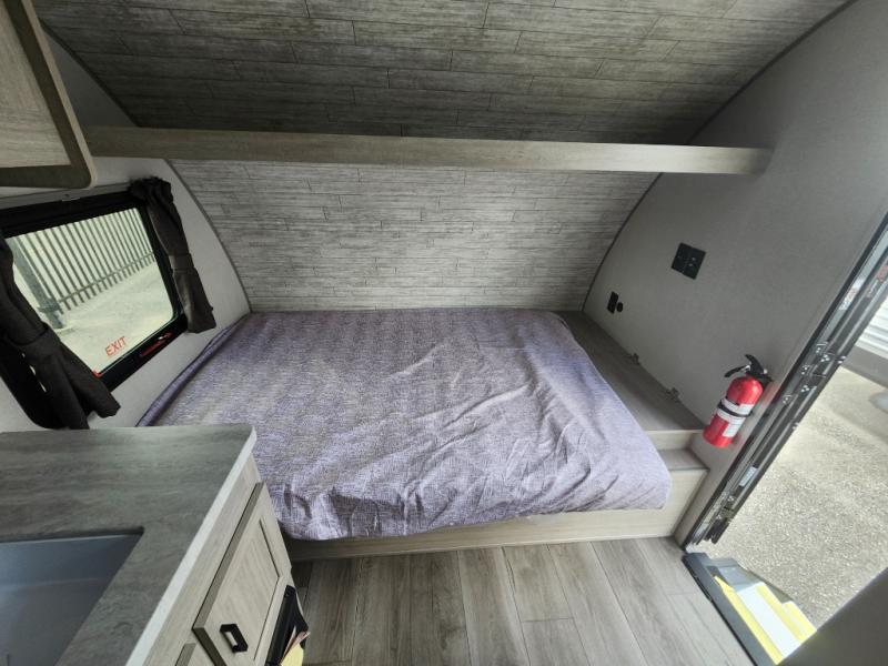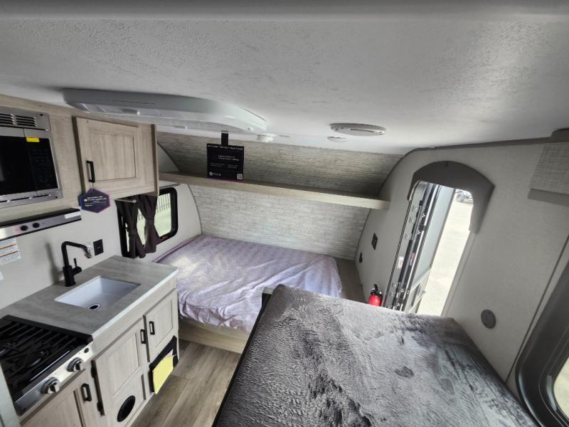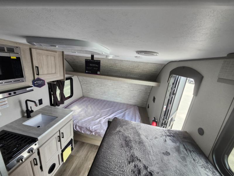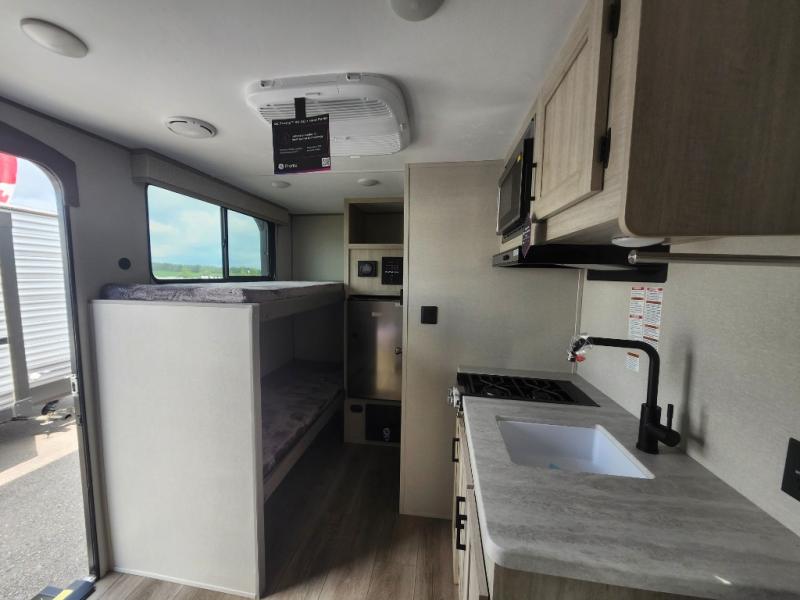 Lightweight camping is easier than you think with this travel trailer in tow! The front 54" x 74" queen bed will provide a great night's rest each night, while the little ones or your guests take the bunk beds. There is a handy shelf above the front bed for your belongings plus additional bedroom storage. A private bath includes a 24" x 32" shower and a toilet with a mirror behind it so you can freshen up each day. You'll also find a two burner cooktop and microwave oven to make meals each day plus a 3.3 cu. ft. 12V refrigerator for food storage!