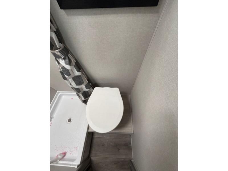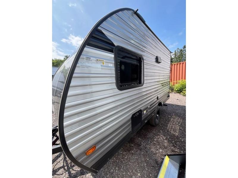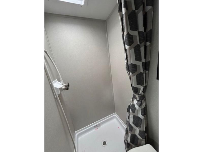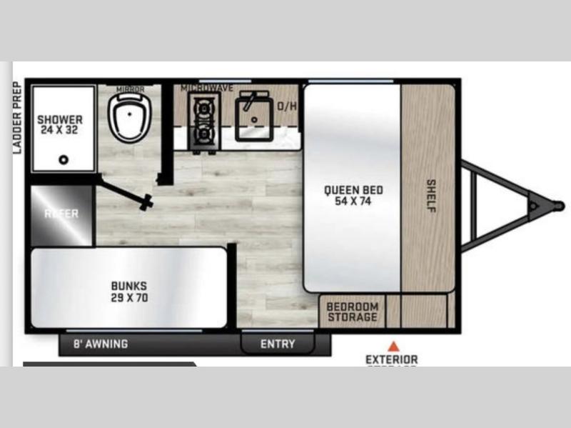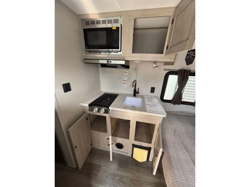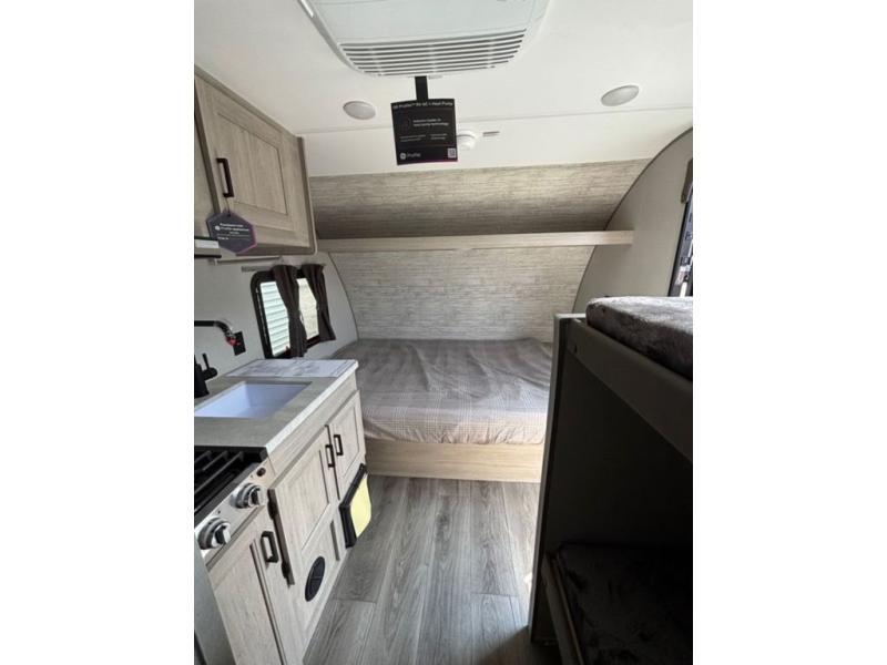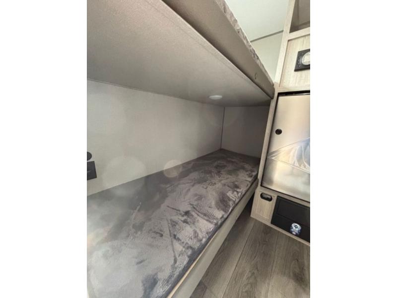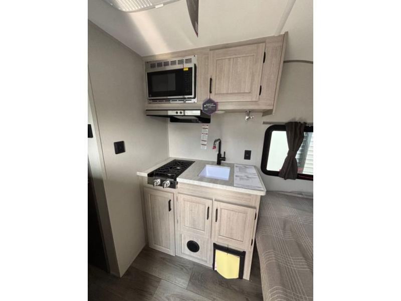 Lightweight camping is easier than you think with this travel trailer in tow! The front 54" x 74" queen bed will provide a great night's rest each night, while the little ones or your guests take the bunk beds. There is a handy shelf above the front bed for your belongings plus additional bedroom storage. A private bath includes a 24" x 32" shower and a toilet with a mirror behind it so you can freshen up each day. You'll also find a two burner cooktop and microwave oven to make meals each day plus a 3.3 cu. ft. 12V refrigerator for food storage!