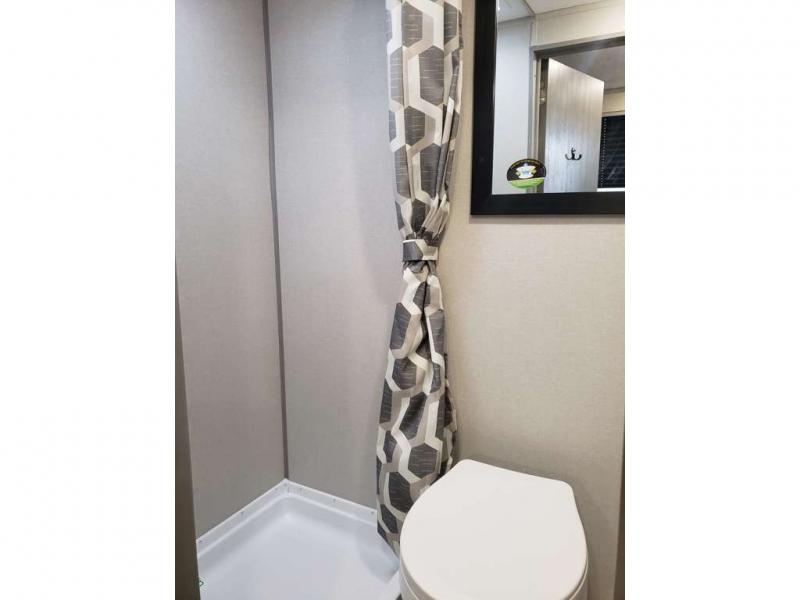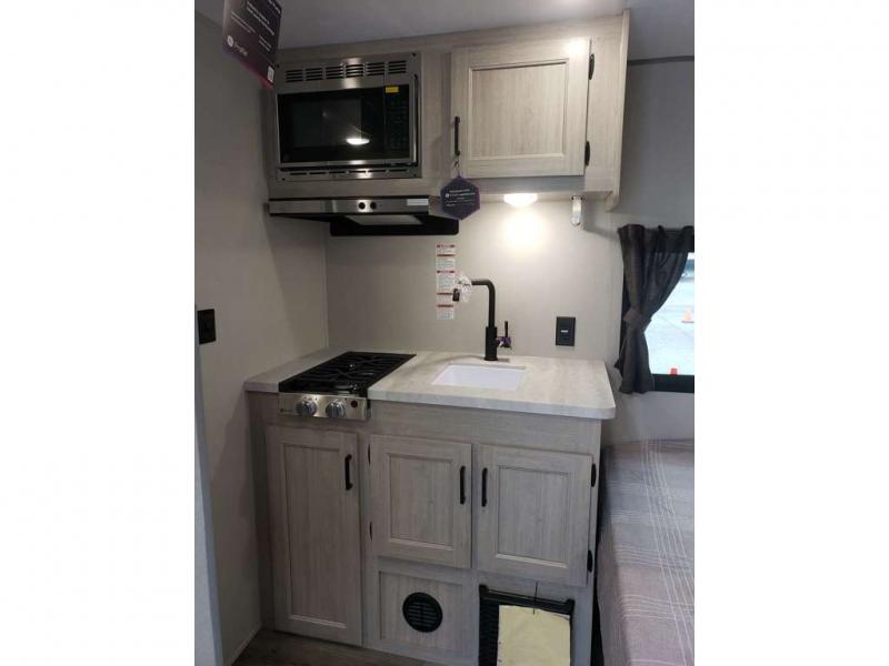 Lightweight camping is easier than you think with this travel trailer in tow! The front 54" x 74" queen bed will provide a great night's rest each night, while the little ones or your guests take the bunk beds. There is a handy shelf above the front bed for your belongings plus additional bedroom storage. A private bath includes a 24" x 32" shower and a toilet with a mirror behind it so you can freshen up each day. You'll also find a two burner cooktop and microwave oven to make meals each day plus a 3.3 cu. ft. 12V refrigerator for food storage!