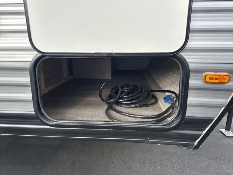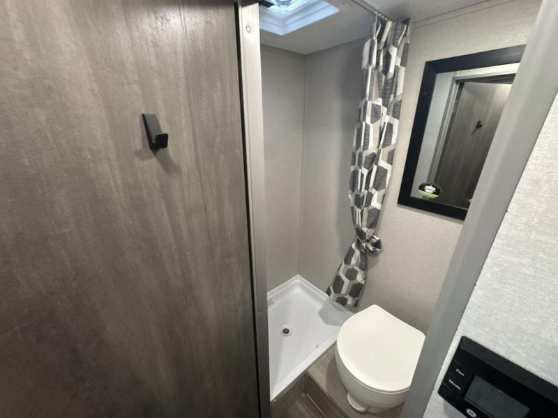 Lightweight camping is easier than you think with this travel trailer in tow! The front 54" x 74" queen bed will provide a great night's rest each night, while the little ones or your guests take the bunk beds. There is a handy shelf above the front bed for your belongings plus additional bedroom storage. A private bath includes a 24" x 32" shower and a toilet with a mirror behind it so you can freshen up each day. You'll also find a two burner cooktop and microwave oven to make meals each day plus a 3.3 cu. ft. 12V refrigerator for food storage!