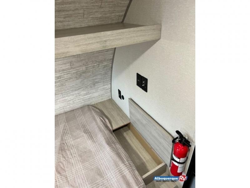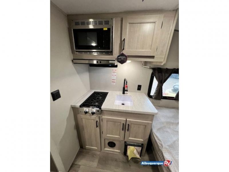 Lightweight camping is easier than you think with this travel trailer in tow! The front 54" x 74" queen bed will provide a great night's rest each night, while the little ones or your guests take the bunk beds. There is a handy shelf above the front bed for your belongings plus additional bedroom storage. A private bath includes a 24" x 32" shower and a toilet with a mirror behind it so you can freshen up each day. You'll also find a two burner cooktop and microwave oven to make meals each day plus a 3.3 cu. ft. 12V refrigerator for food storage!