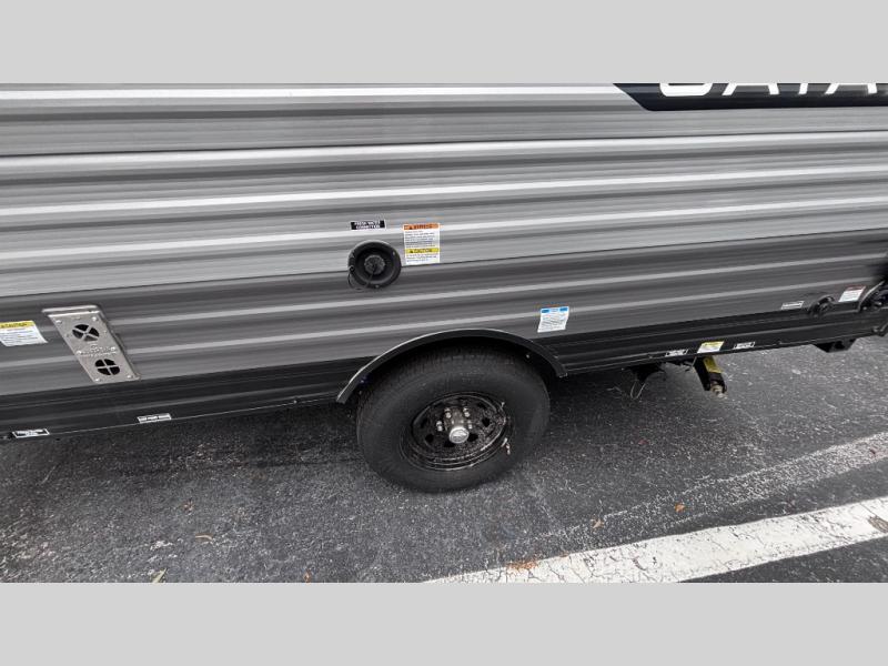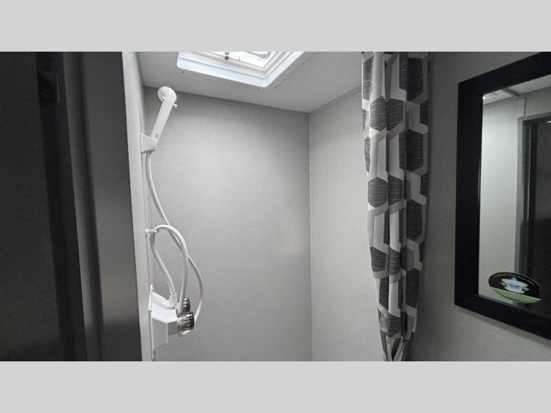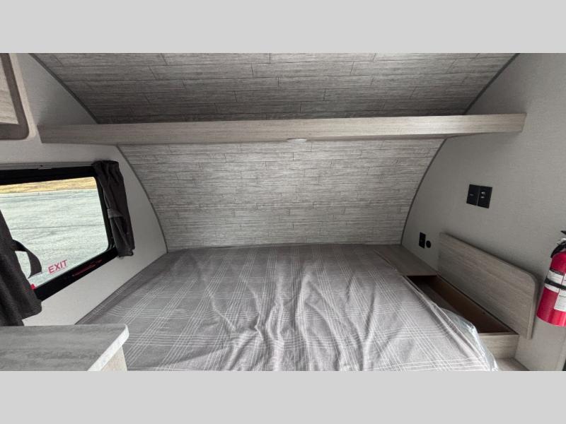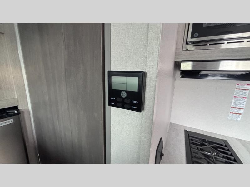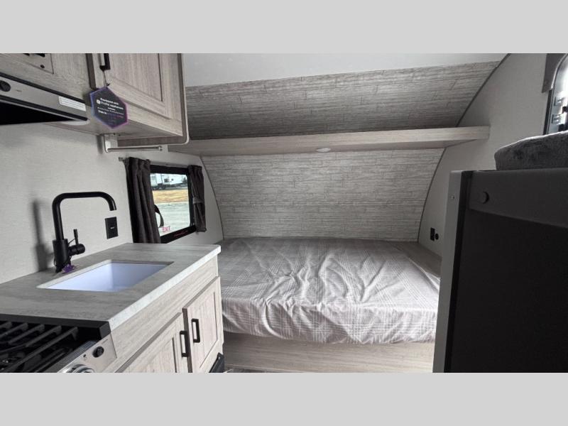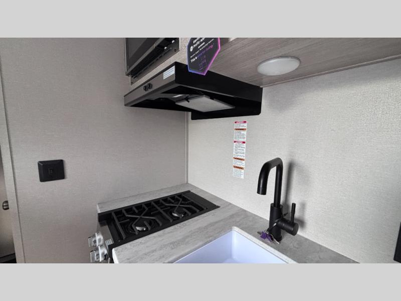 Lightweight camping is easier than you think with this travel trailer in tow! The front 54" x 74" queen bed will provide a great night's rest each night, while the little ones or your guests take the bunk beds. There is a handy shelf above the front bed for your belongings plus additional bedroom storage. A private bath includes a 24" x 32" shower and a toilet with a mirror behind it so you can freshen up each day. You'll also find a two burner cooktop and microwave oven to make meals each day plus a 3.3 cu. ft. 12V refrigerator for food storage!