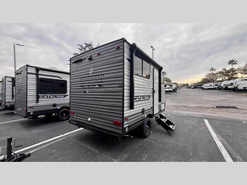 With any Catalina Summit Series 7' by Coachmen RV, you can create an easier adventure with the versatility and simplicity of the shorter lengths and lighter weights! Each includes a premium exterior graphics package, a smooth HD aluminum radius front, and EZ lube axles with leaf spring suspension. The exterior offers a heavy duty standard tongue jack, a diamond plate rock guard to protect against road debris, exterior RG-6 coax cabling and satellite prep, rear view camera prep, and flush mount baggage doors with radius corners for your outdoor gear. Inside, you will enjoy a premium JBL interior speaker, USB charging ports, seamless Thermofoil countertops throughout, a deep basin farm style sink for easy cleanup, and GE kitchen appliances. It's time to choose an affordable and maneuverable single axle trailer today!