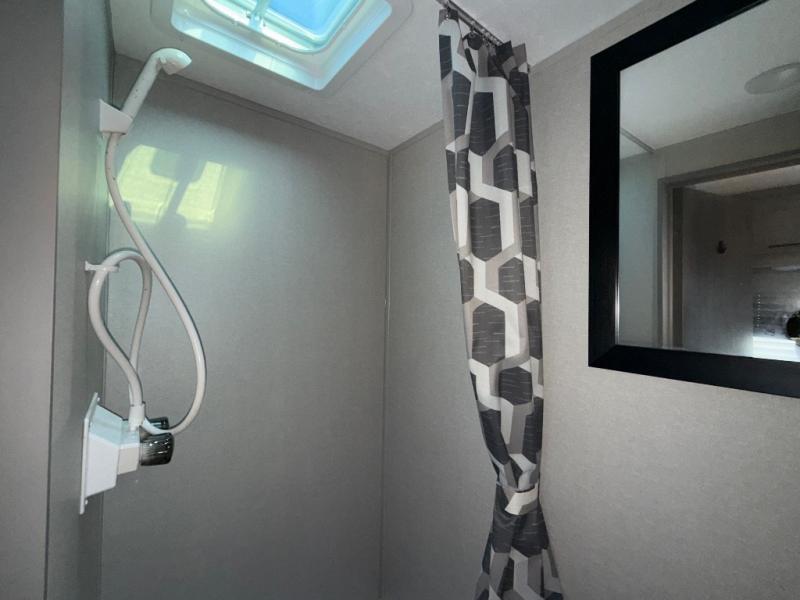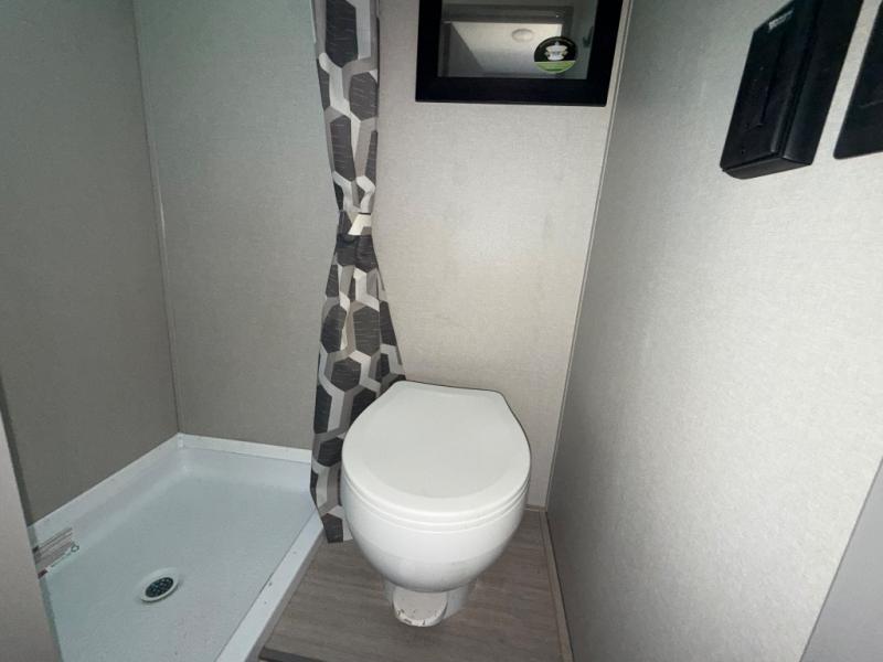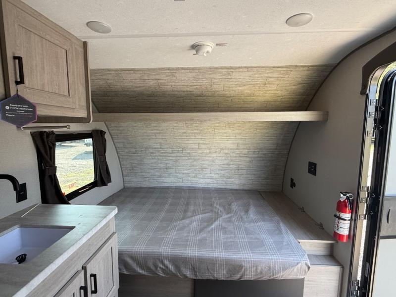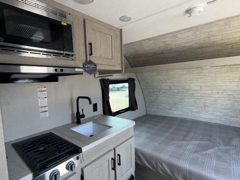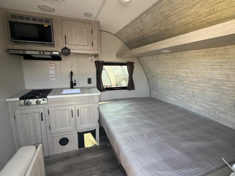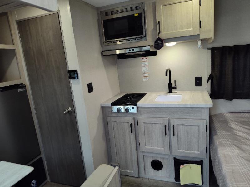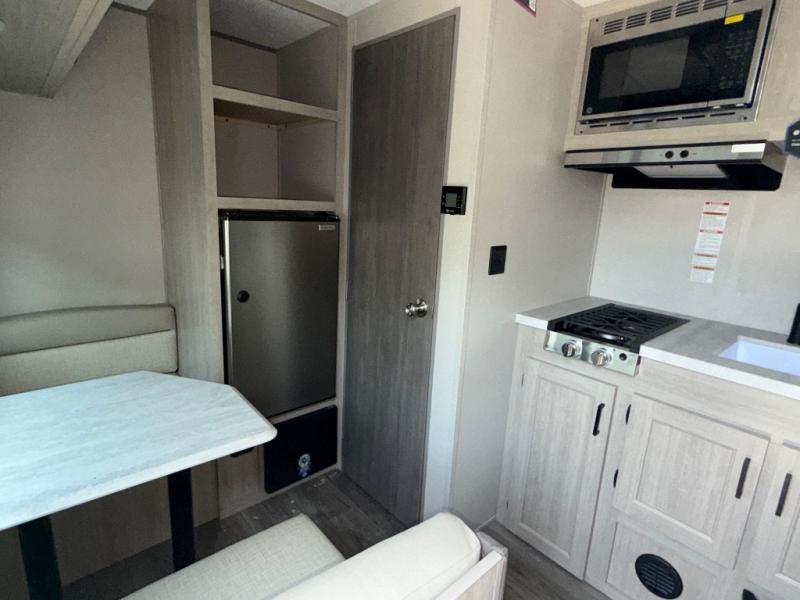 Lightweight camping is easier than you think with this travel trailer in tow! The front 54" x 74" queen bed will provide a great night's rest each night, while your overnight guest takes the booth dinette. There is a handy shelf above the front bed for your belongings plus additional bedroom storage. A private bath includes a 24" x 32" shower and a toilet with a mirror behind it so you can freshen up each day. You'll also find a two-burner cooktop and microwave oven to make meals each day plus a 3.3 cu. ft. 12V refrigerator for food storage!