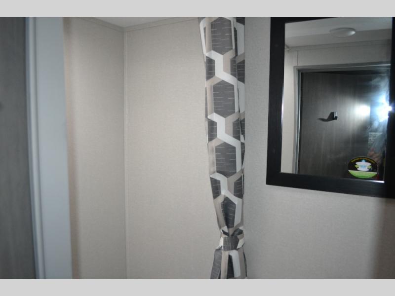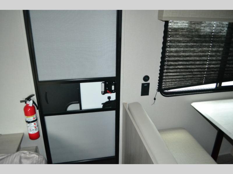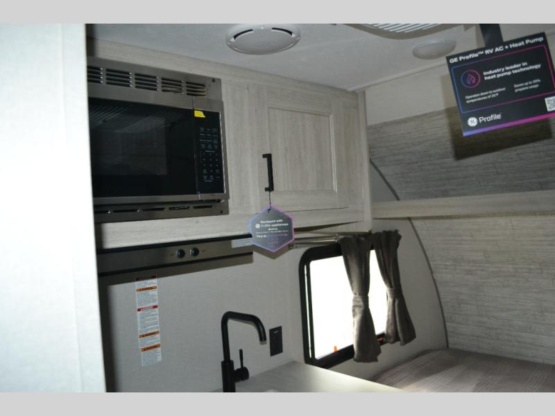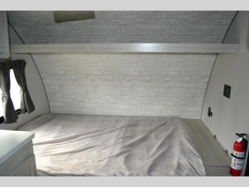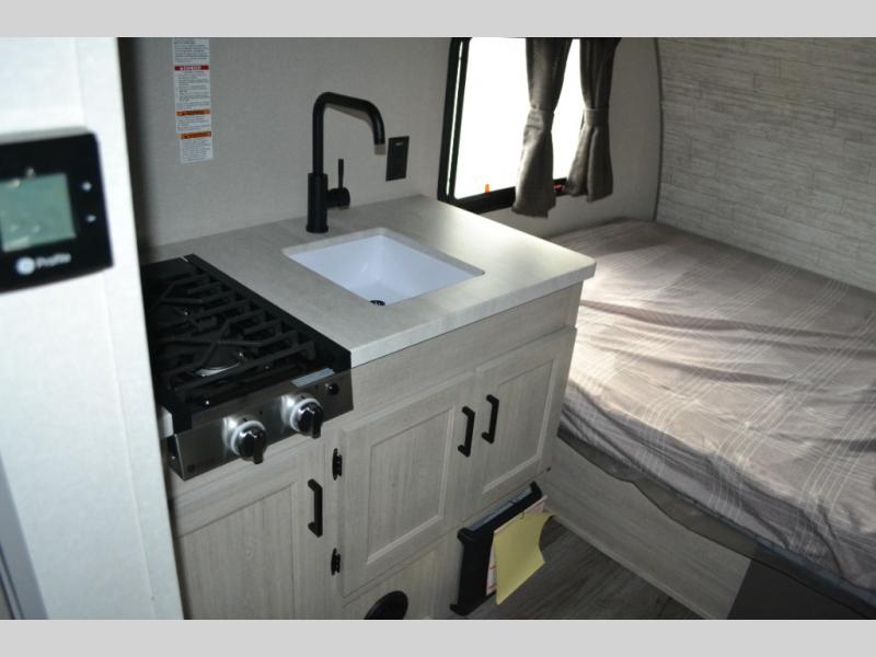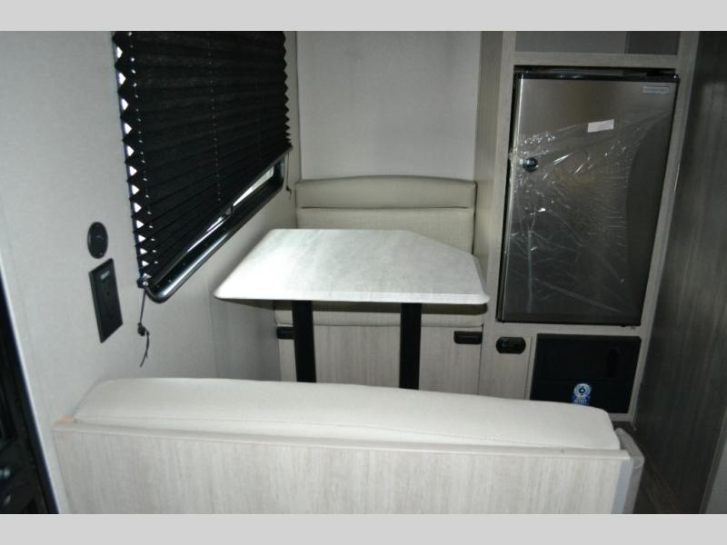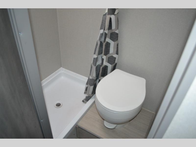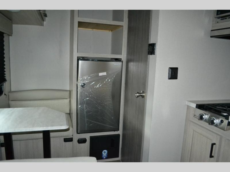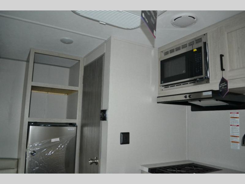 Lightweight camping is easier than you think with this travel trailer in tow! The front 54" x 74" queen bed will provide a great night's rest each night, while your overnight guest takes the booth dinette. There is a handy shelf above the front bed for your belongings plus additional bedroom storage. A private bath includes a 24" x 32" shower and a toilet with a mirror behind it so you can freshen up each day. You'll also find a two burner cooktop and microwave oven to make meals each day plus a 3.3 cu. ft. 12V refrigerator for food storage!