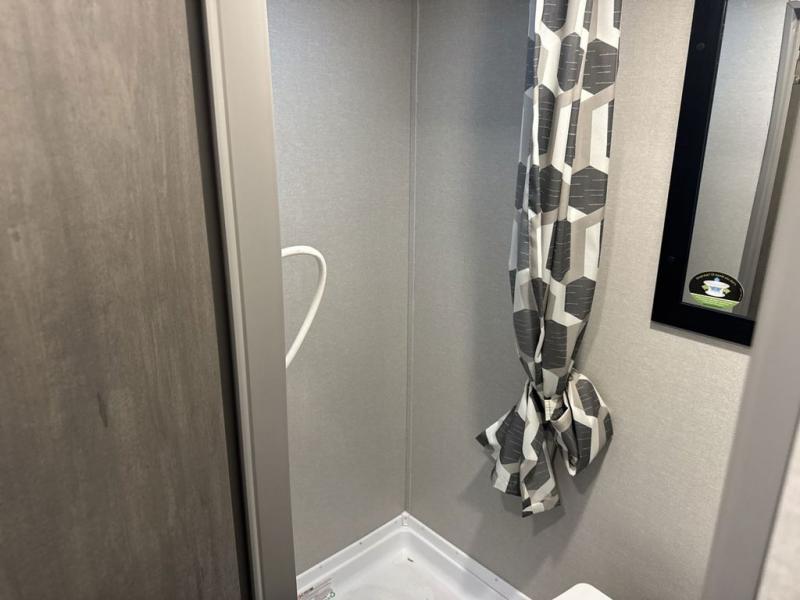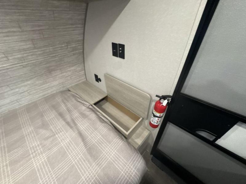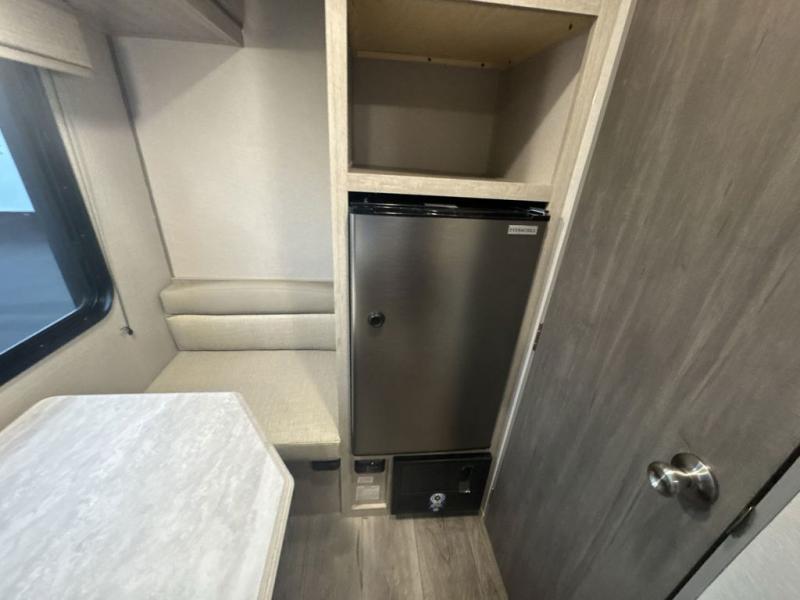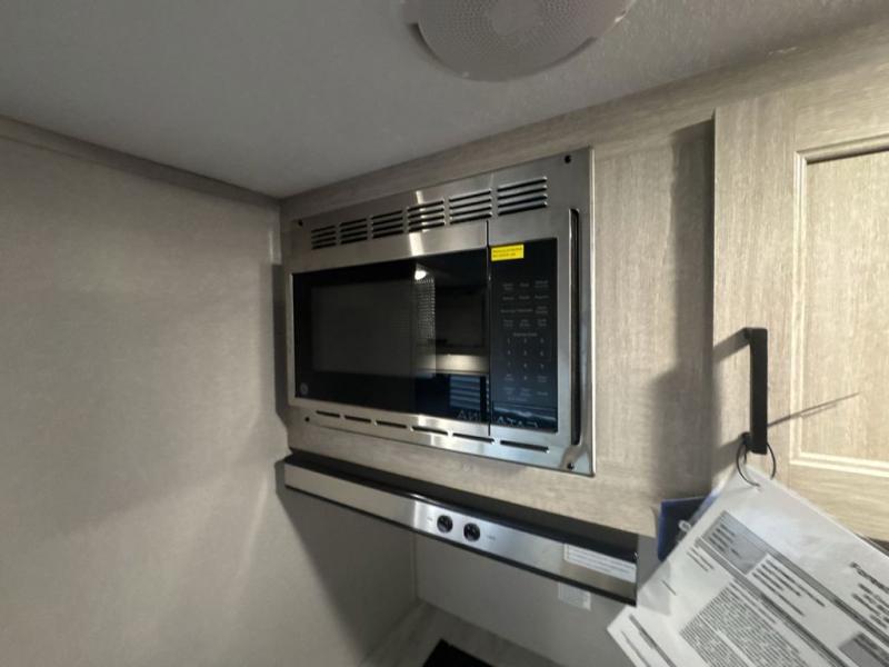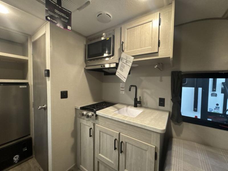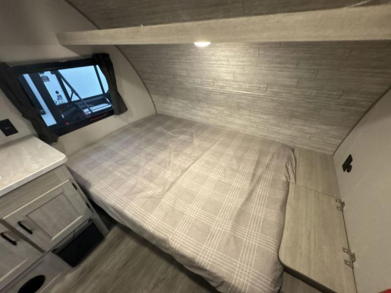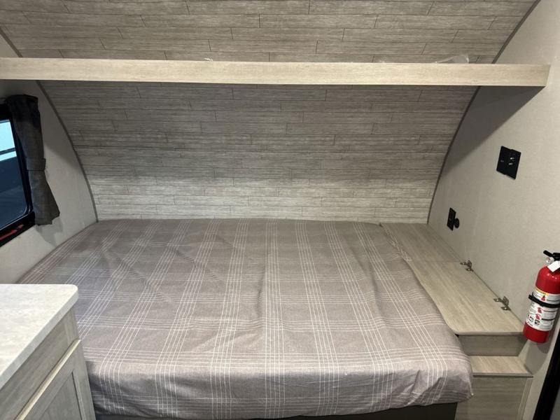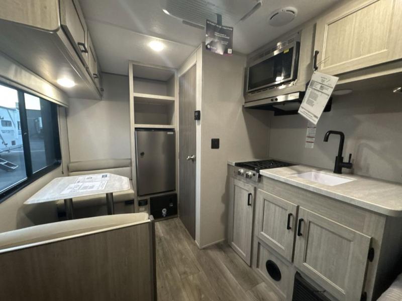 Lightweight camping is easier than you think with this travel trailer in tow! The front 54" x 74" queen bed will provide a great night's rest each night, while your overnight guest takes the booth dinette. There is a handy shelf above the front bed for your belongings plus additional bedroom storage. A private bath includes a 24" x 32" shower and a toilet with a mirror behind it so you can freshen up each day. You'll also find a two burner cooktop and microwave oven to make meals each day plus a 3.3 cu. ft. 12V refrigerator for food storage!