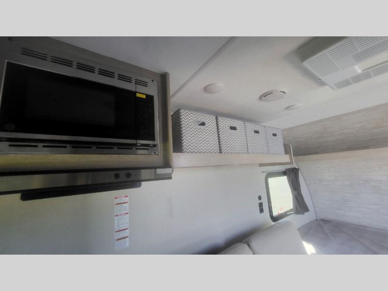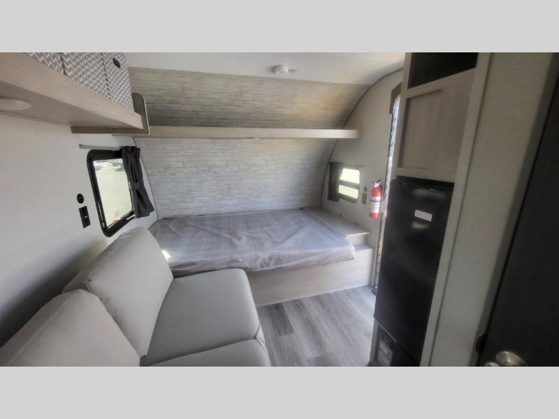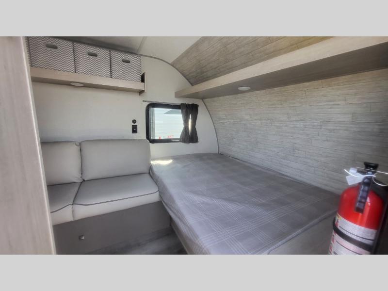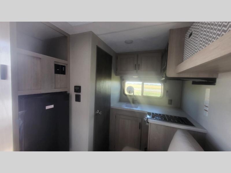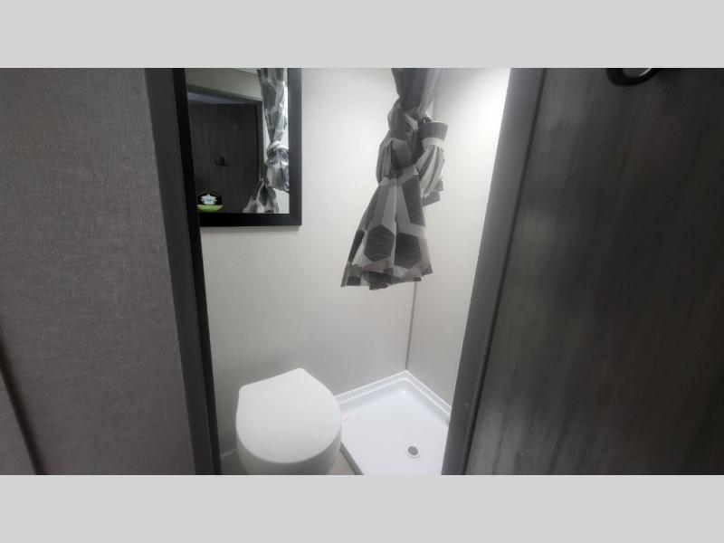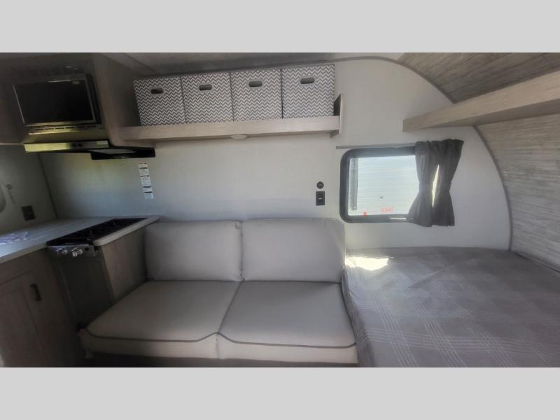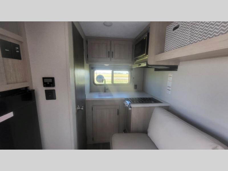 Lightweight camping is easier than you think with this travel trailer in tow! The front 54" x 74" queen bed will provide a great night's rest each night, while your overnight guest takes the 60" Jack knife sofa. There is a handy shelf above the front bed for your belongings plus a shelf with bins over the sofa. A private bath includes a 24" x 32" shower and a toilet with a mirror behind it so you can freshen up each day. You'll also find a two burner cooktop and microwave oven to make meals each day plus a 3.3 cu. ft. 12V refrigerator for food storage!