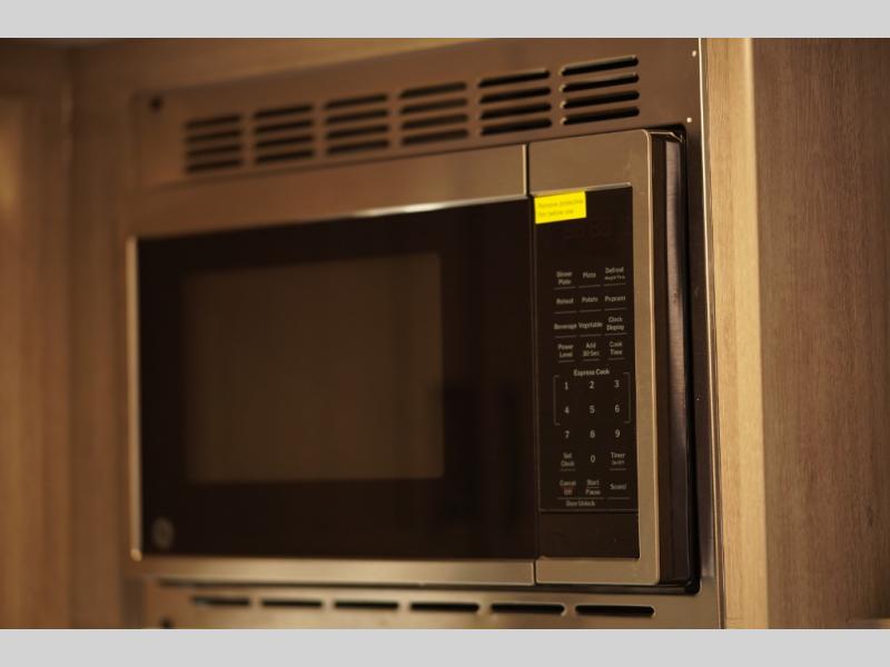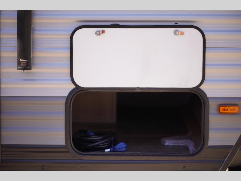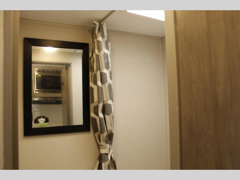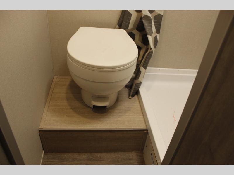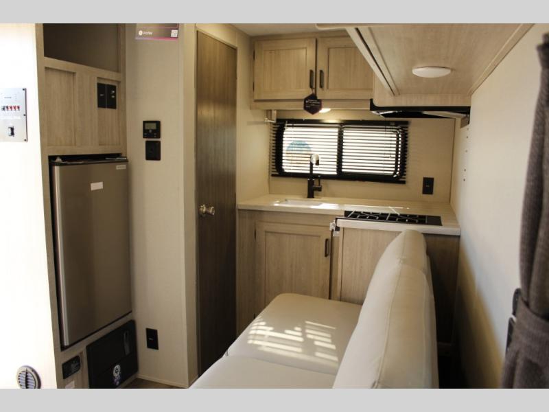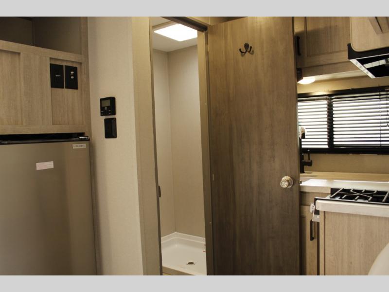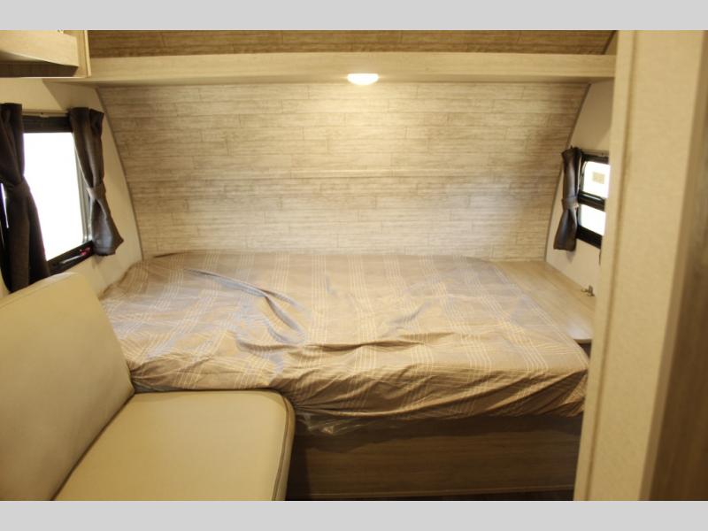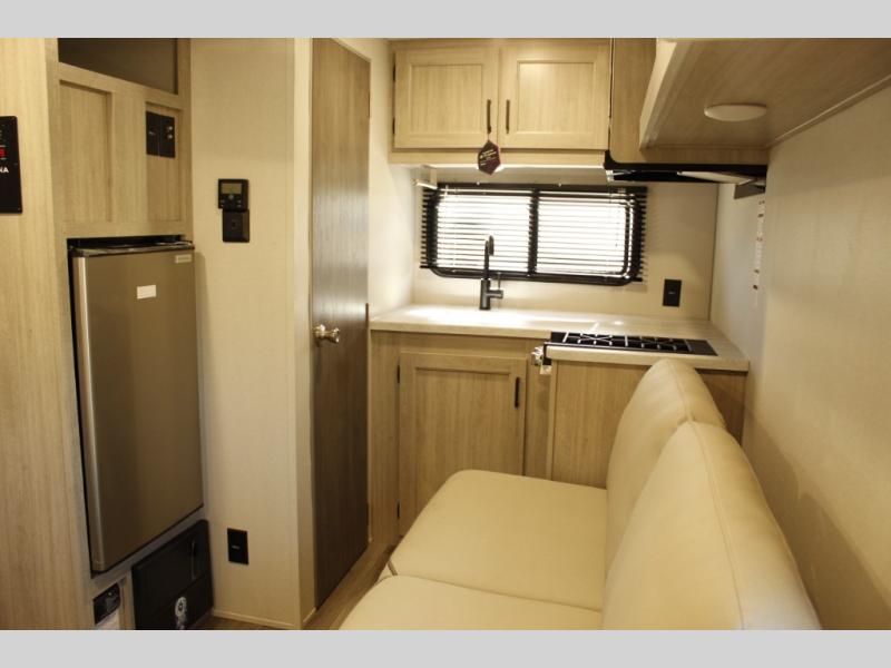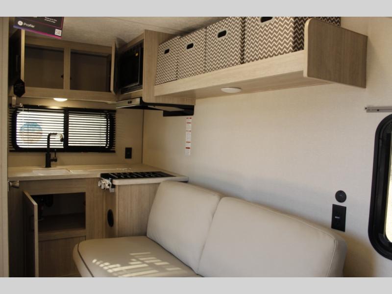 Lightweight camping is easier than you think with this travel trailer in tow! The front 54" x 74" queen bed will provide a great night's rest each night, while your overnight guest takes the 60" Jack knife sofa. There is a handy shelf above the front bed for your belongings plus a shelf with bins over the sofa. A private bath includes a 24" x 32" shower and a toilet with a mirror behind it so you can freshen up each day. You'll also find a two burner cooktop and microwave oven to make meals each day plus a 3.3 cu. ft. 12V refrigerator for food storage!