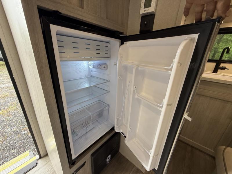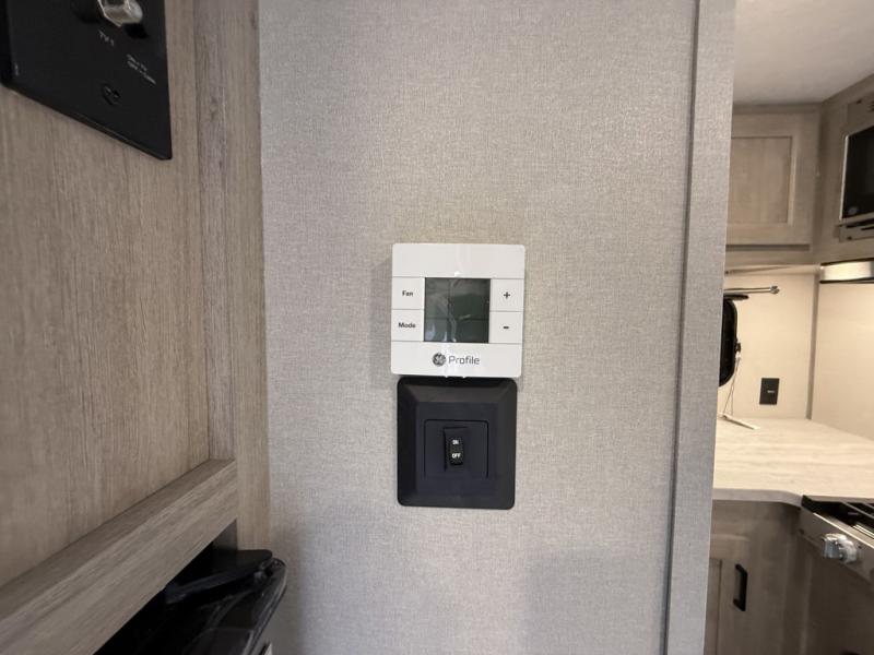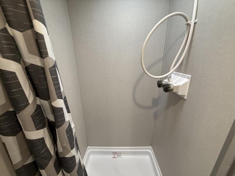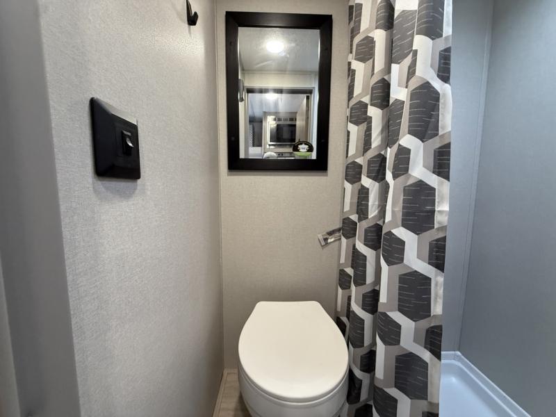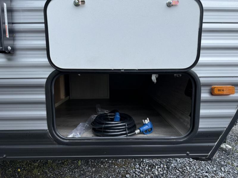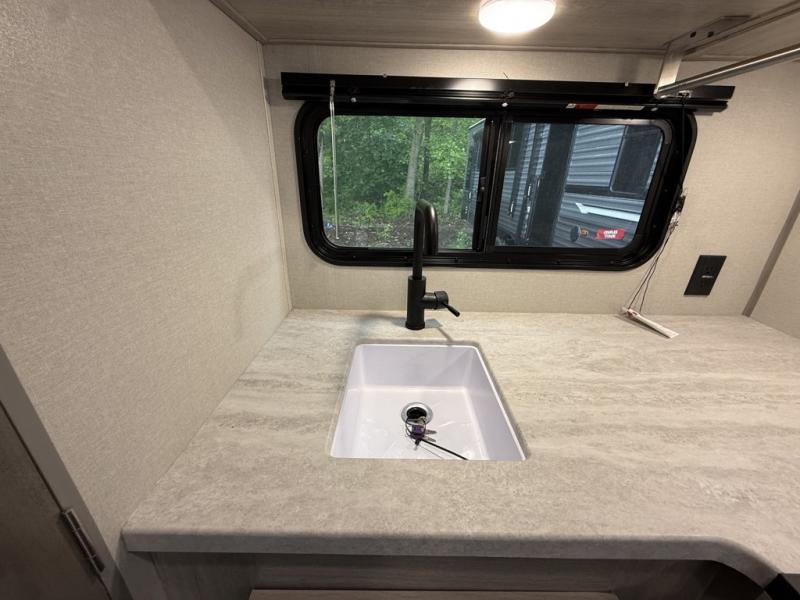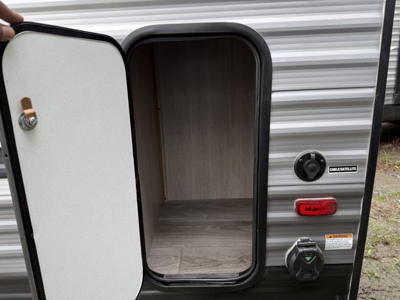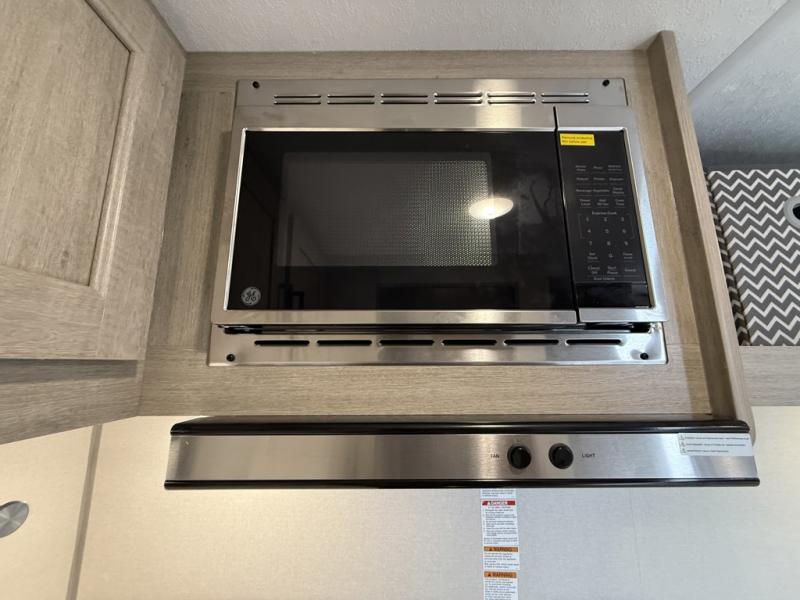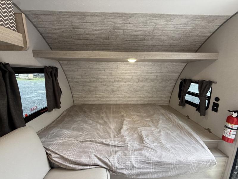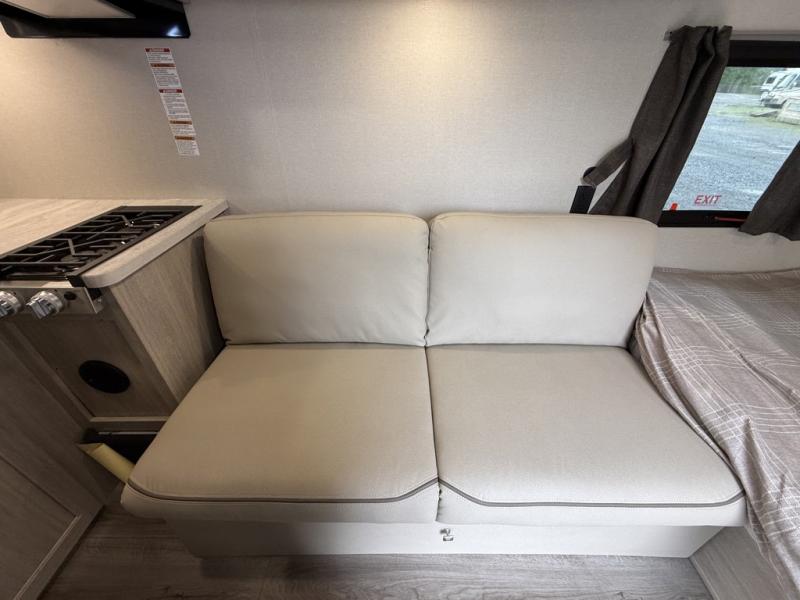 Lightweight camping is easier than you think with this travel trailer in tow! The front 54" x 74" queen bed will provide a great night's rest each night, while your overnight guest takes the 60" Jack knife sofa. There is a handy shelf above the front bed for your belongings plus a shelf with bins over the sofa. A private bath includes a 24" x 32" shower and a toilet with a mirror behind it so you can freshen up each day. You'll also find a two burner cooktop and microwave oven to make meals each day plus a 3.3 cu. ft. 12V refrigerator for food storage!