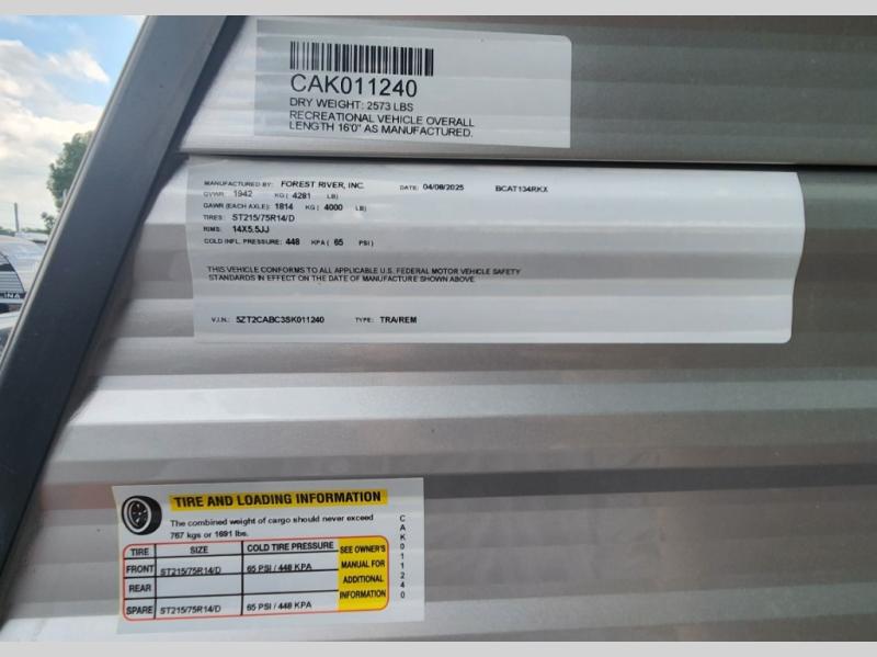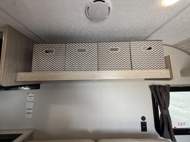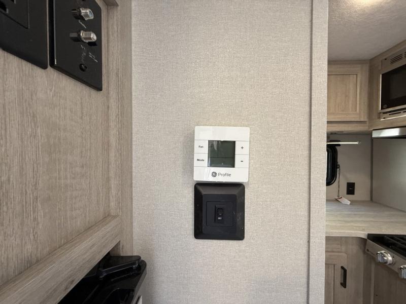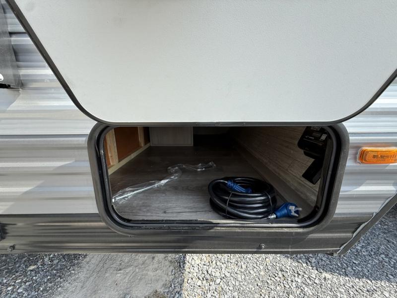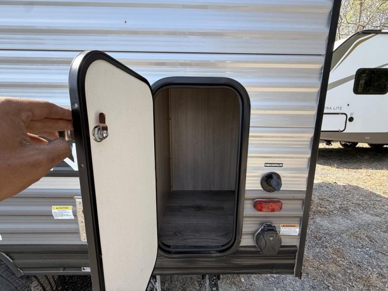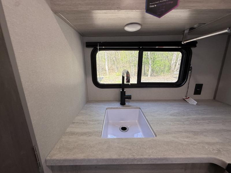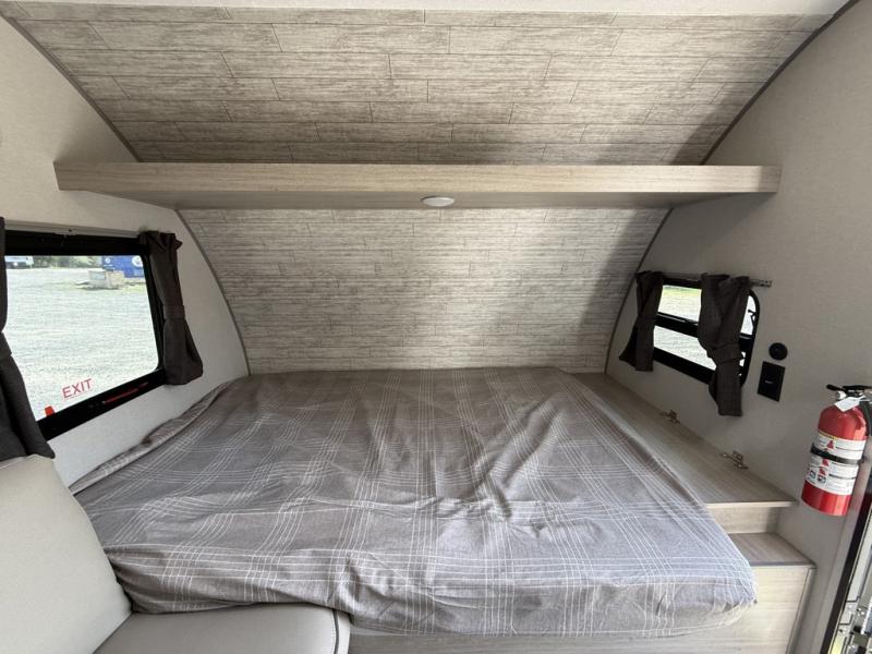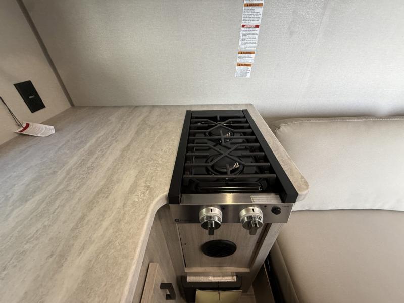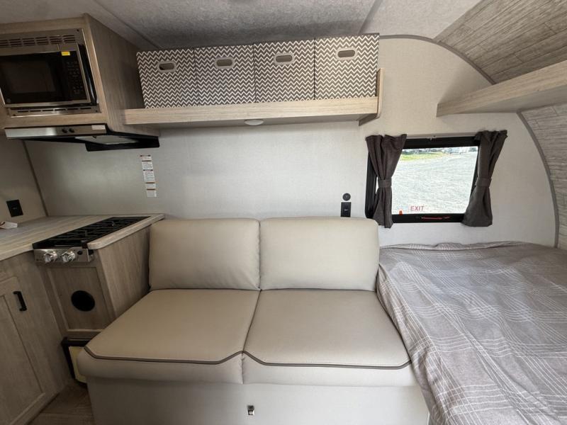 Lightweight camping is easier than you think with this travel trailer in tow! The front 54" x 74" queen bed will provide a great night's rest each night, while your overnight guest takes the 60" Jack knife sofa. There is a handy shelf above the front bed for your belongings plus a shelf with bins over the sofa. A private bath includes a 24" x 32" shower and a toilet with a mirror behind it so you can freshen up each day. You'll also find a two burner cooktop and microwave oven to make meals each day plus a 3.3 cu. ft. 12V refrigerator for food storage!