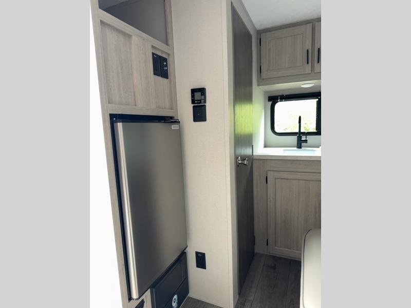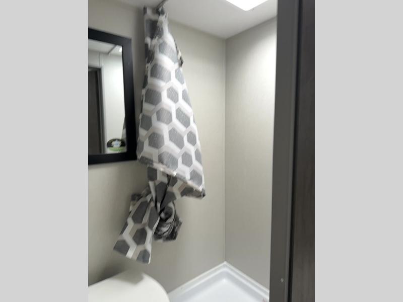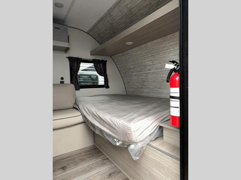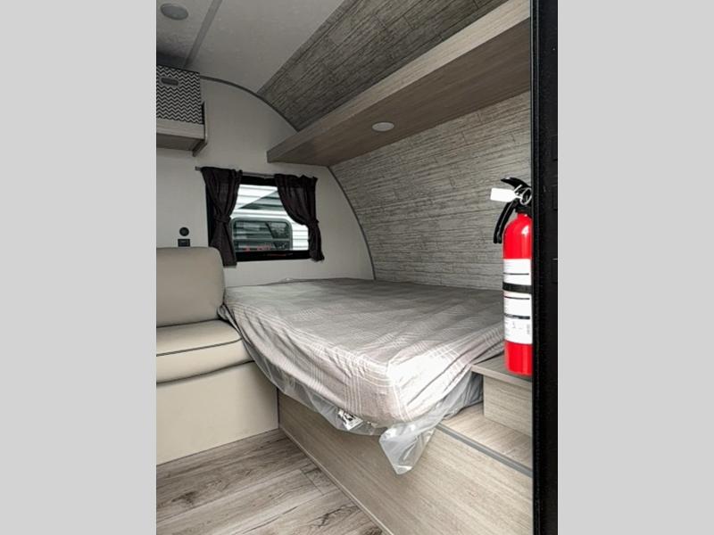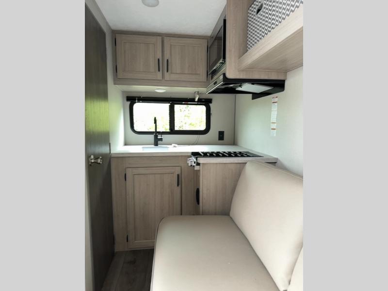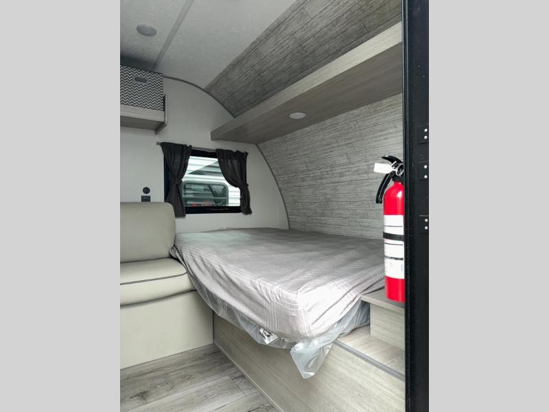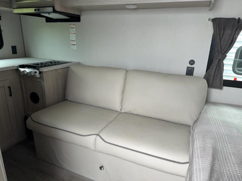 Lightweight camping is easier than you think with this travel trailer in tow! The front 54" x 74" queen bed will provide a great night's rest each night, while your overnight guest takes the 60" Jack knife sofa. There is a handy shelf above the front bed for your belongings plus a shelf with bins over the sofa. A private bath includes a 24" x 32" shower and a toilet with a mirror behind it so you can freshen up each day. You'll also find a two burner cooktop and microwave oven to make meals each day plus a 3.3 cu. ft. 12V refrigerator for food storage!