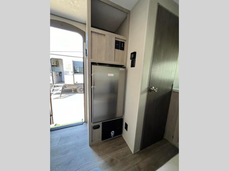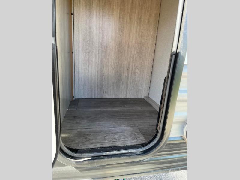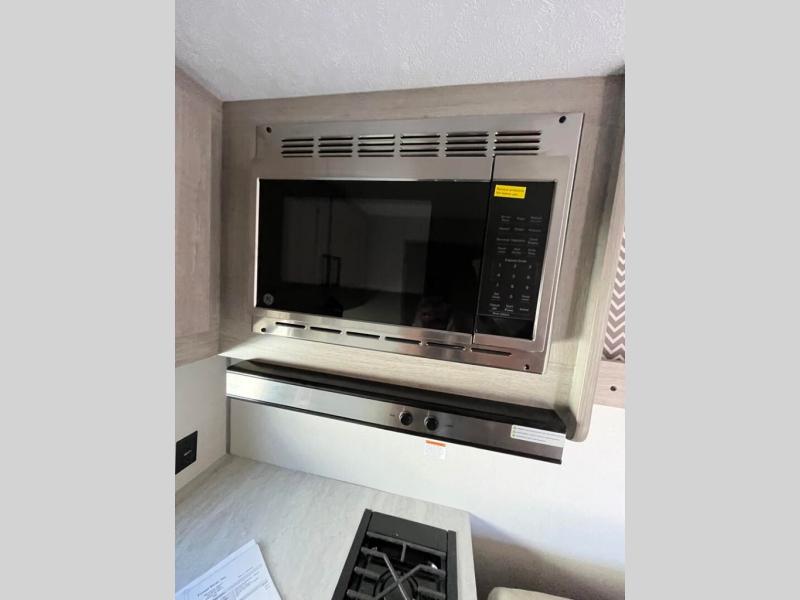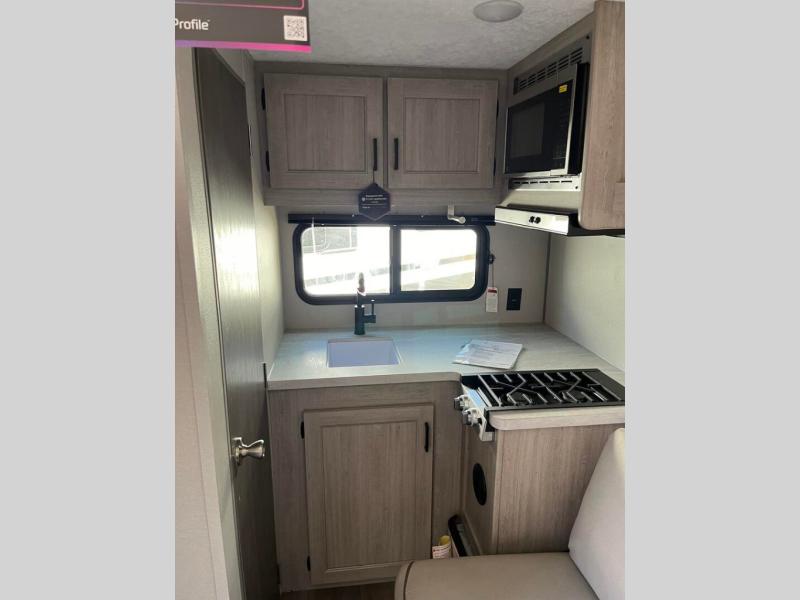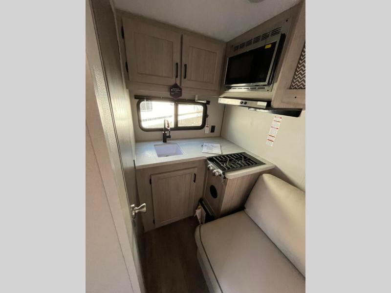 Lightweight camping is easier than you think with this travel trailer in tow! The front 54" x 74" queen bed will provide a great night's rest each night, while your overnight guest takes the 60" Jack knife sofa. There is a handy shelf above the front bed for your belongings plus a shelf with bins over the sofa. A private bath includes a 24" x 32" shower and a toilet with a mirror behind it so you can freshen up each day. You'll also find a two burner cooktop and microwave oven to make meals each day plus a 3.3 cu. ft. 12V refrigerator for food storage!