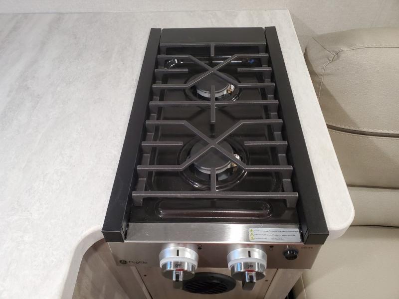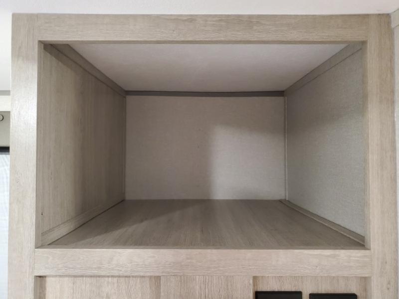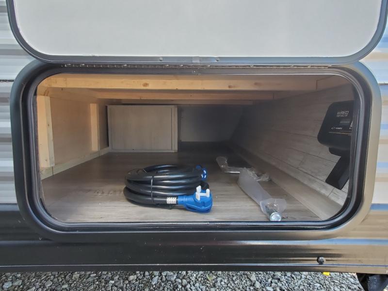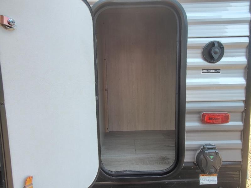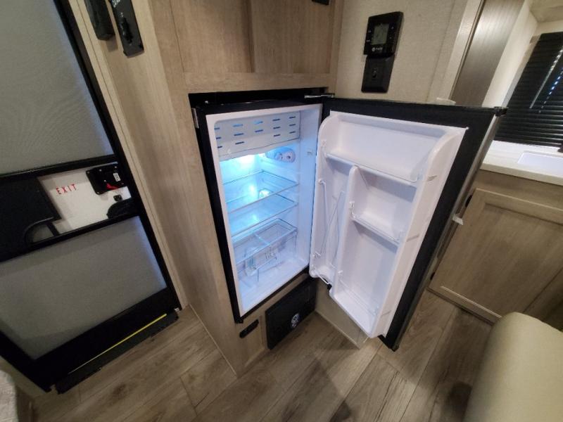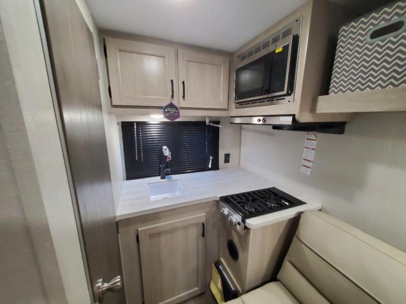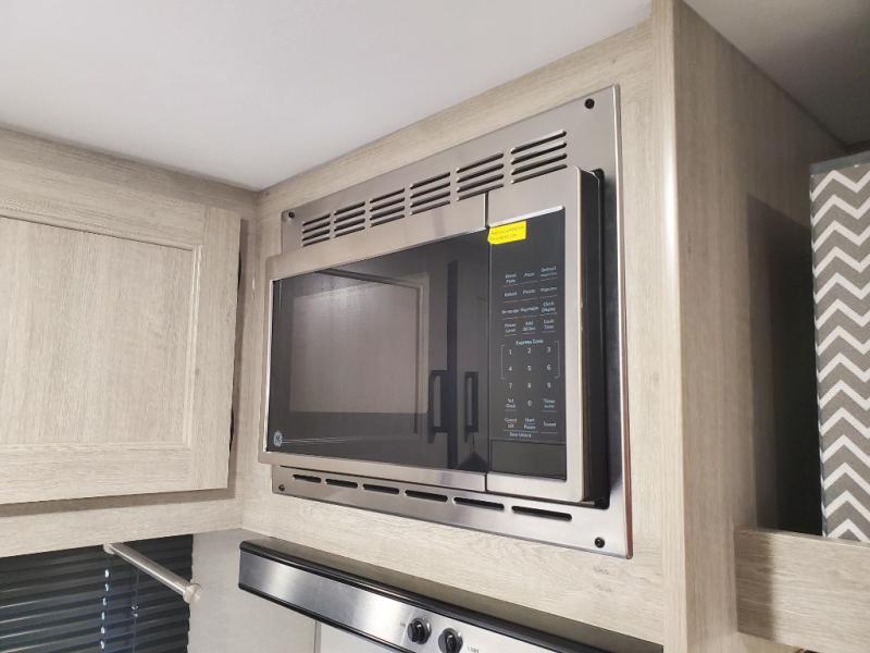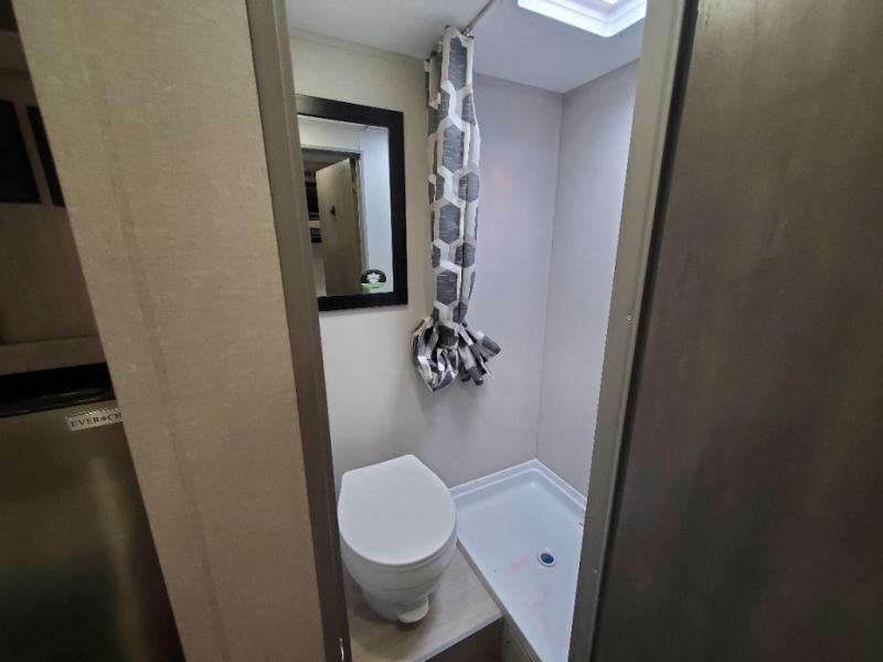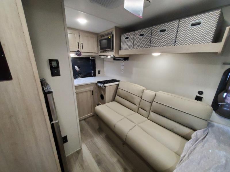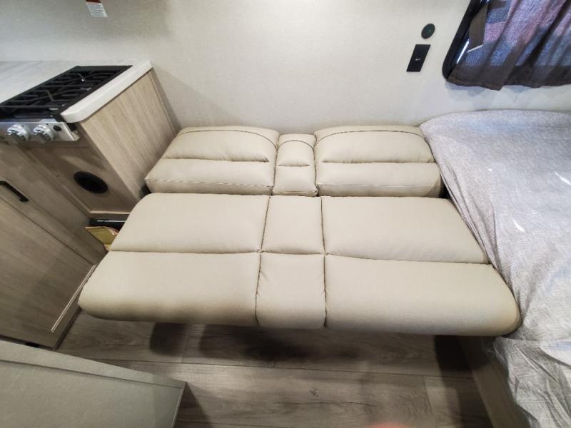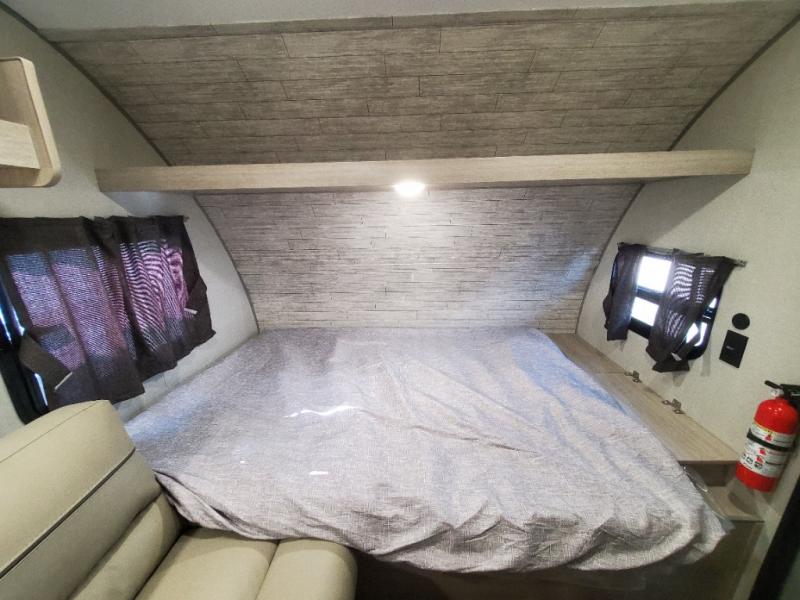 Lightweight camping is easier than you think with this travel trailer in tow! The front 54" x 74" queen bed will provide a great night's rest each night, while your overnight guest takes the 60" Jack knife sofa. There is a handy shelf above the front bed for your belongings plus a shelf with bins over the sofa. A private bath includes a 24" x 32" shower and a toilet with a mirror behind it so you can freshen up each day. You'll also find a two burner cooktop and microwave oven to make meals each day plus a 3.3 cu. ft. 12V refrigerator for food storage!