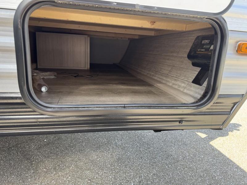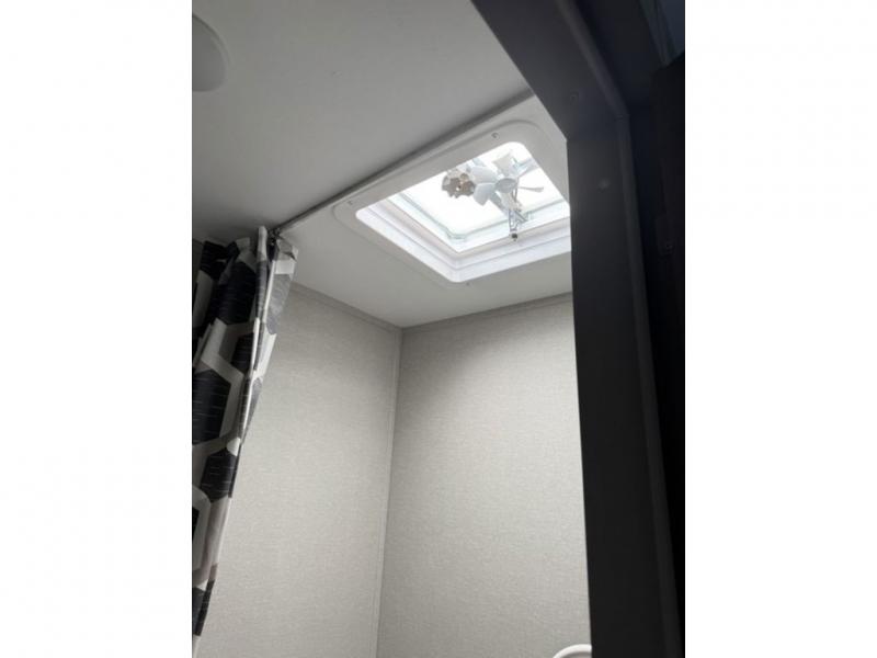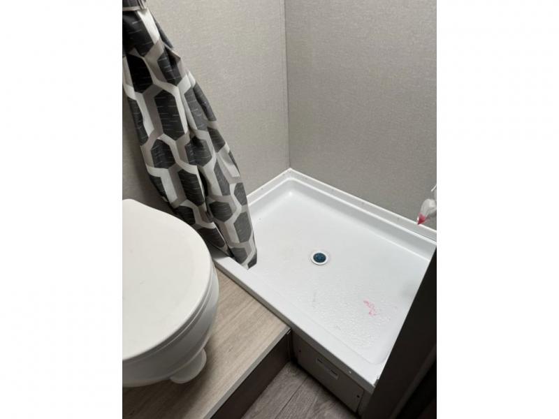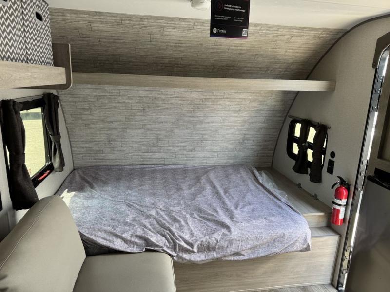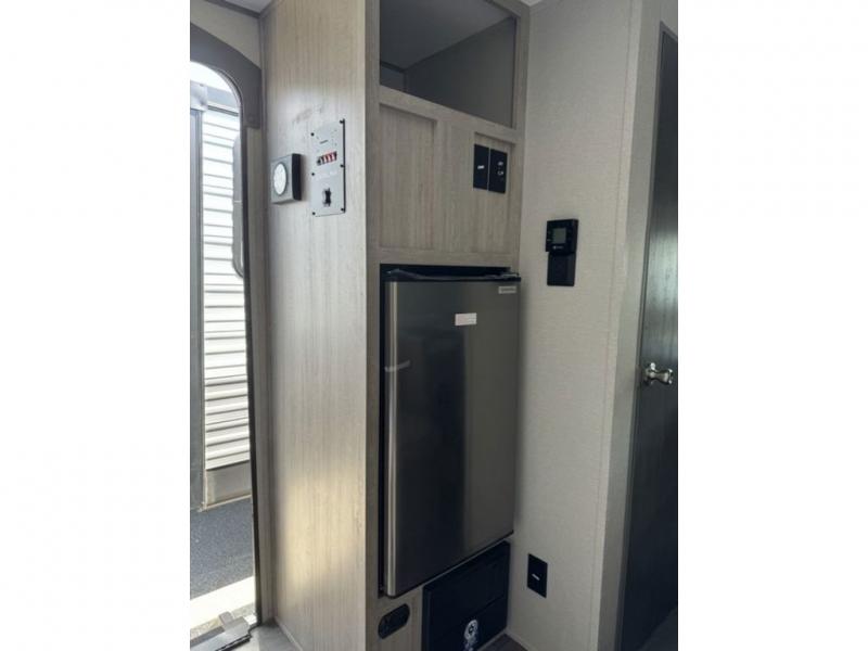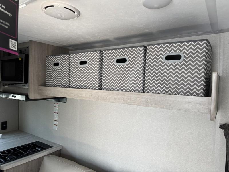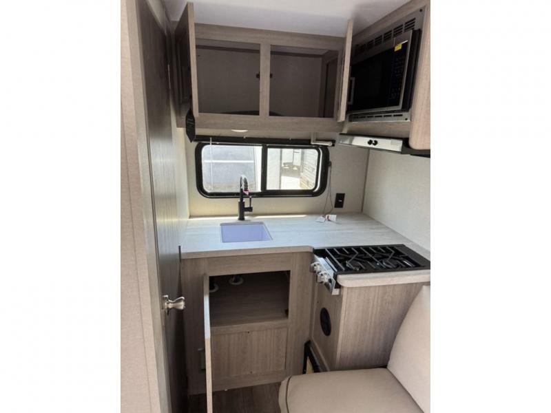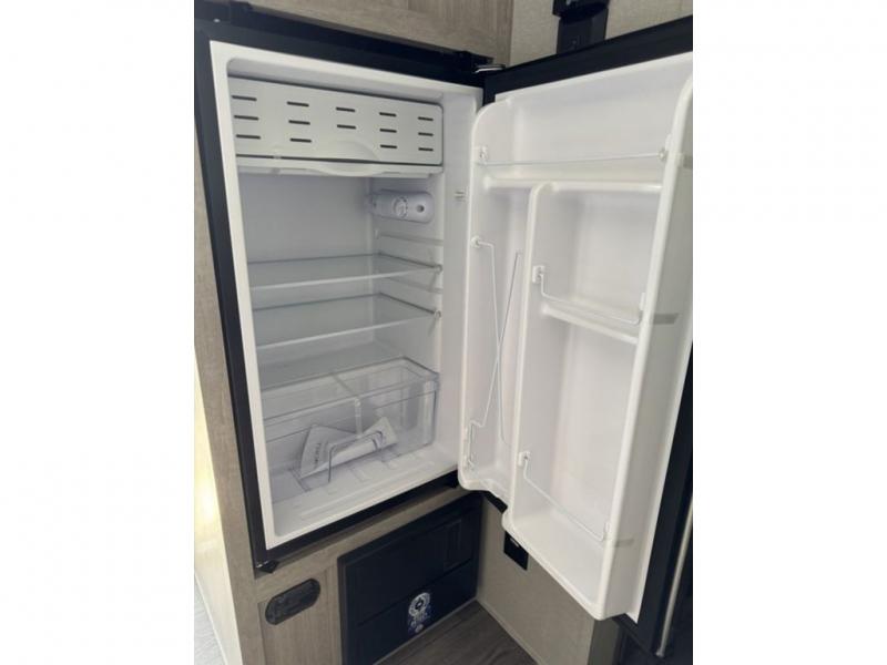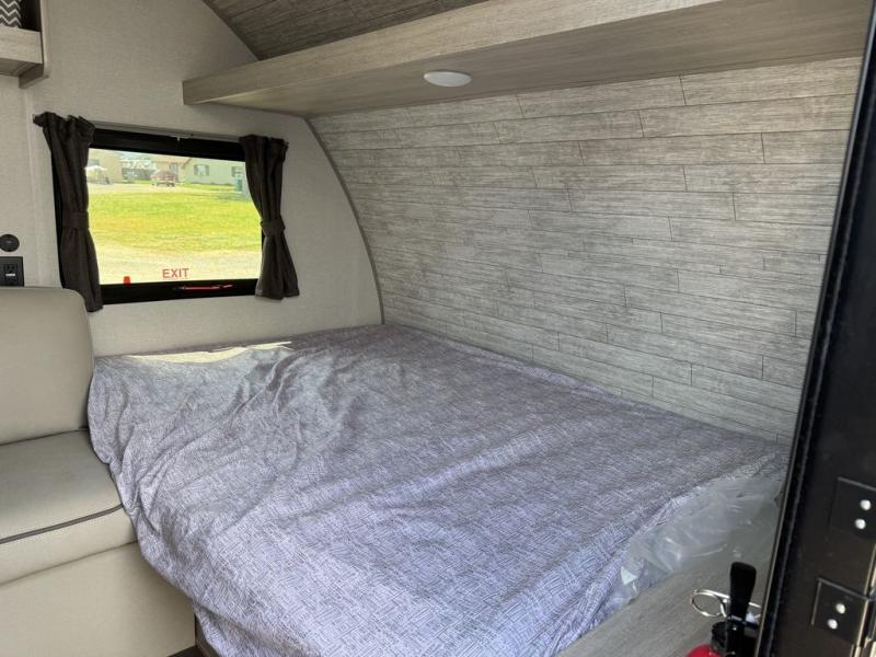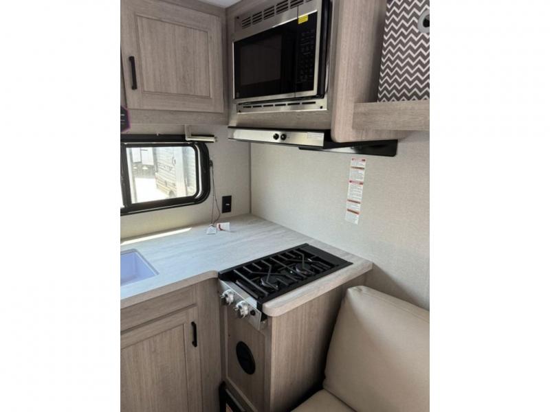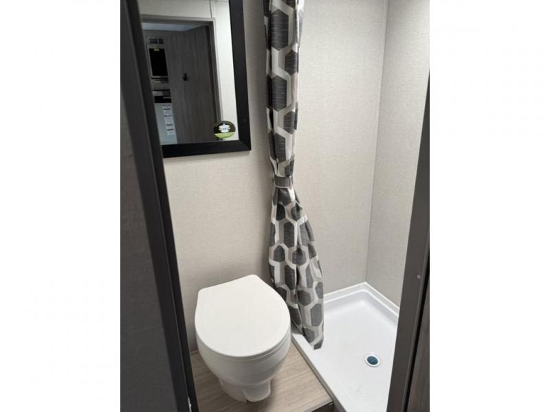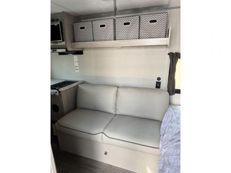 Lightweight camping is easier than you think with this travel trailer in tow! The front 54" x 74" queen bed will provide a great night's rest each night, while your overnight guest takes the 60" Jack knife sofa. There is a handy shelf above the front bed for your belongings plus a shelf with bins over the sofa. A private bath includes a 24" x 32" shower and a toilet with a mirror behind it so you can freshen up each day. You'll also find a two burner cooktop and microwave oven to make meals each day plus a 3.3 cu. ft. 12V refrigerator for food storage!