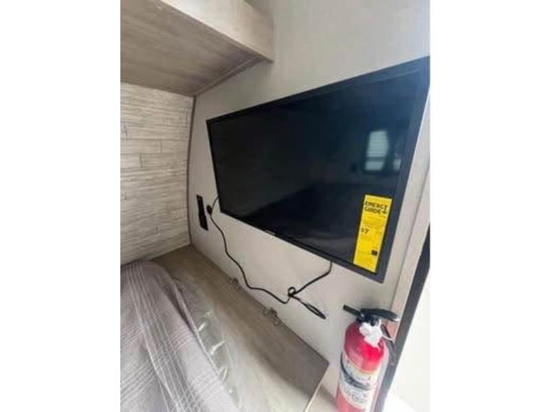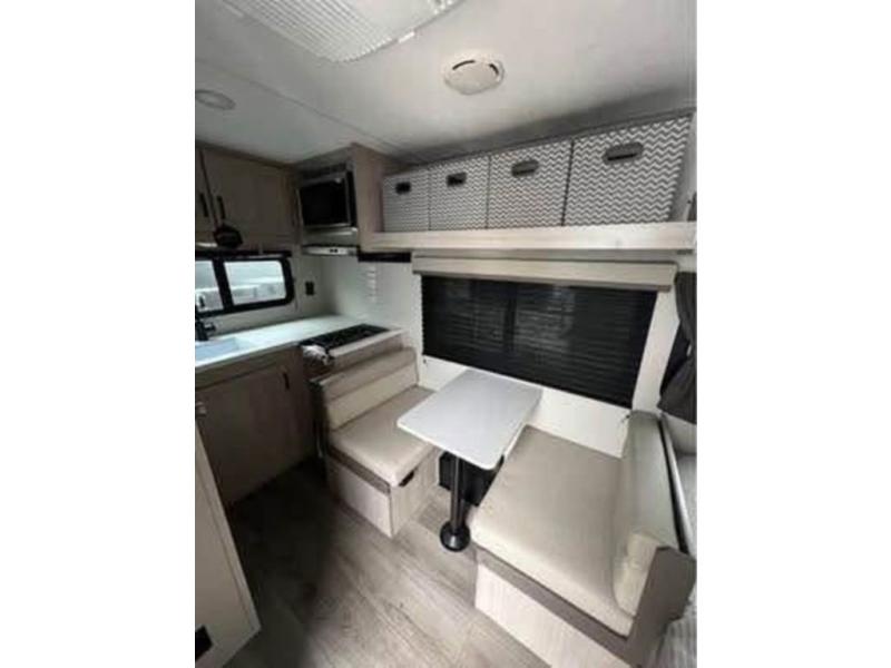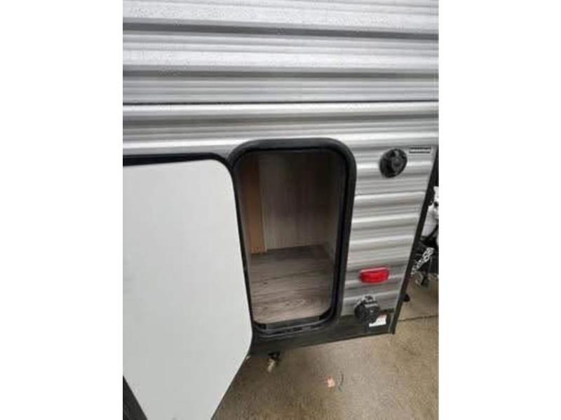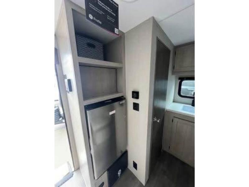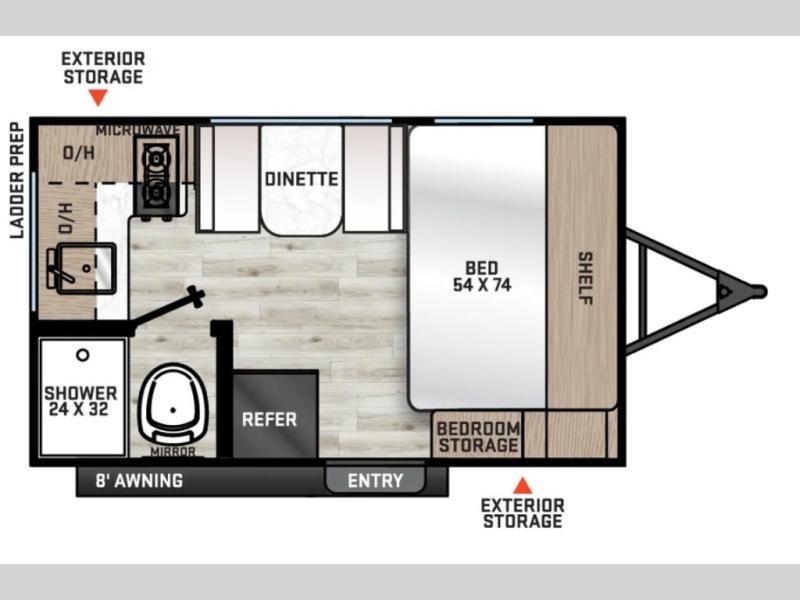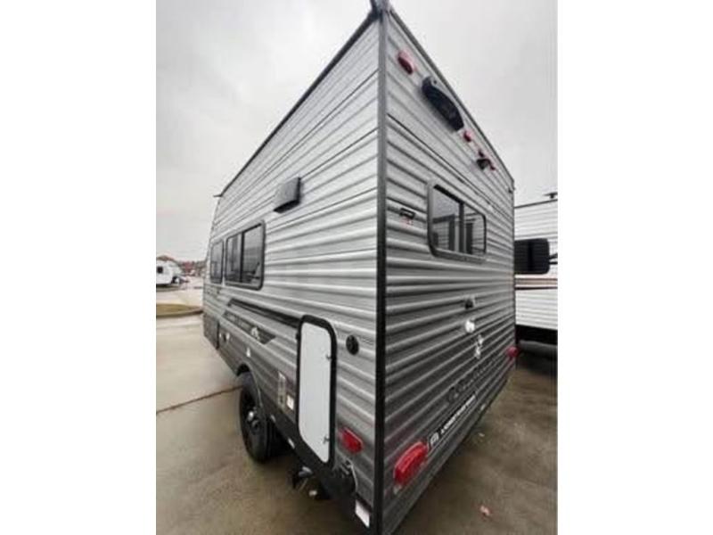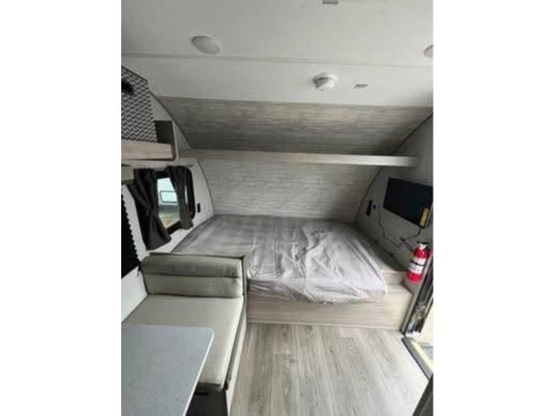 Lightweight camping is easier than you think with this travel trailer in tow! The front 54" x 74" queen bed will provide a great night's rest each night, while your overnight guest takes the 60" Jack knife sofa. There is a handy shelf above the front bed for your belongings plus a shelf with bins over the sofa. A private bath includes a 24" x 32" shower and a toilet with a mirror behind it so you can freshen up each day. You'll also find a two burner cooktop and microwave oven to make meals each day plus a 3.3 cu. ft. 12V refrigerator for food storage!