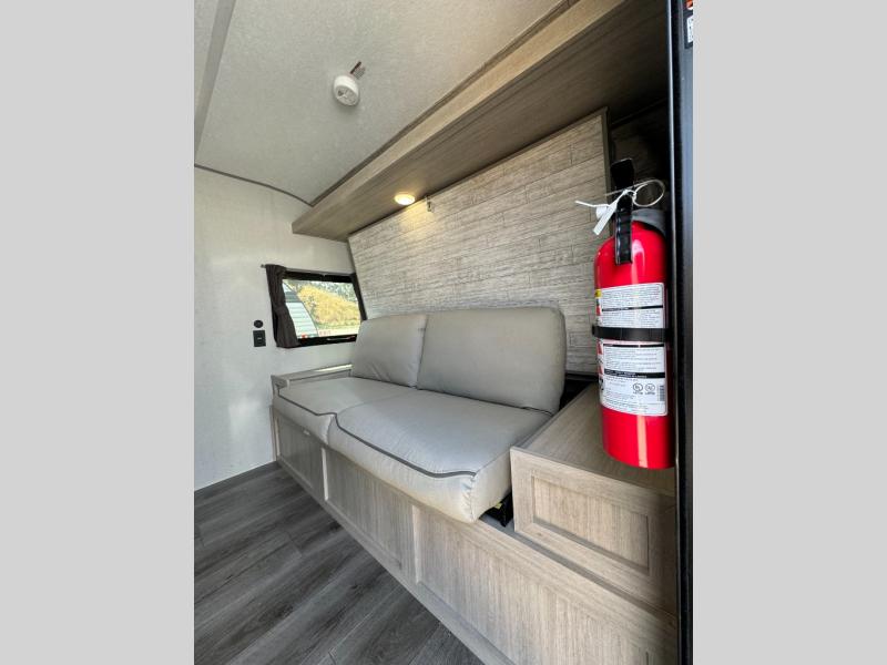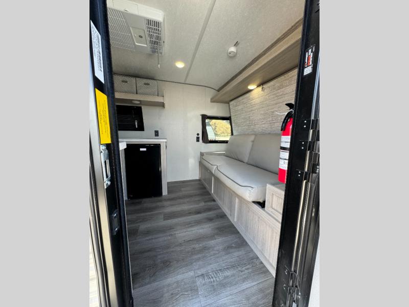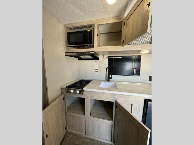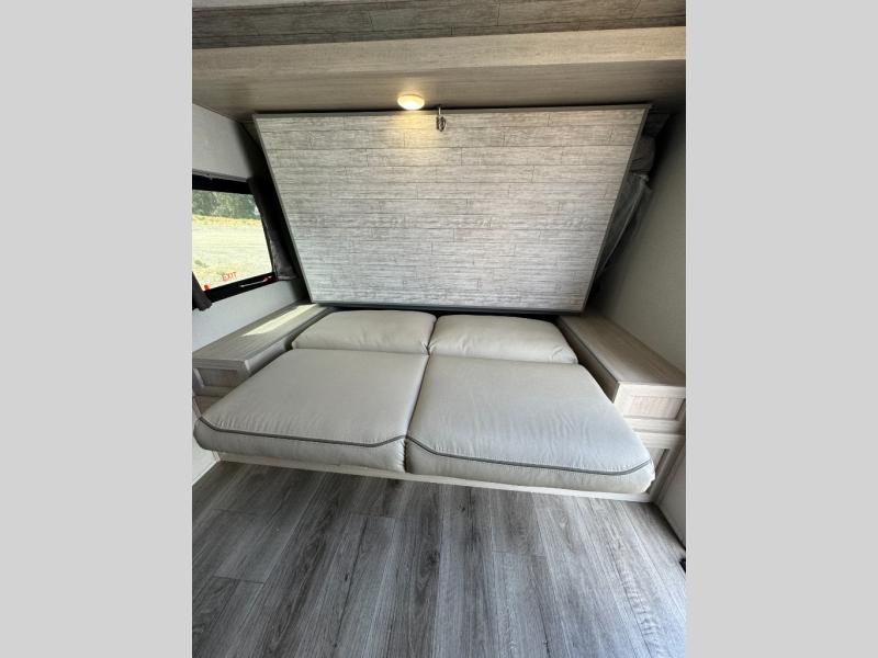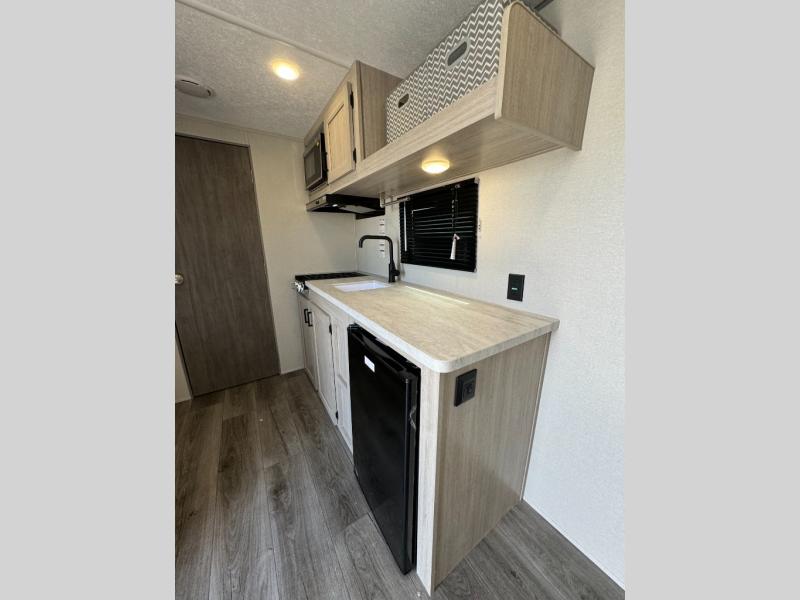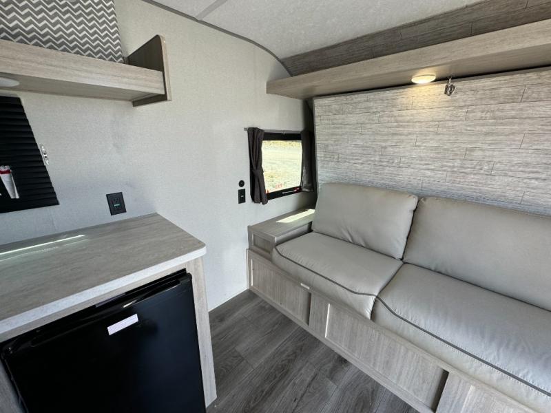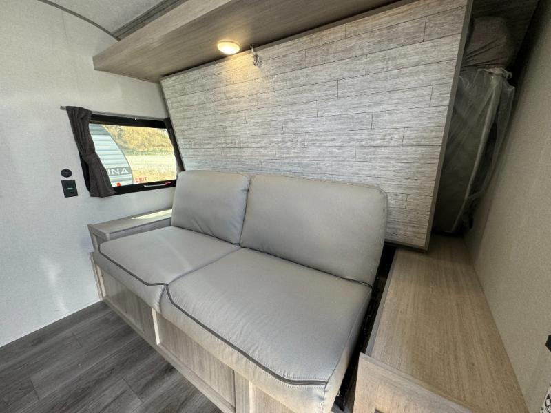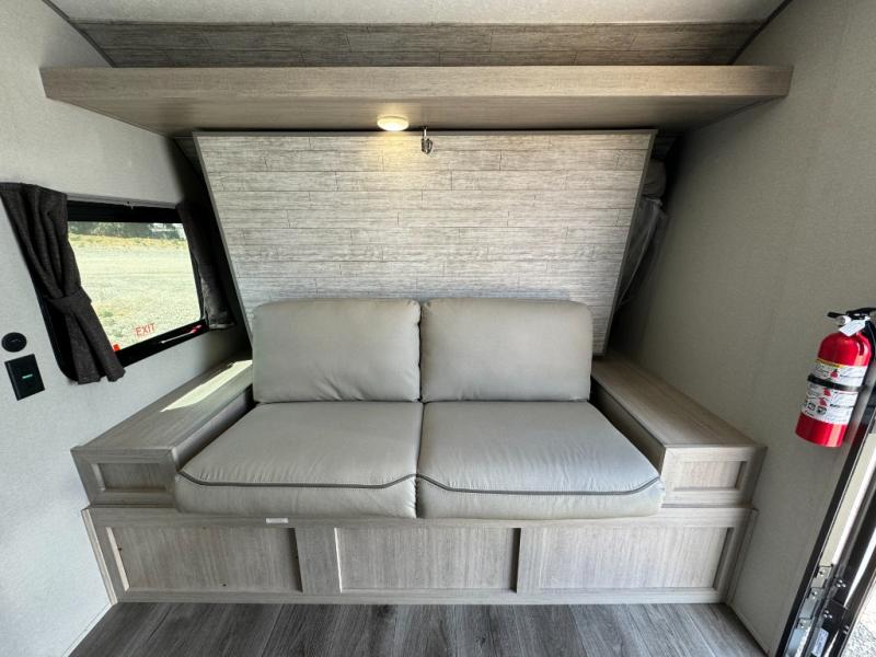 This couple's trailer will be perfect for all your outdoor adventures! There is a 60" x 74" Murphy bed up front with dual nightstands to keep your things tidy, and in the morning, you can fold up the bed to relax on the sofa. The bar top with two stools also includes storage below, plus there is a pantry and overhead storage for even more storage space. A full rear bath includes a 36" x 30" shower, a 12V 14" bath power vent fan, a marine toilet with foot flush, plus a linen closet to keep clean towels close by. This model also includes full kitchen amenities, including a GE two burner cooktop, a GE stainless microwave oven, plus a 3.3 cu. ft. 12V refrigerator to keep food fresh!