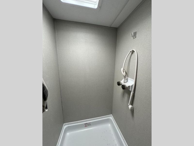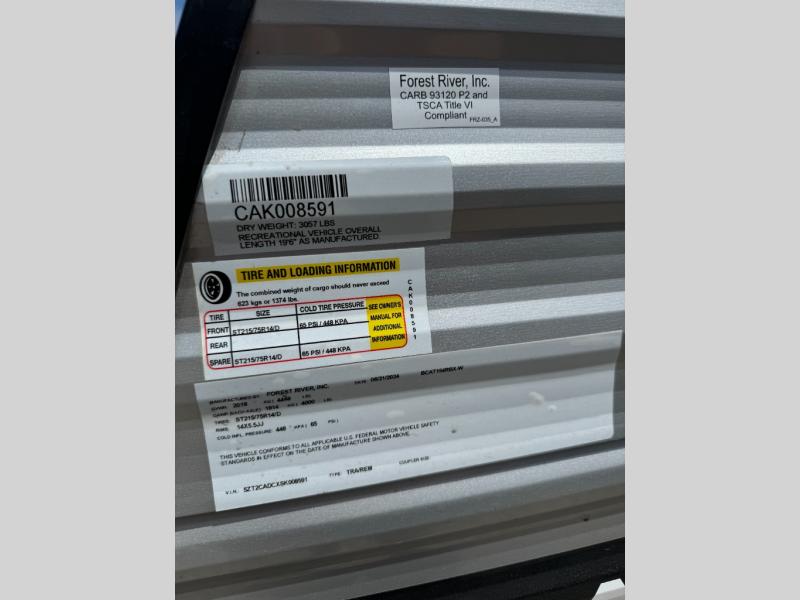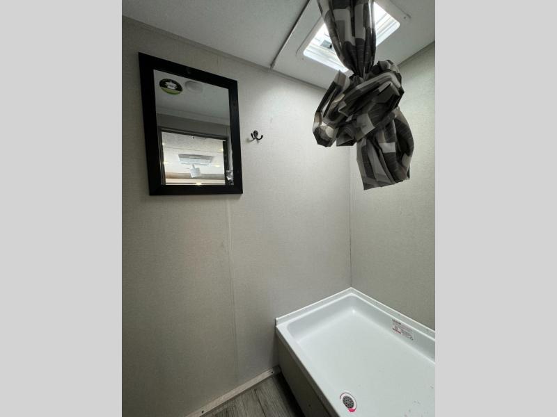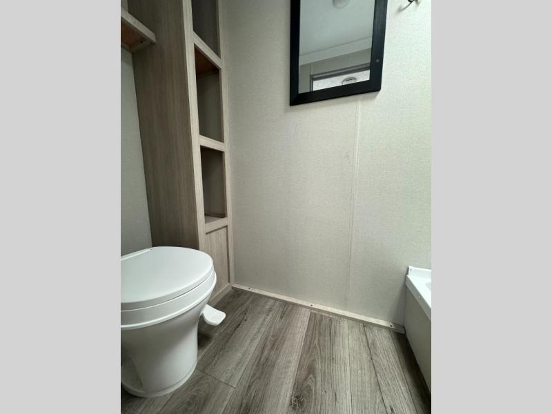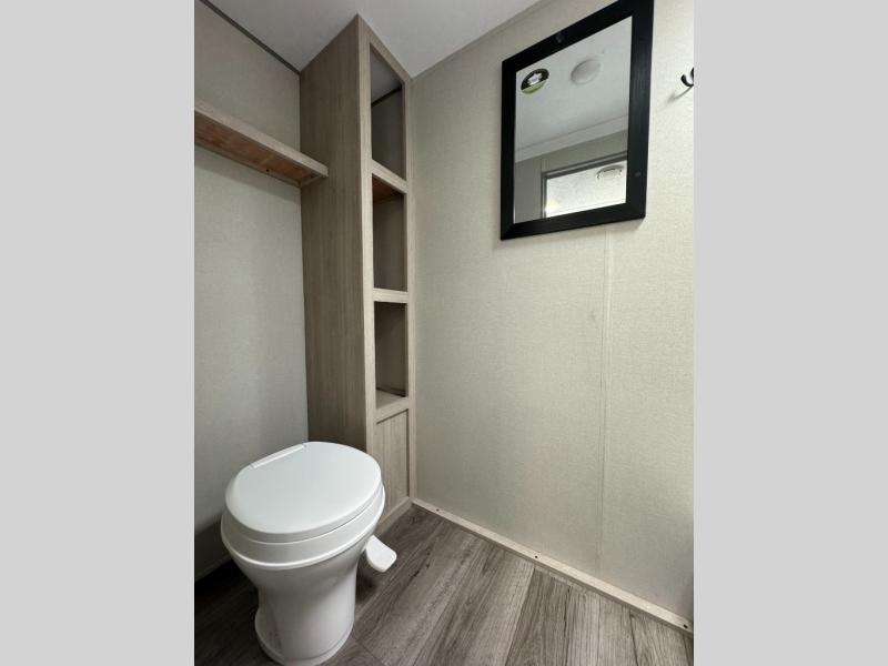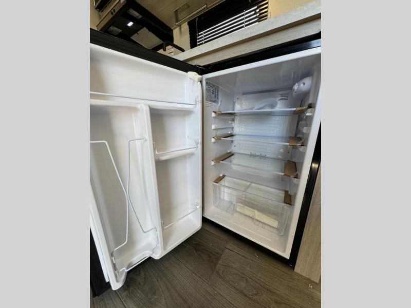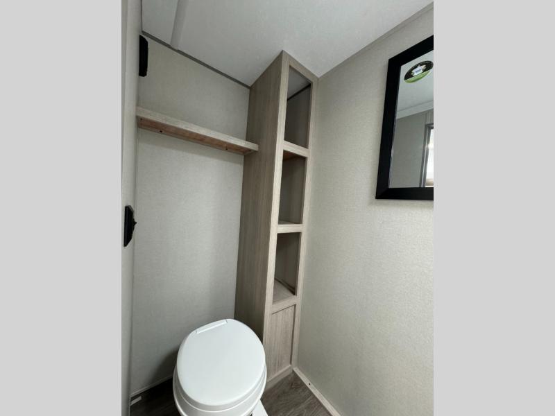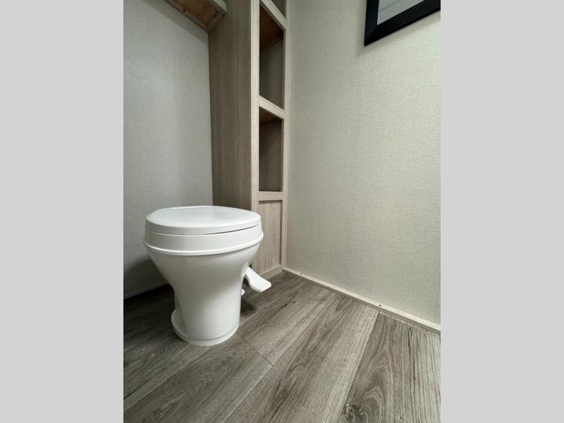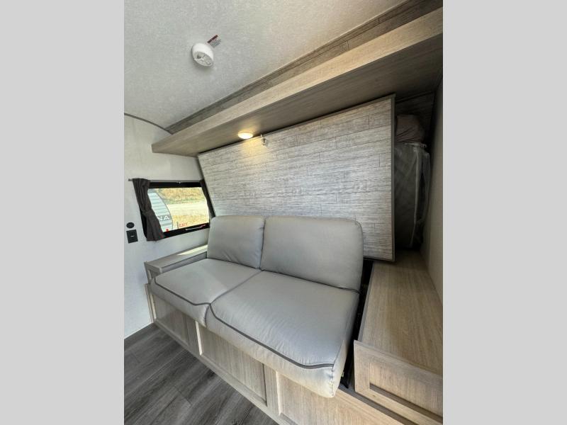 This couple's trailer will be perfect for all your outdoor adventures! There is a 60" x 74" Murphy bed up front with dual nightstands to keep your things tidy, and in the morning, you can fold up the bed to relax on the sofa. The bar top with two stools also includes storage below, plus there is a pantry and overhead storage for even more storage space. A full rear bath includes a 36" x 30" shower, a 12V 14" bath power vent fan, a marine toilet with foot flush, plus a linen closet to keep clean towels close by. This model also includes full kitchen amenities, including a GE two burner cooktop, a GE stainless microwave oven, plus a 3.3 cu. ft. 12V refrigerator to keep food fresh!