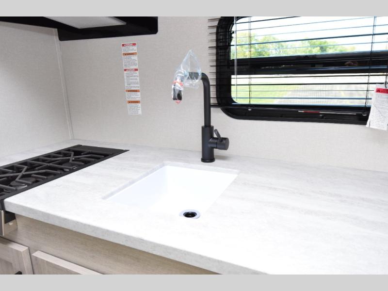 - Seamless Thermofoil Countertops: The seamless Thermofoil countertops throughout the trailer are stylish, durable, and easy to clean.