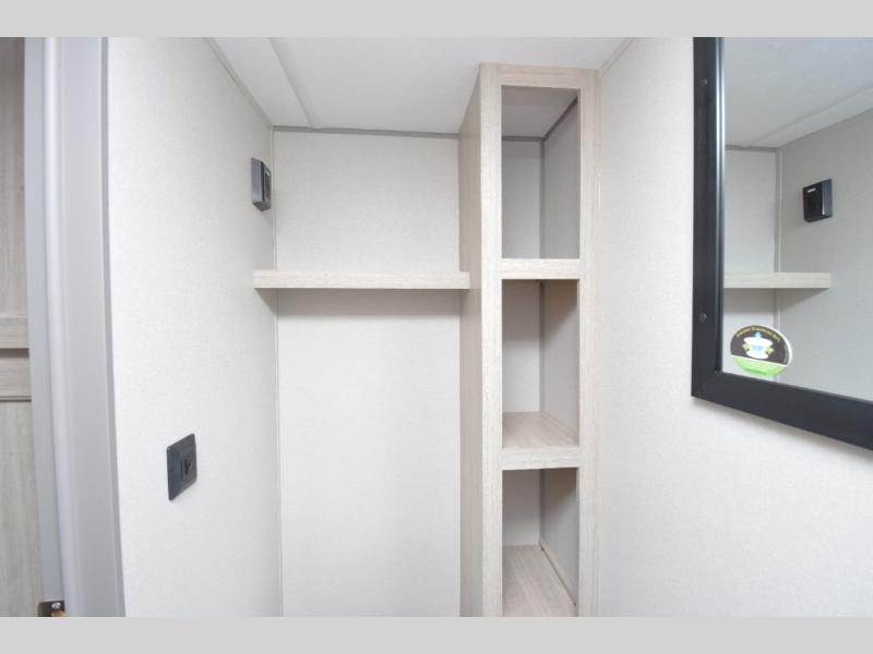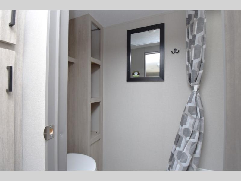 - Full Rear Bath: The 36" x 30" shower, 12V 14" power vent fan, and marine toilet with foot flush in the rear bath offer a private, comfortable space to freshen up. The linen closet keeps your towels close at hand.