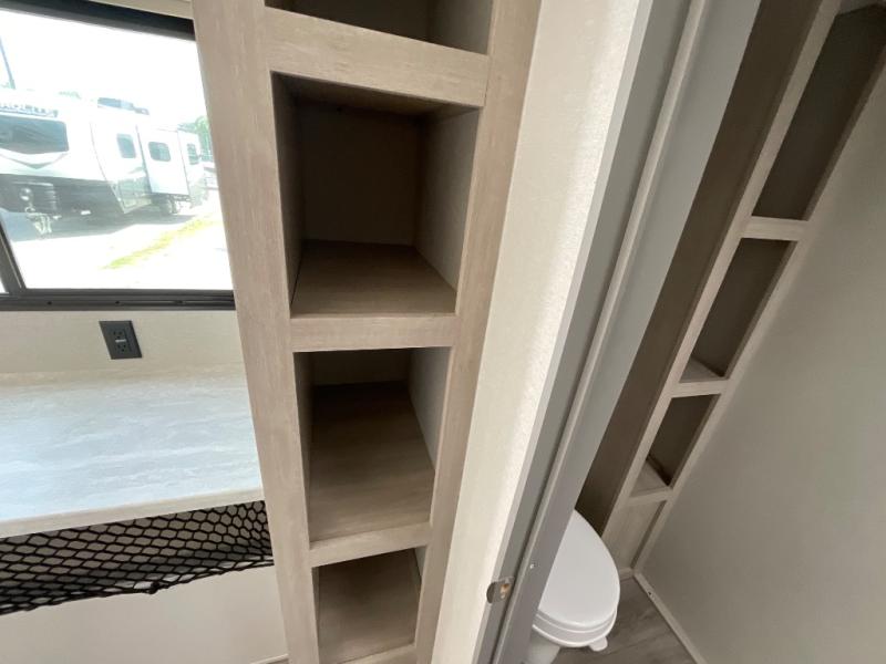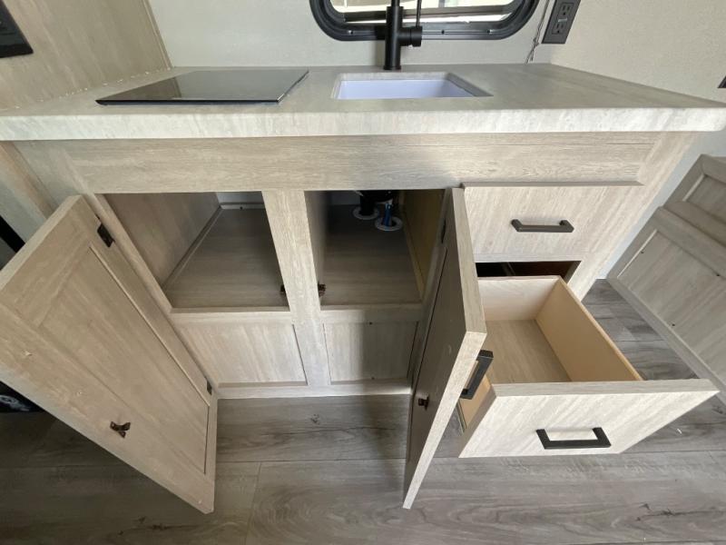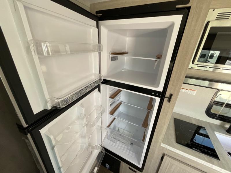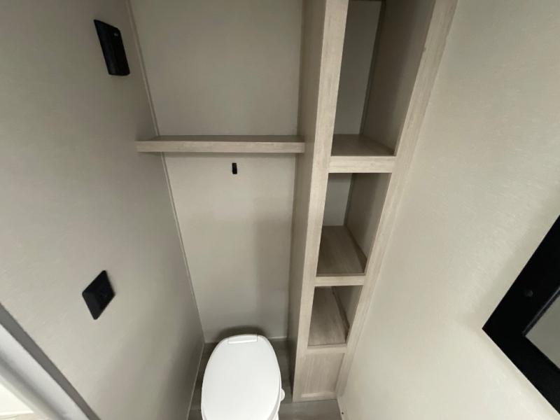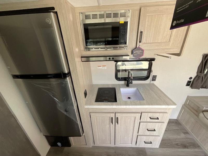 This couple's trailer will be perfect for all your outdoor adventures! There is a 60" x 74" Murphy bed up front with dual nightstands to keep your things tidy, and in the morning, you can fold up the bed to relax on the sofa. The bar top with two stools also includes storage below, plus there is a pantry and overhead storage for even more storage space. A full rear bath includes a 36" x 30" shower, a 12V 14" bath power vent fan, a marine toilet with foot flush, plus a linen closet to keep clean towels close by. This model also includes full kitchen amenities, including a GE two burner cooktop, a GE stainless microwave oven, plus a 3.3 cu. ft. 12V refrigerator to keep food fresh!