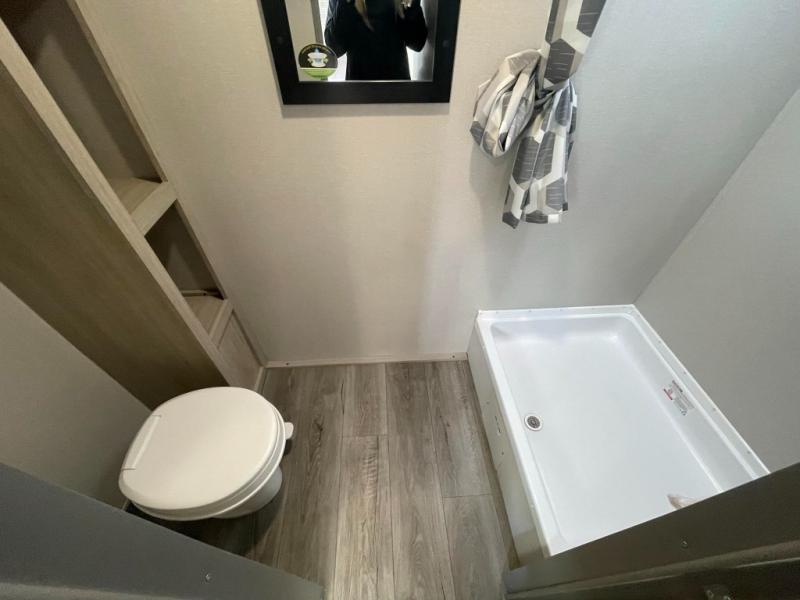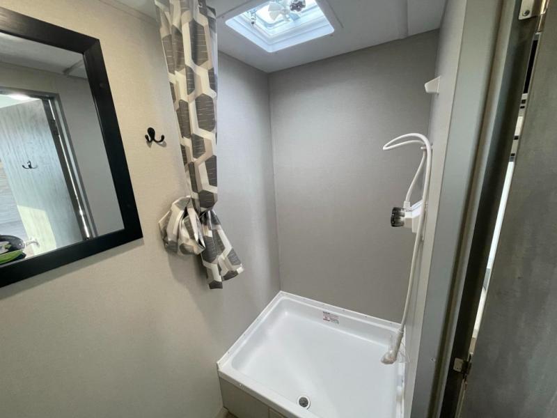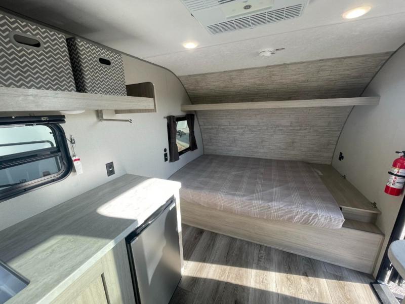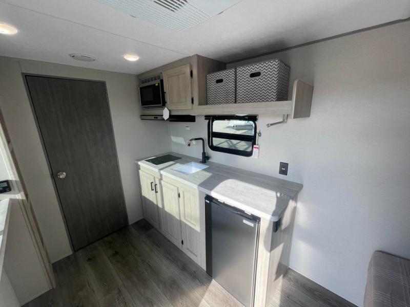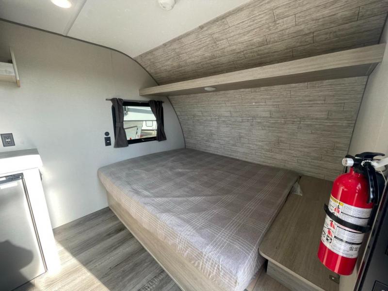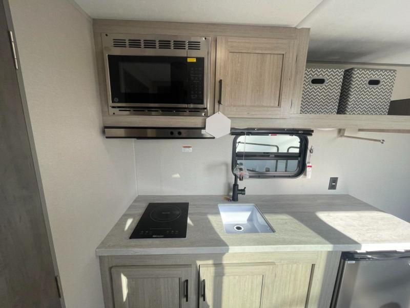 This couple's trailer will be perfect for all your outdoor adventures! There is a 60" x 74" Murphy bed up front with dual nightstands to keep your things tidy, and in the morning, you can fold up the bed to relax on the sofa. The bar top with two stools also includes storage below, plus there is a pantry and overhead storage for even more storage space. A full rear bath includes a 36" x 30" shower, a 12V 14" bath power vent fan, a marine toilet with foot flush, plus a linen closet to keep clean towels close by. This model also includes full kitchen amenities, including a GE two burner cooktop, a GE stainless microwave oven, plus a 3.3 cu. ft. 12V refrigerator to keep food fresh!