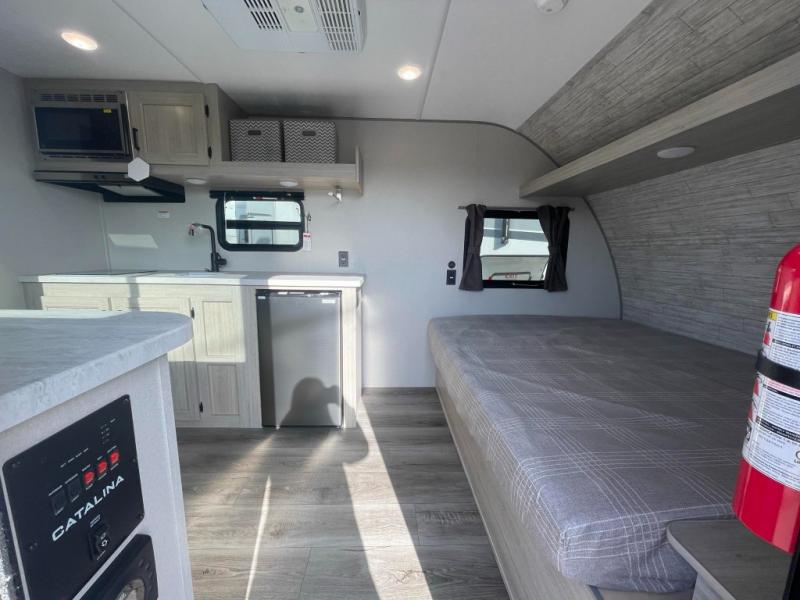 With any Catalina Summit Series 7' by Coachmen RV, you can create an easier adventure with the versatility and simplicity of the shorter lengths and lighter weights! Each includes a premium exterior graphics package, a smooth HD aluminum radius front, and EZ lube axles with leaf spring suspension. The exterior offers a heavy duty standard tongue jack, a diamond plate rock guard to protect against road debris, exterior RG-6 coax cabling and satellite prep, rear view camera prep, and flush mount baggage doors with radius corners for your outdoor gear. Inside, you will enjoy a premium JBL interior speaker, USB charging ports, seamless Thermofoil countertops throughout, a deep basin farm style sink for easy cleanup, and GE kitchen appliances. It's time to choose an affordable and maneuverable single axle trailer today!