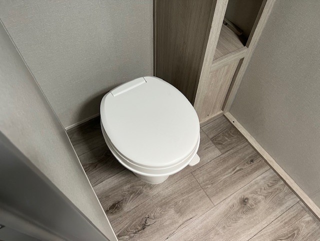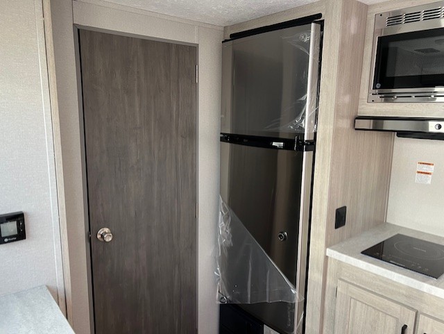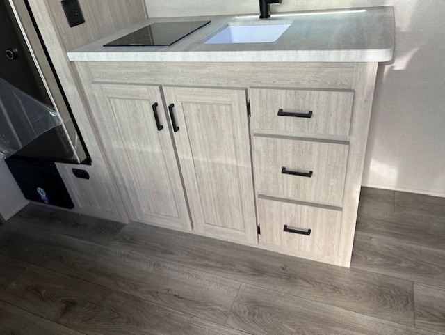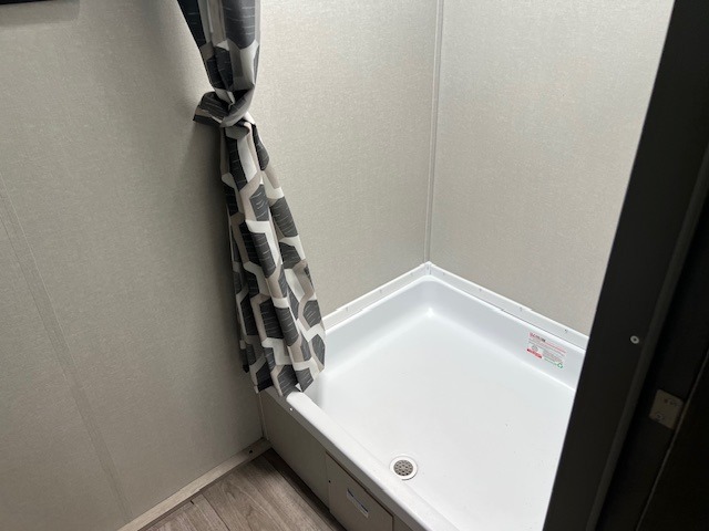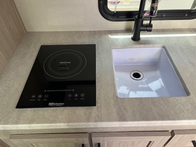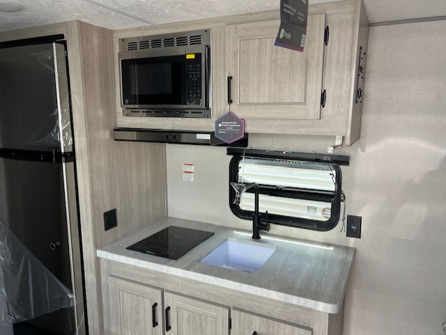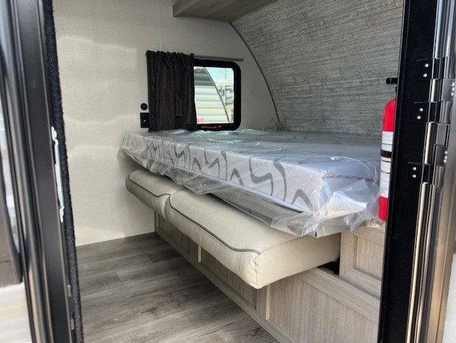 This couple's trailer will be perfect for all your outdoor adventures! There is a 60" x 74" Murphy bed up front with dual nightstands to keep your things tidy, and in the morning, you can fold up the bed to relax on the sofa. The bar top with two stools also includes storage below, plus there is a pantry and overhead storage for even more storage space. A full rear bath includes a 36" x 30" shower, a 12V 14" bath power vent fan, a marine toilet with foot flush, plus a linen closet to keep clean towels close by. This model also includes full kitchen amenities, including a GE two burner cooktop, a GE stainless microwave oven, plus a 3.3 cu. ft. 12V refrigerator to keep food fresh!