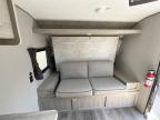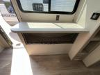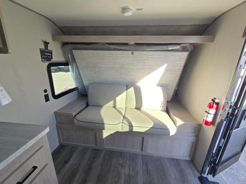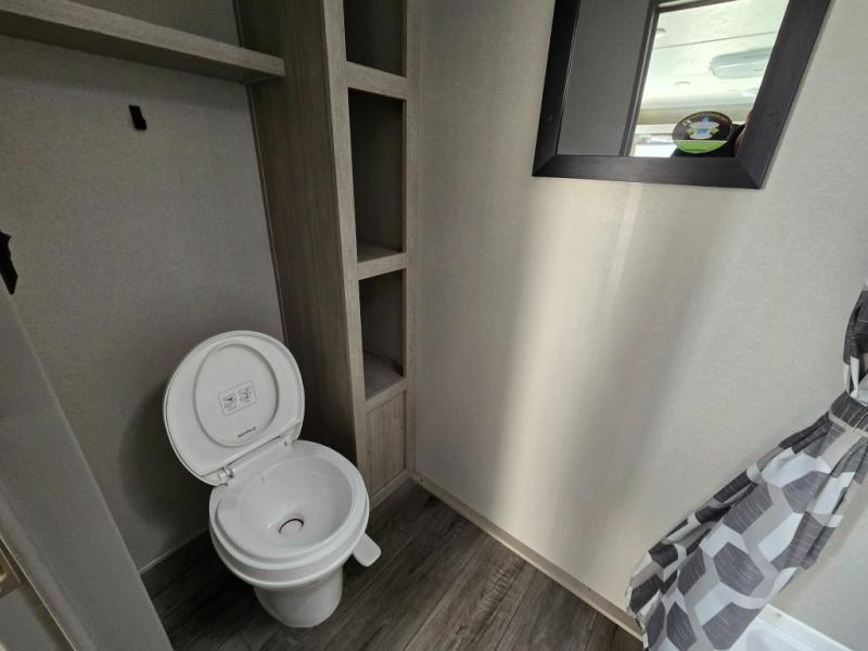 This couple's trailer will be perfect for all your outdoor adventures! There is a 60" x 74" Murphy bed up front with dual nightstands to keep your things tidy, and in the morning, you can fold up the bed to relax on the sofa. The bar top with two stools also includes storage below, plus there is a pantry and overhead storage for even more storage space. A full rear bath includes a 36" x 30" shower, a 12V 14" bath power vent fan, a marine toilet with foot flush, plus a linen closet to keep clean towels close by. This model also includes full kitchen amenities, including a GE two burner cooktop, a GE stainless microwave oven, plus a 3.3 cu. ft. 12V refrigerator to keep food fresh!