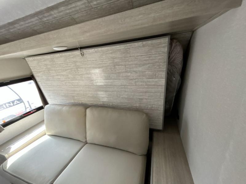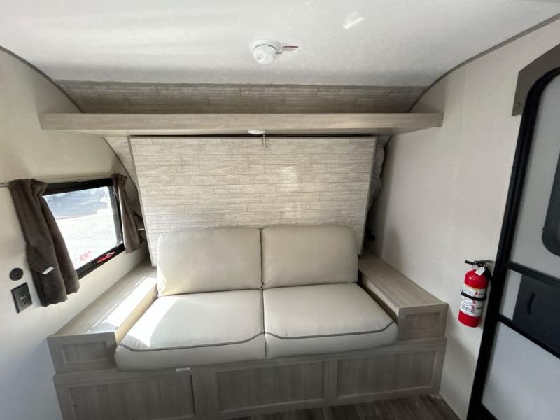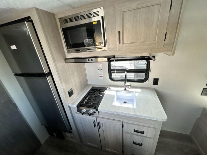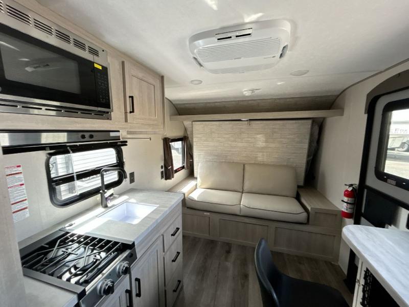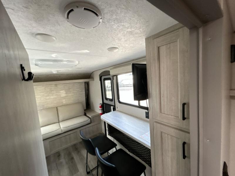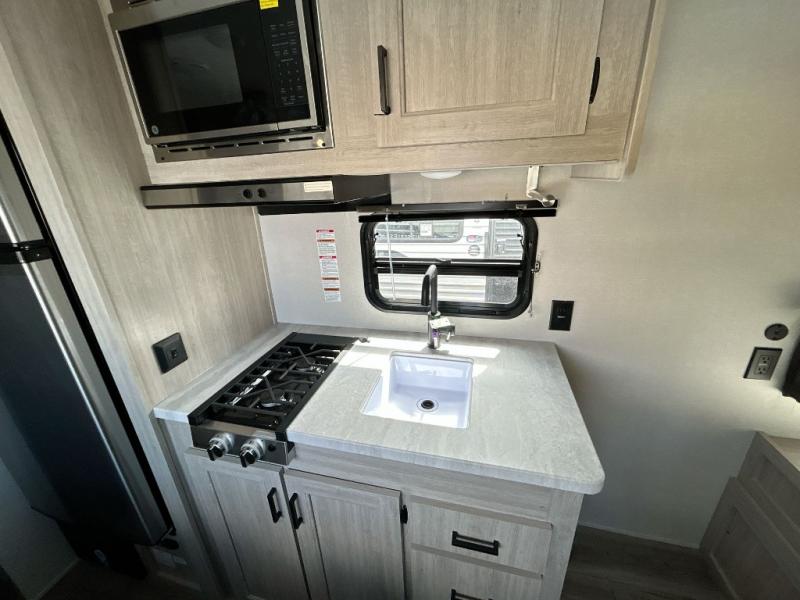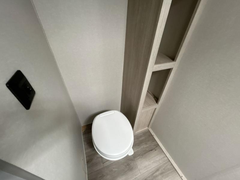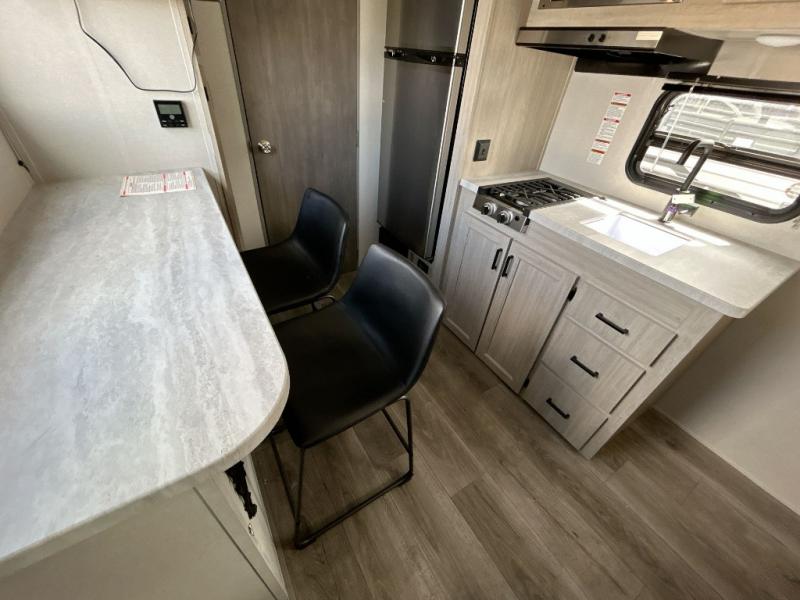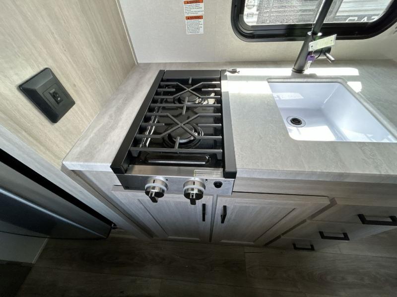 This couple's trailer will be perfect for all your outdoor adventures! There is a 60" x 74" Murphy bed up front with dual nightstands to keep your things tidy, and in the morning, you can fold up the bed to relax on the sofa. The bar top with two stools also includes storage below, plus there is a pantry and overhead storage for even more storage space. A full rear bath includes a 36" x 30" shower, a 12V 14" bath power vent fan, a marine toilet with foot flush, plus a linen closet to keep clean towels close by. This model also includes full kitchen amenities, including a GE two burner cooktop, a GE stainless microwave oven, plus a 3.3 cu. ft. 12V refrigerator to keep food fresh!