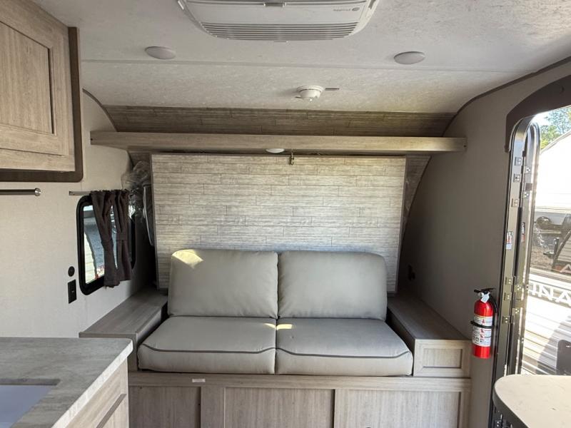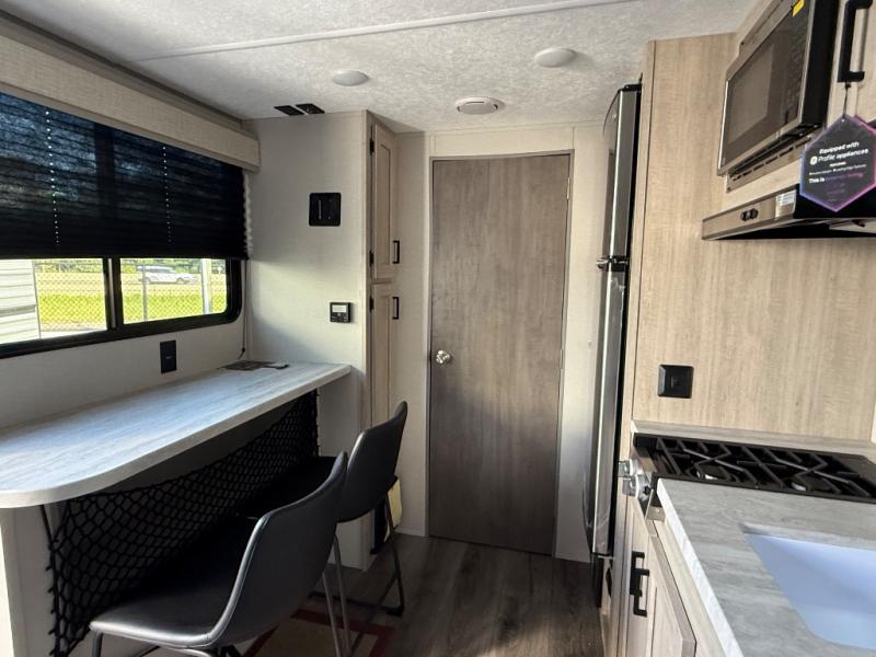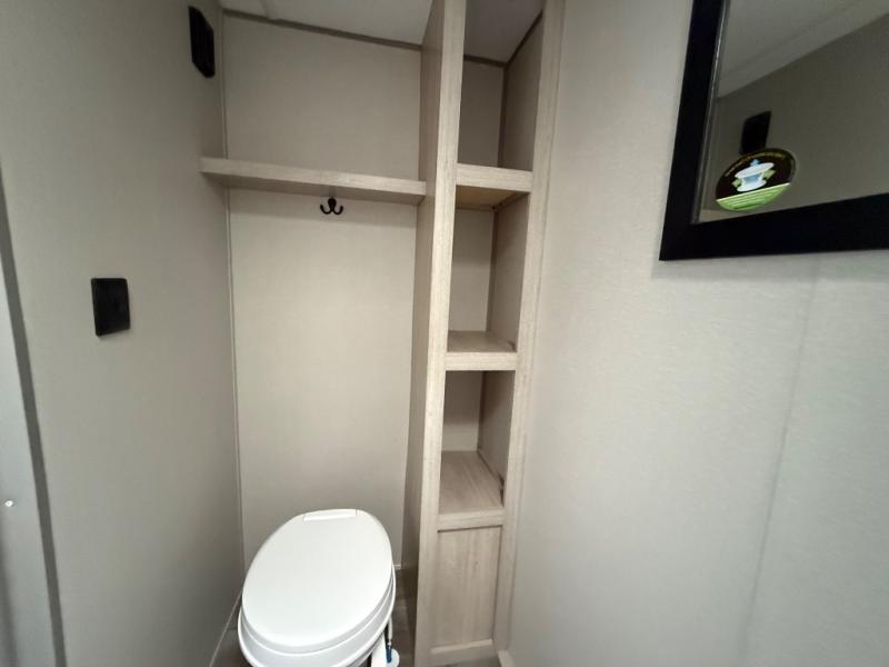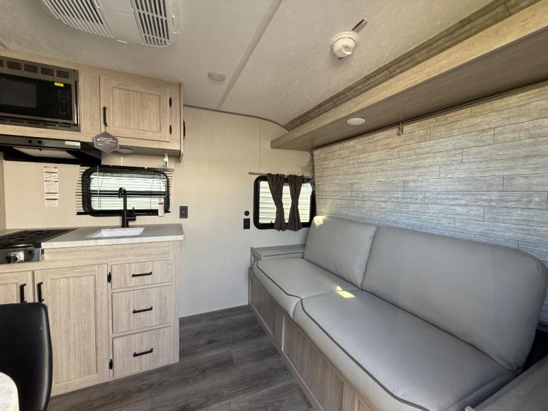 This couple's trailer will be perfect for all your outdoor adventures! There is a 60" x 74" Murphy bed up front with dual nightstands to keep your things tidy, and in the morning, you can fold up the bed to relax on the sofa. The bar top with two stools also includes storage below, plus there is a pantry and overhead storage for even more storage space. A full rear bath includes a 36" x 30" shower, a 12V 14" bath power vent fan, a marine toilet with foot flush, plus a linen closet to keep clean towels close by. This model also includes full kitchen amenities, including a GE two burner cooktop, a GE stainless microwave oven, plus a 3.3 cu. ft. 12V refrigerator to keep food fresh!