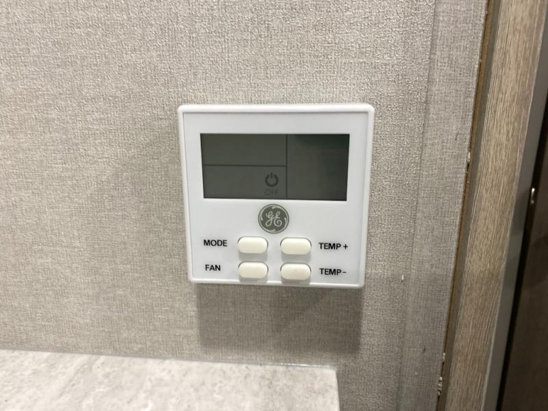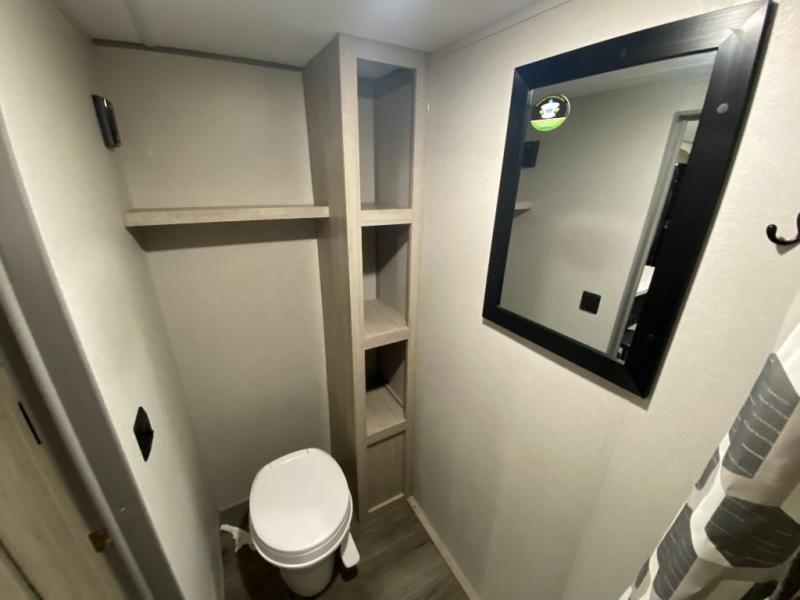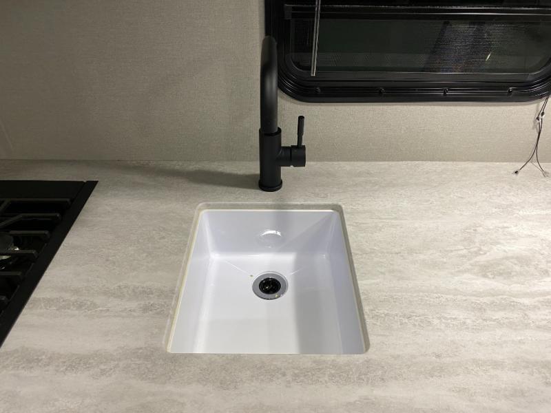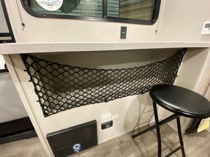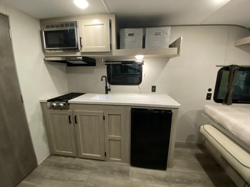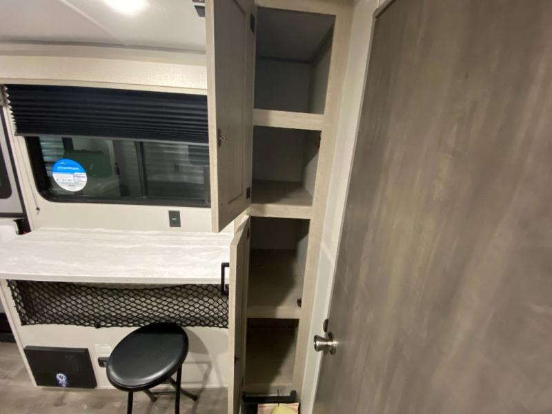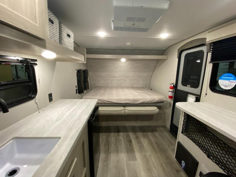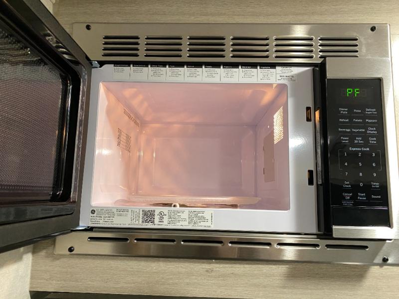 This couple's trailer will be perfect for all your outdoor adventures! There is a 60" x 74" Murphy bed up front with dual nightstands to keep your things tidy, and in the morning, you can fold up the bed to relax on the sofa. The bar top with two stools also includes storage below, plus there is a pantry and overhead storage for even more storage space. A full rear bath includes a 36" x 30" shower, a 12V 14" bath power vent fan, a marine toilet with foot flush, plus a linen closet to keep clean towels close by. This model also includes full kitchen amenities, including a GE two burner cooktop, a GE stainless microwave oven, plus a 3.3 cu. ft. 12V refrigerator to keep food fresh!