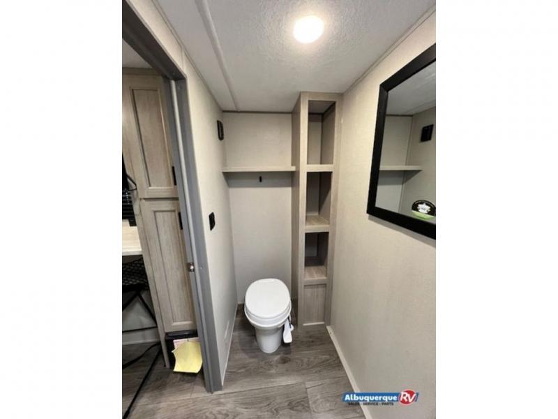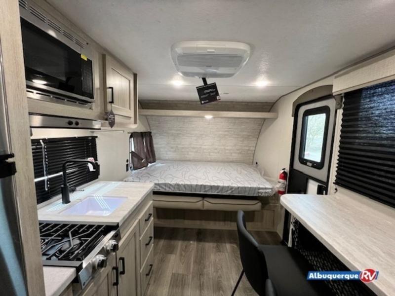 This couple's trailer will be perfect for all your outdoor adventures! There is a 60" x 74" Murphy bed up front with dual nightstands to keep your things tidy, and in the morning, you can fold up the bed to relax on the sofa. The bar top with two stools also includes storage below, plus there is a pantry and overhead storage for even more storage space. A full rear bath includes a 36" x 30" shower, a 12V 14" bath power vent fan, a marine toilet with foot flush, plus a linen closet to keep clean towels close by. This model also includes full kitchen amenities, including a GE two burner cooktop, a GE stainless microwave oven, plus a 3.3 cu. ft. 12V refrigerator to keep food fresh!