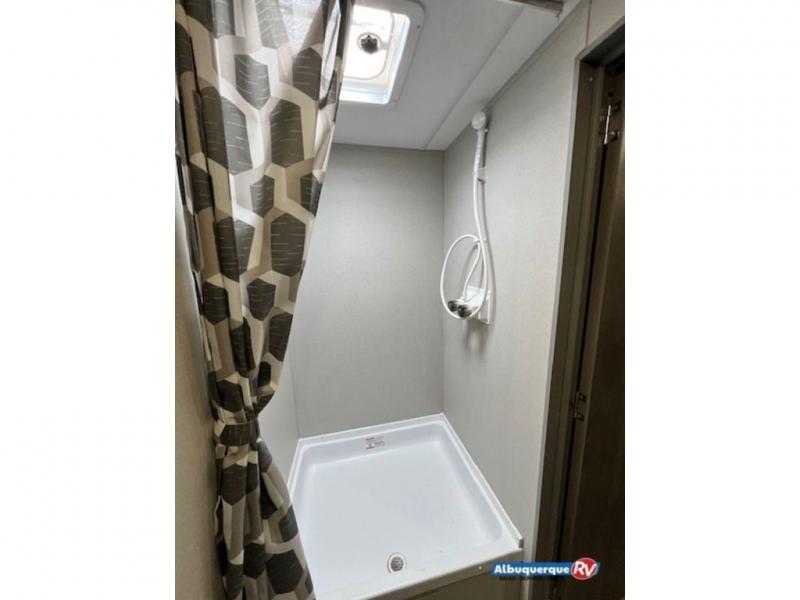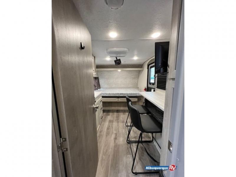 This couple's trailer will be perfect for all your outdoor adventures! There is a 60" x 74" Murphy bed up front with dual nightstands to keep your things tidy, and in the morning, you can fold up the bed to relax on the sofa. The bar top with two stools also includes storage below, plus there is a pantry and overhead storage for even more storage space. A full rear bath includes a 36" x 30" shower, a 12V 14" bath power vent fan, a marine toilet with foot flush, plus a linen closet to keep clean towels close by. This model also includes full kitchen amenities, including a GE two burner cooktop, a GE stainless microwave oven, plus a 3.3 cu. ft. 12V refrigerator to keep food fresh!