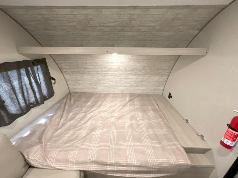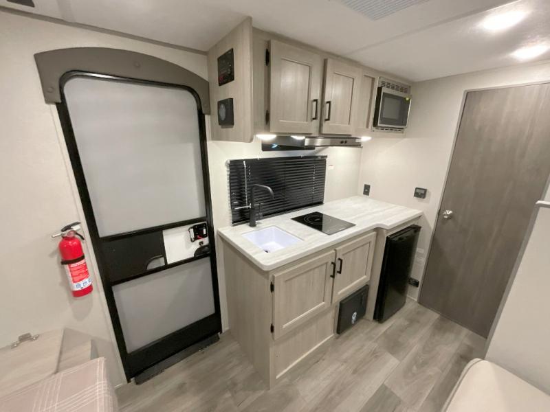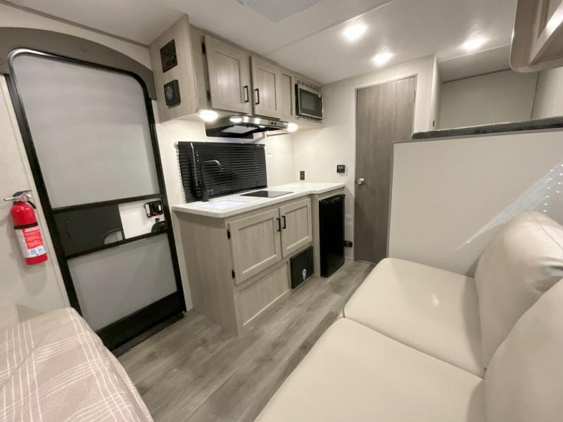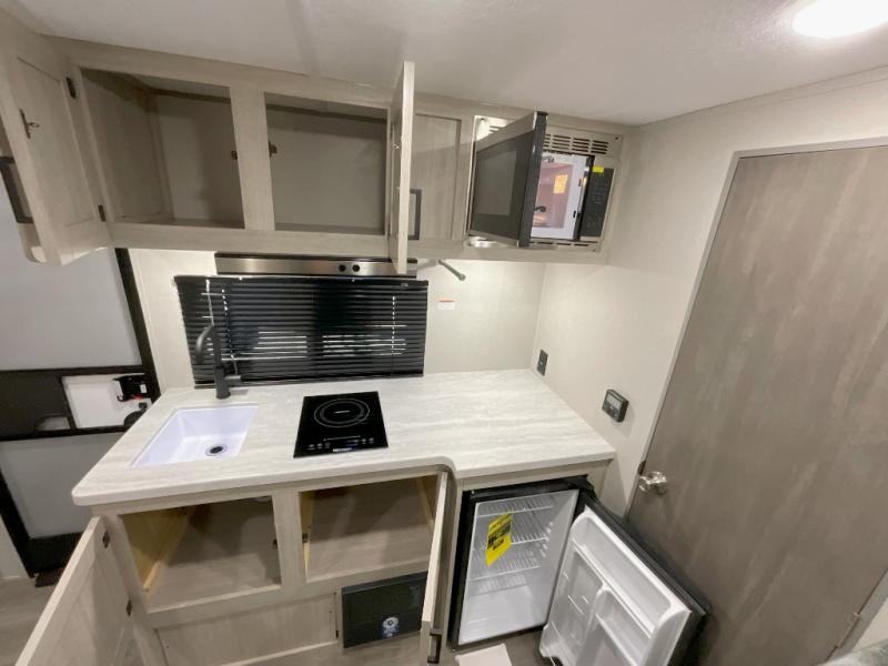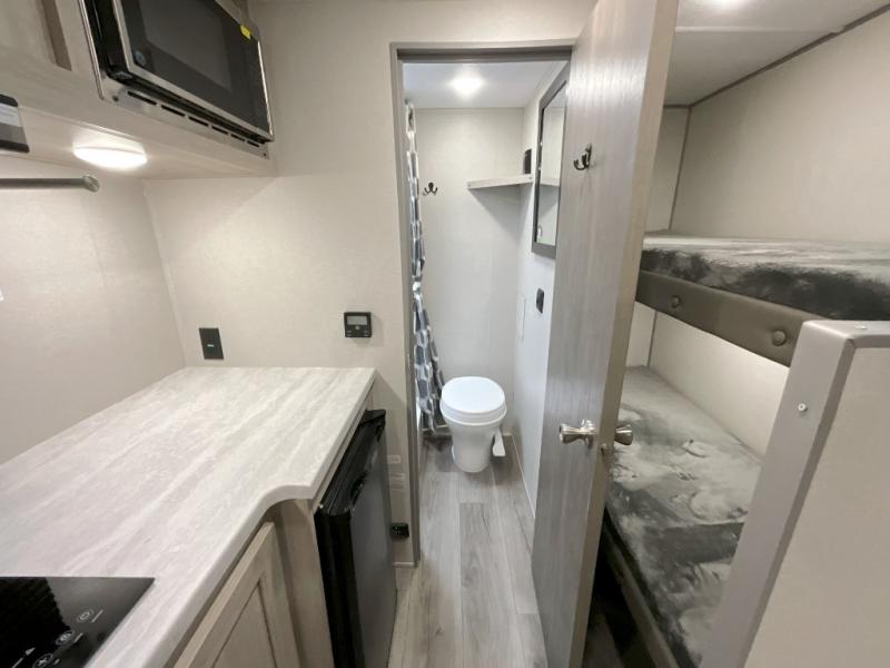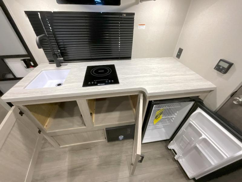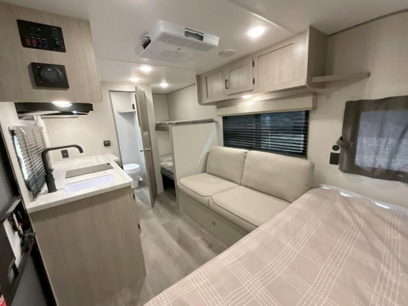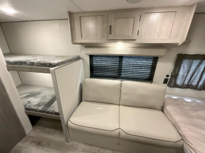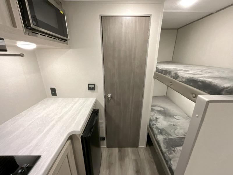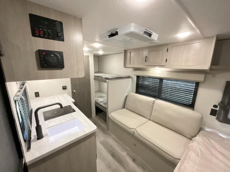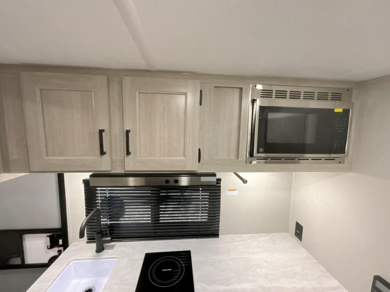 This travel trailers is perfect for a young family or smaller group. You can easily sleep four or more with the rear set of bunk beds and queen bed up front. There is also a 60" sofa for inside down-time, as well as complete kitchen and bath amenities so you can cook and stay clean while traveling. The rear corner bath features a toilet and 36" x 30" shower, and it's conveniently located next to the bunk beds which is great for little ones at night. Cooking inside will be easy with a GE stainless two-burner cooktop and single sink, plus there is also a GE microwave oven for snacks and things that you can easily warm up. If you plan to spend most of your time outdoors, you will find plenty of storage space in the front exterior storage compartment, and there is also plenty of storage inside as well.