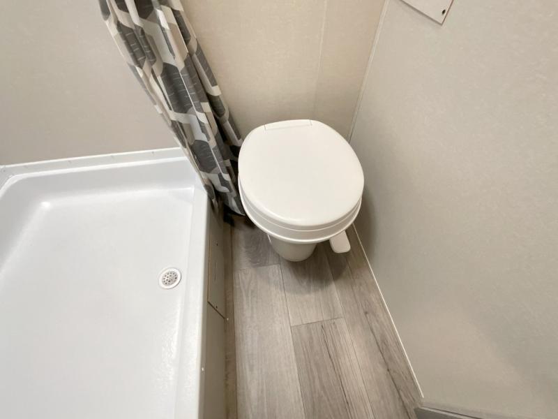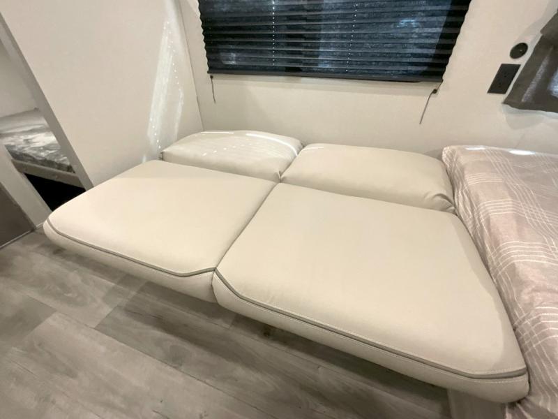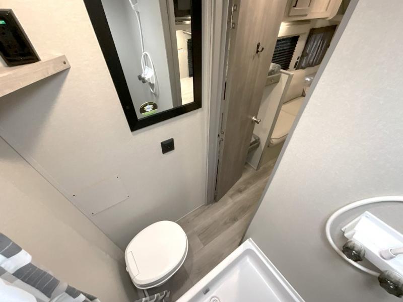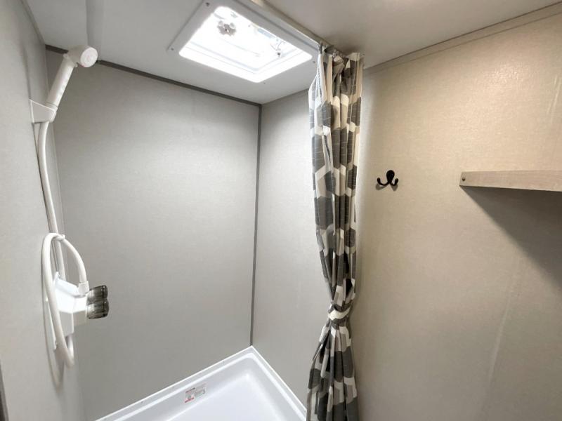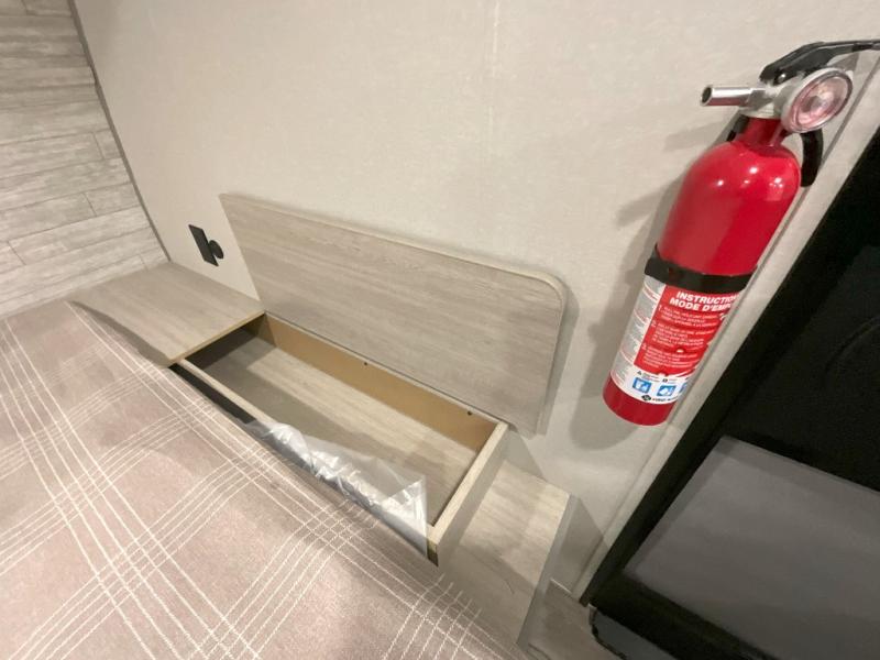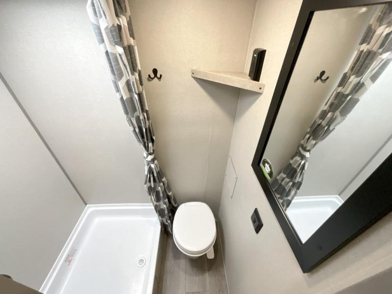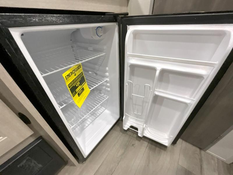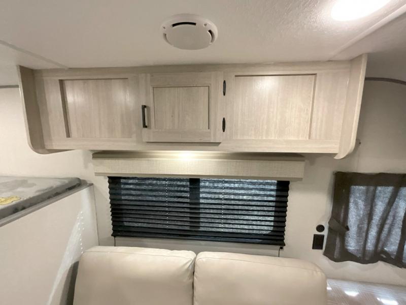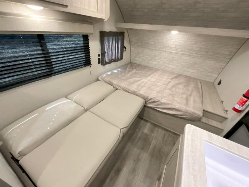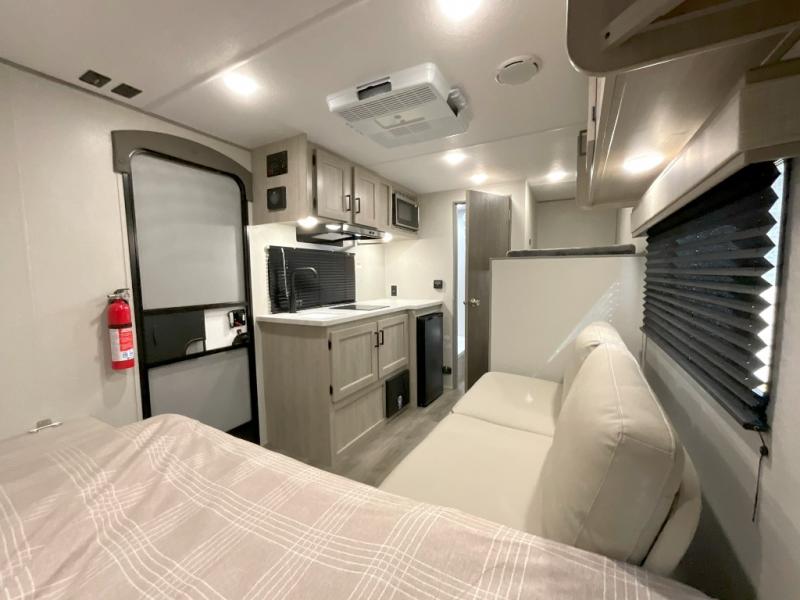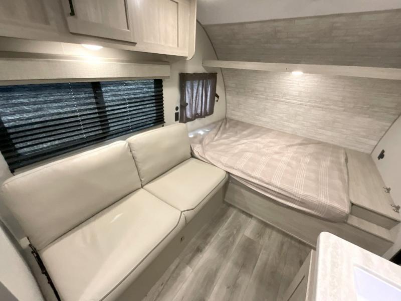 This travel trailers is perfect for a young family or smaller group. You can easily sleep four or more with the rear set of bunk beds and queen bed up front. There is also a 60" sofa for inside down-time, as well as complete kitchen and bath amenities so you can cook and stay clean while traveling. The rear corner bath features a toilet and 36" x 30" shower, and it's conveniently located next to the bunk beds which is great for little ones at night. Cooking inside will be easy with a GE stainless two-burner cooktop and single sink, plus there is also a GE microwave oven for snacks and things that you can easily warm up. If you plan to spend most of your time outdoors, you will find plenty of storage space in the front exterior storage compartment, and there is also plenty of storage inside as well.