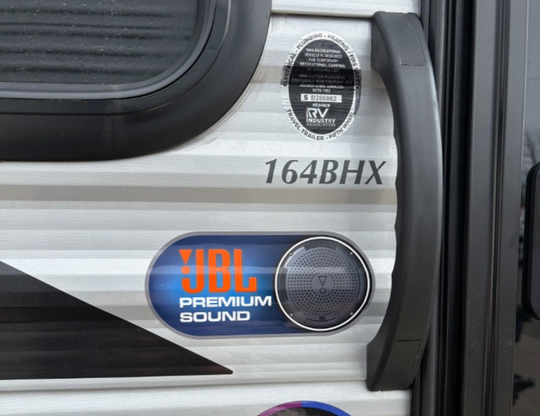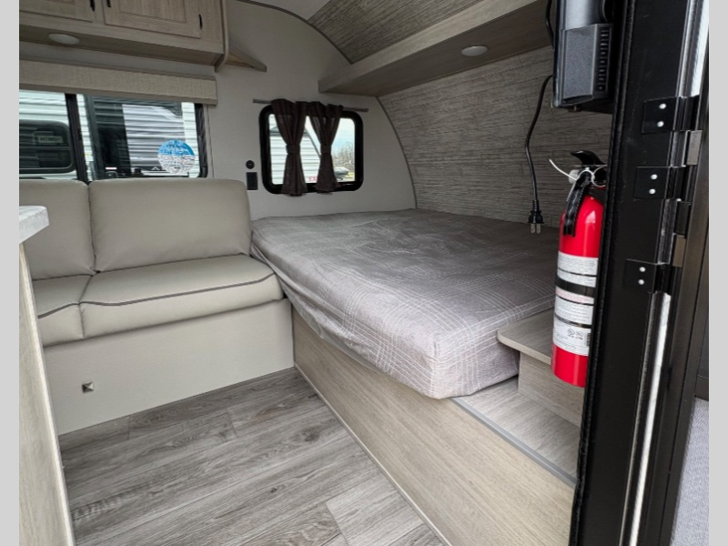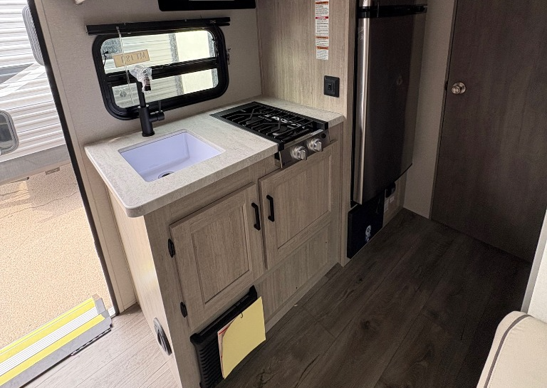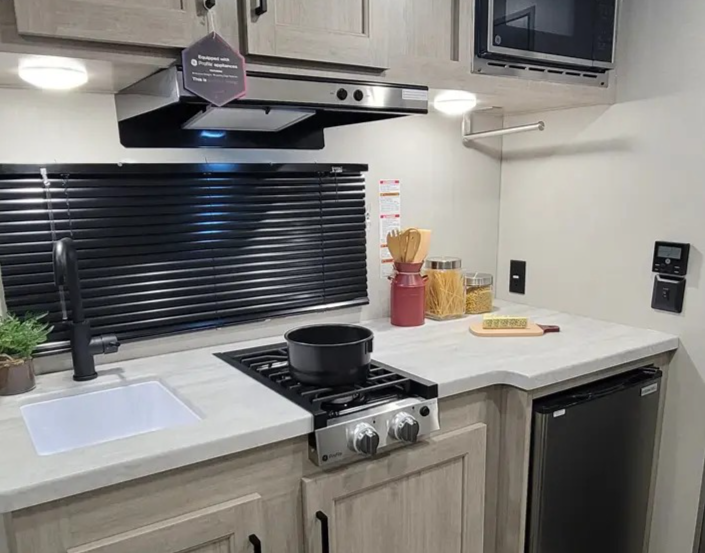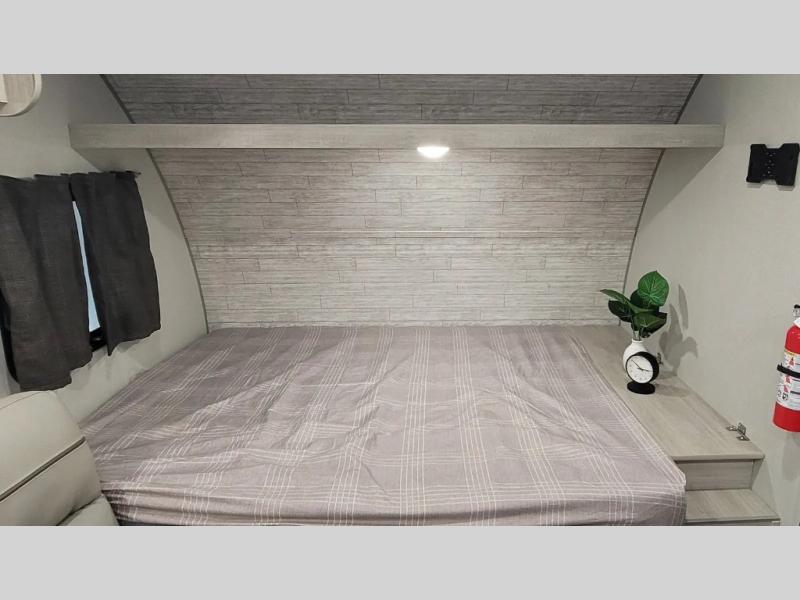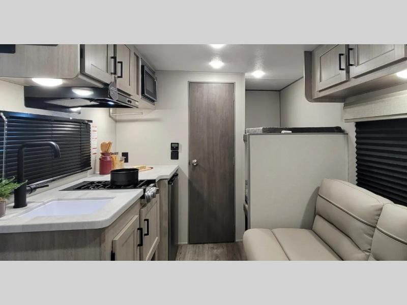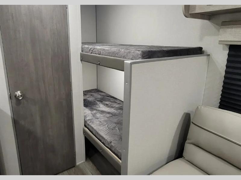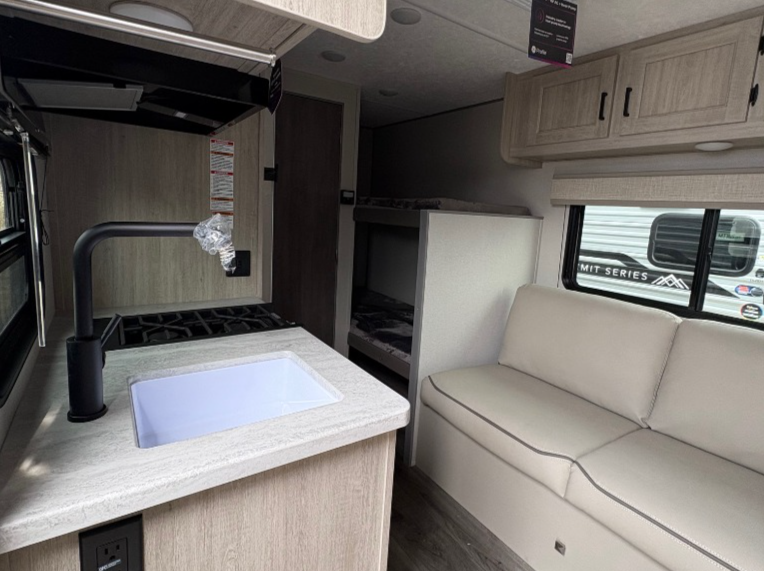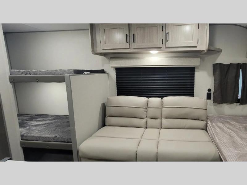 This travel trailers is perfect for a young family or smaller group. You can easily sleep four or more with the rear set of bunk beds and queen bed up front. There is also a 60" sofa for inside down-time, as well as complete kitchen and bath amenities so you can cook and stay clean while traveling. The rear corner bath features a toilet and 36" x 30" shower, and it's conveniently located next to the bunk beds which is great for little ones at night. Cooking inside will be easy with a GE stainless two-burner cooktop and single sink, plus there is also a GE microwave oven for snacks and things that you can easily warm up. If you plan to spend most of your time outdoors, you will find plenty of storage space in the front exterior storage compartment, and there is also plenty of storage inside as well.