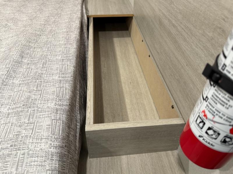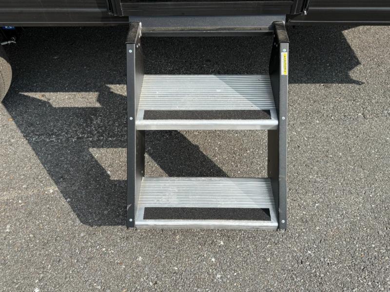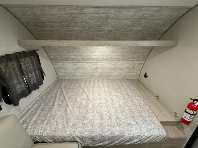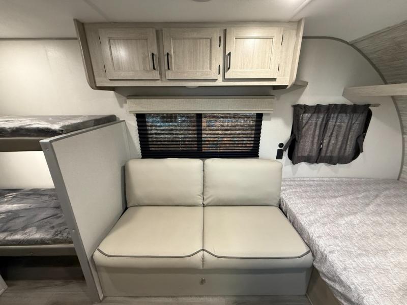 Bunk Beds, Sofa, Front Queen Bed, Rear Bath, Exterior Storage, Overhead Cabinets, Two Burner Cooktop.