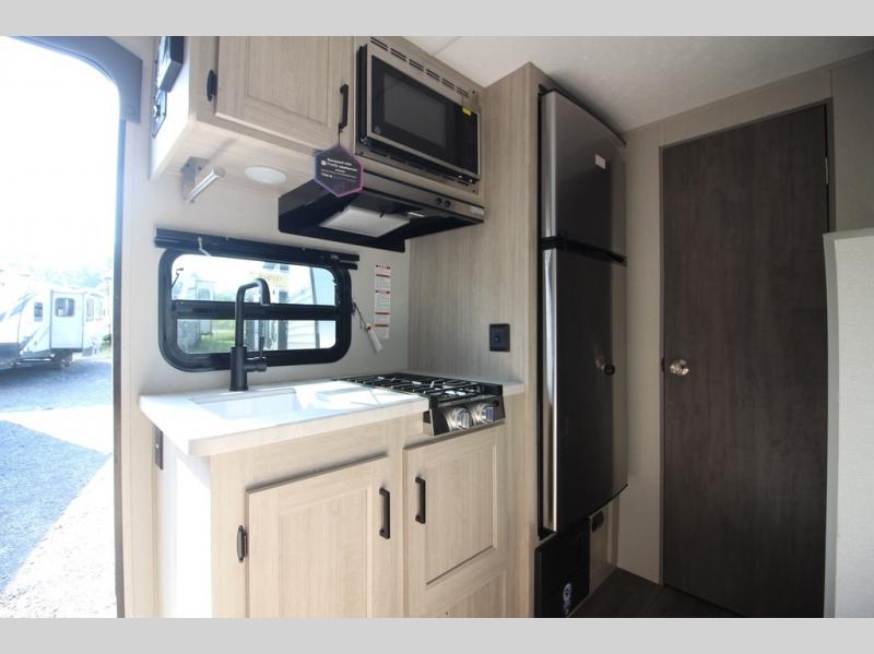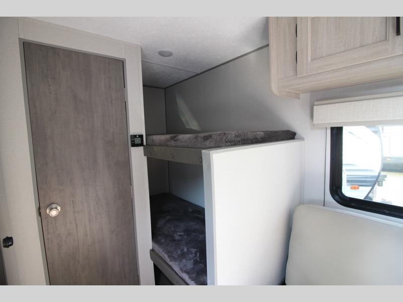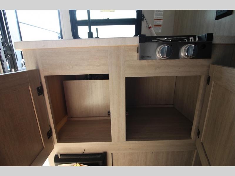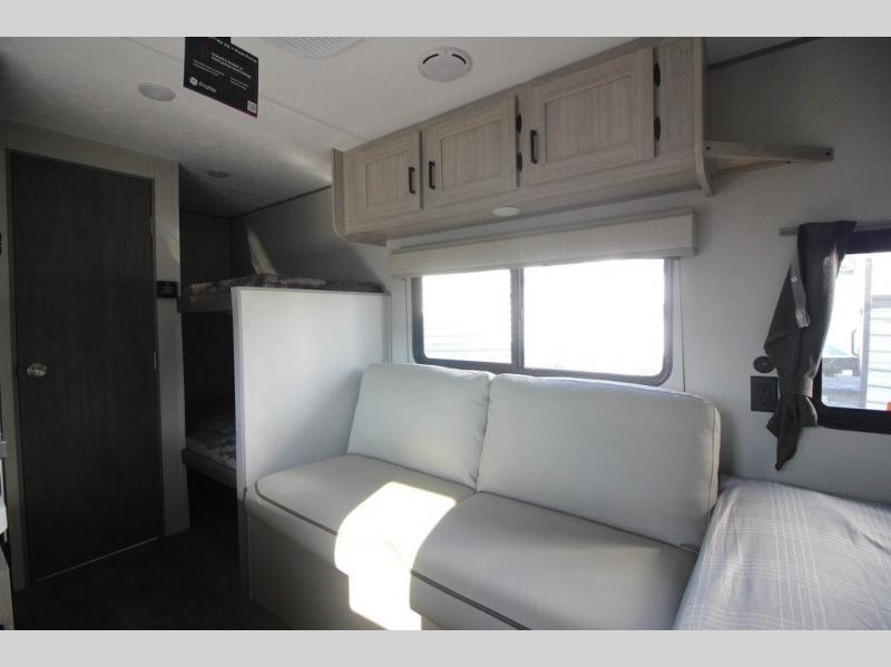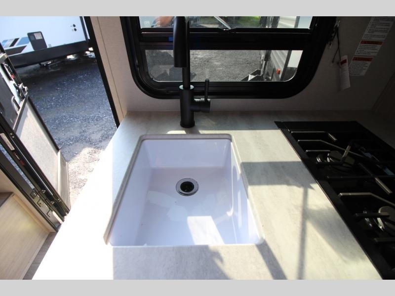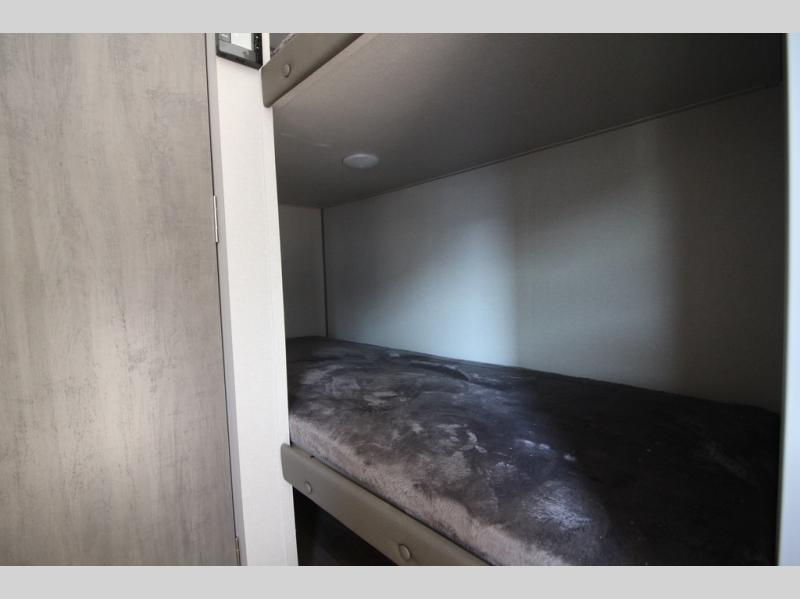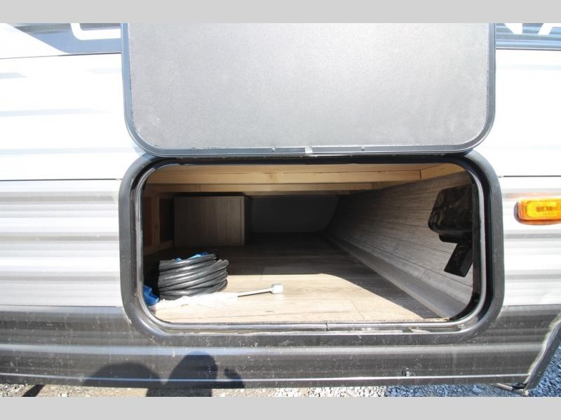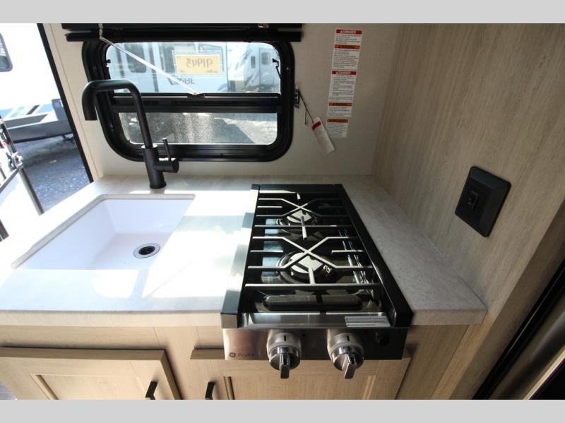 This travel trailers is perfect for a young family or smaller group. You can easily sleep four or more with the rear set of bunk beds and queen bed up front. There is also a 60" sofa for inside down-time, as well as complete kitchen and bath amenities so you can cook and stay clean while traveling. The rear corner bath features a toilet and 36" x 30" shower, and it's conveniently located next to the bunk beds which is great for little ones at night. Cooking inside will be easy with a GE stainless two-burner cooktop and single sink, plus there is also a GE microwave oven for snacks and things that you can easily warm up. If you plan to spend most of your time outdoors, you will find plenty of storage space in the front exterior storage compartment, and there is also plenty of storage inside as well.