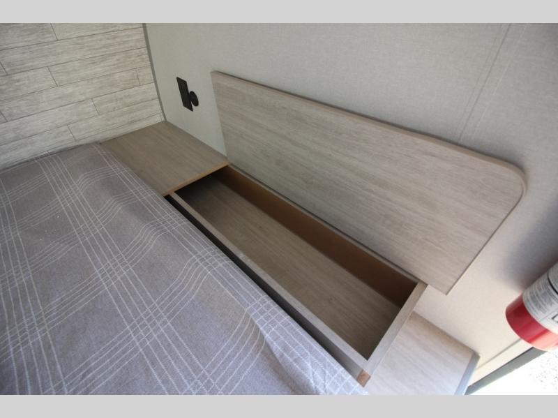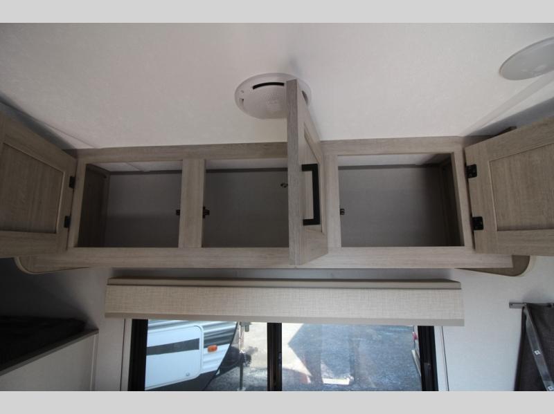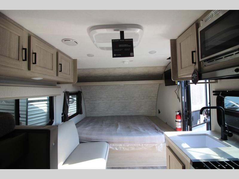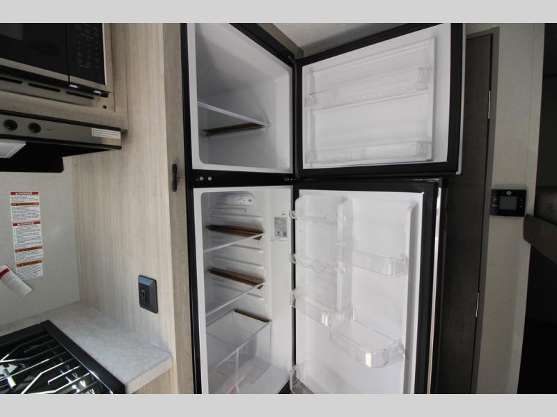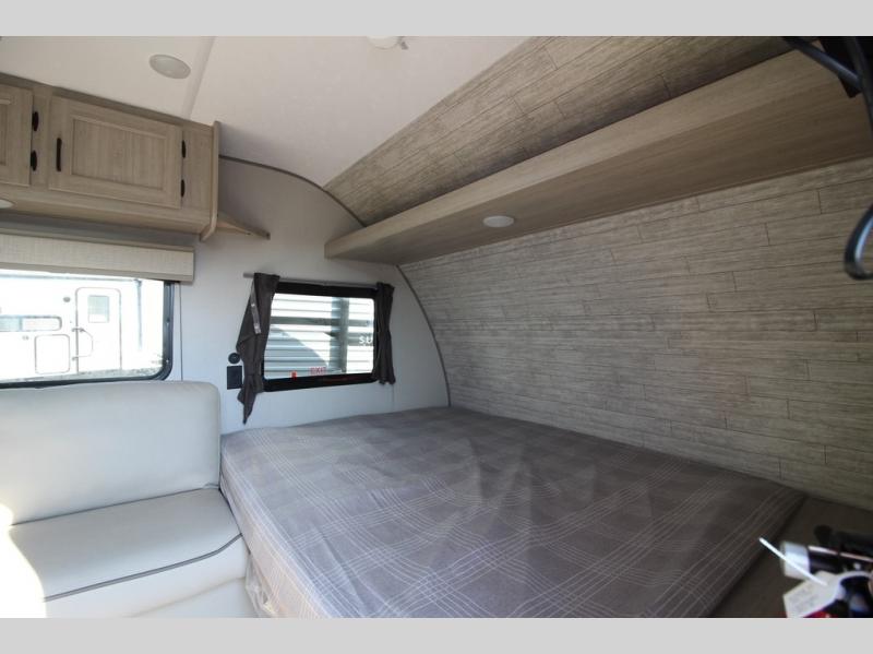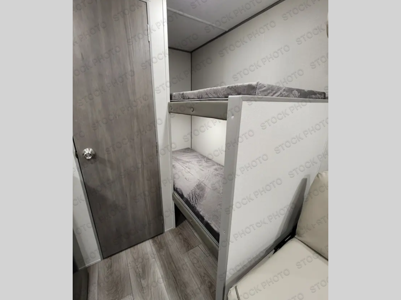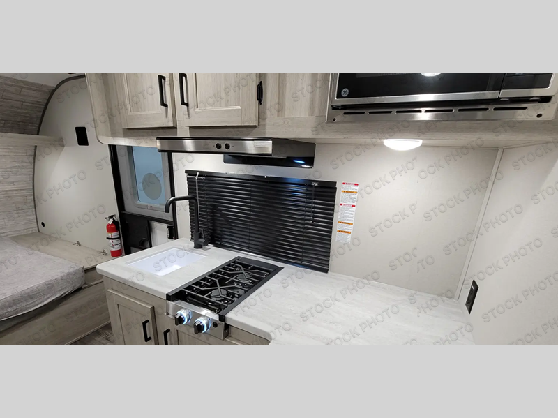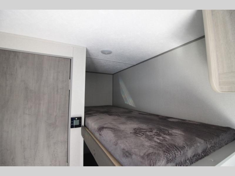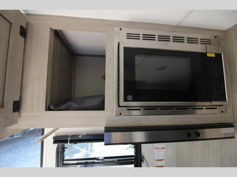 This travel trailers is perfect for a young family or smaller group. You can easily sleep four or more with the rear set of bunk beds and queen bed up front. There is also a 60" sofa for inside down-time, as well as complete kitchen and bath amenities so you can cook and stay clean while traveling. The rear corner bath features a toilet and 36" x 30" shower, and it's conveniently located next to the bunk beds which is great for little ones at night. Cooking inside will be easy with a GE stainless two-burner cooktop and single sink, plus there is also a GE microwave oven for snacks and things that you can easily warm up. If you plan to spend most of your time outdoors, you will find plenty of storage space in the front exterior storage compartment, and there is also plenty of storage inside as well.