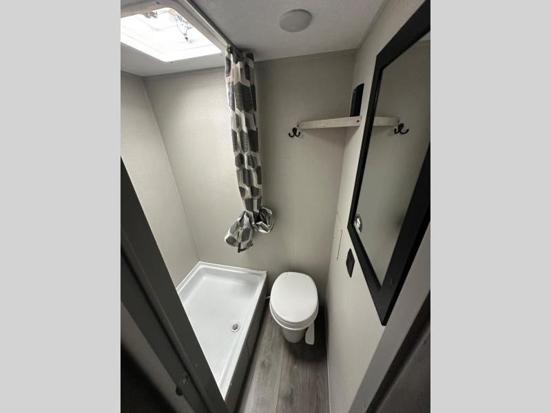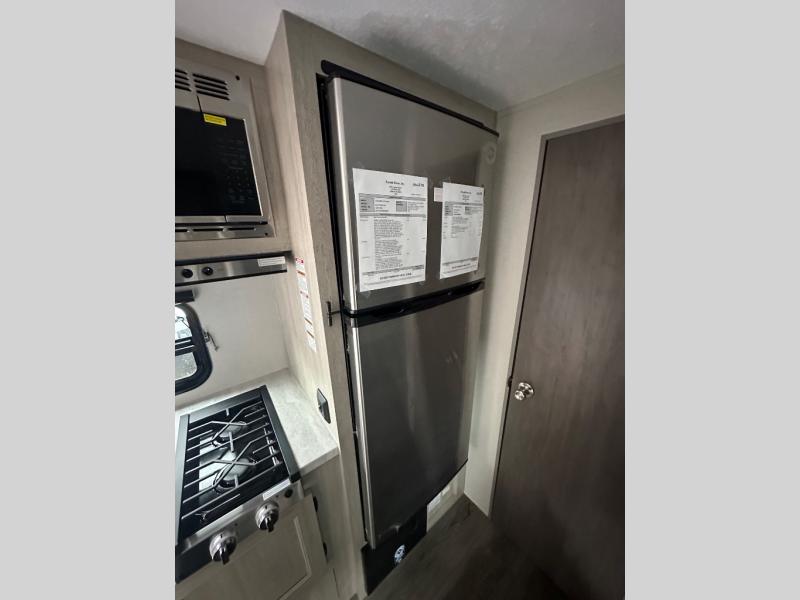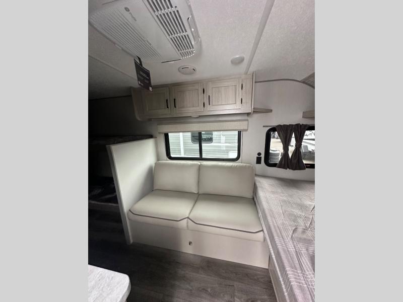 This travel trailers is perfect for a young family or smaller group. You can easily sleep four or more with the rear set of bunk beds and queen bed up front. There is also a 60" sofa for inside down-time, as well as complete kitchen and bath amenities so you can cook and stay clean while traveling. The rear corner bath features a toilet and 36" x 30" shower, and it's conveniently located next to the bunk beds which is great for little ones at night. Cooking inside will be easy with a GE stainless two-burner cooktop and single sink, plus there is also a GE microwave oven for snacks and things that you can easily warm up. If you plan to spend most of your time outdoors, you will find plenty of storage space in the front exterior storage compartment, and there is also plenty of storage inside as well.