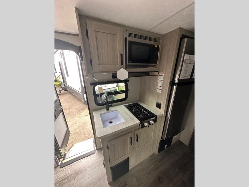 This travel trailers is perfect for a young family or smaller group. You can easily sleep four or more with the rear set of bunk beds and queen bed up front. There is also a 60" sofa for inside down-time, as well as complete kitchen and bath amenities so you can cook and stay clean while traveling. The rear corner bath features a toilet and 36" x 30" shower, and it's conveniently located next to the bunk beds which is great for little ones at night. Cooking inside will be easy with a GE stainless two-burner cooktop and single sink, plus there is also a GE microwave oven for snacks and things that you can easily warm up. If you plan to spend most of your time outdoors, you will find plenty of storage space in the front exterior storage compartment, and there is also plenty of storage inside as well.